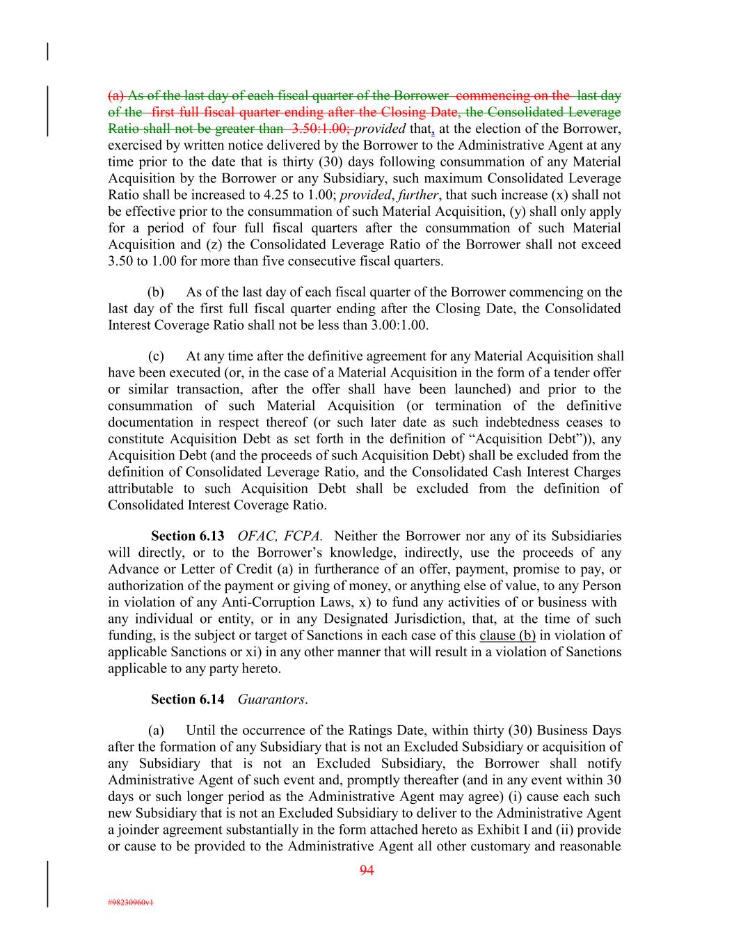 (a) As of the last day of each fiscal quarter of the Borrower commencing on the last day of the first full fiscal quarter ending after the Closing Date, the Consolidated Leverage Ratio shall not be greater than 3.50:1.00; provided that, at the election of the Borrower, exercised by written notice delivered by the Borrower to the Administrative Agent at any time prior to the date that is thirty (30) days following consummation of any Material Acquisition by the Borrower or any Subsidiary, such maximum Consolidated Leverage Ratio shall be increased to 4.25 to 1.00; provided, further, that such increase (x) shall not be effective prior to the consummation of such Material Acquisition, (y) shall only apply for a period of four full fiscal quarters after the consummation of such Material Acquisition and (z) the Consolidated Leverage Ratio of the Borrower shall not exceed 3.50 to 1.00 for more than five consecutive fiscal quarters. (b) As of the last day of each fiscal quarter of the Borrower commencing on the last day of the first full fiscal quarter ending after the Closing Date, the Consolidated Interest Coverage Ratio shall not be less than 3.00:1.00. (c) At any time after the definitive agreement for any Material Acquisition shall have been executed (or, in the case of a Material Acquisition in the form of a tender offer or similar transaction, after the offer shall have been launched) and prior to the consummation of such Material Acquisition (or termination of the definitive documentation in respect thereof (or such later date as such indebtedness ceases to constitute Acquisition Debt as set forth in the definition of “Acquisition Debt”)), any Acquisition Debt (and the proceeds of such Acquisition Debt) shall be excluded from the definition of Consolidated Leverage Ratio, and the Consolidated Cash Interest Charges attributable to such Acquisition Debt shall be excluded from the definition of Consolidated Interest Coverage Ratio. Section 6.13 OFAC, FCPA. Neither the Borrower nor any of its Subsidiaries will directly, or to the Borrower’s knowledge, indirectly, use the proceeds of any Advance or Letter of Credit (a) in furtherance of an offer, payment, promise to pay, or authorization of the payment or giving of money, or anything else of value, to any Person in violation of any Anti-Corruption Laws, x) to fund any activities of or business with any individual or entity, or in any Designated Jurisdiction, that, at the time of such funding, is the subject or target of Sanctions in each case of this clause (b) in violation of applicable Sanctions or xi) in any other manner that will result in a violation of Sanctions applicable to any party hereto. Section 6.14 Guarantors. (a) Until the occurrence of the Ratings Date, within thirty (30) Business Days after the formation of any Subsidiary that is not an Excluded Subsidiary or acquisition of any Subsidiary that is not an Excluded Subsidiary, the Borrower shall notify Administrative Agent of such event and, promptly thereafter (and in any event within 30 days or such longer period as the Administrative Agent may agree) (i) cause each such new Subsidiary that is not an Excluded Subsidiary to deliver to the Administrative Agent a joinder agreement substantially in the form attached hereto as Exhibit I and (ii) provide or cause to be provided to the Administrative Agent all other customary and reasonable 94 #98230960v1