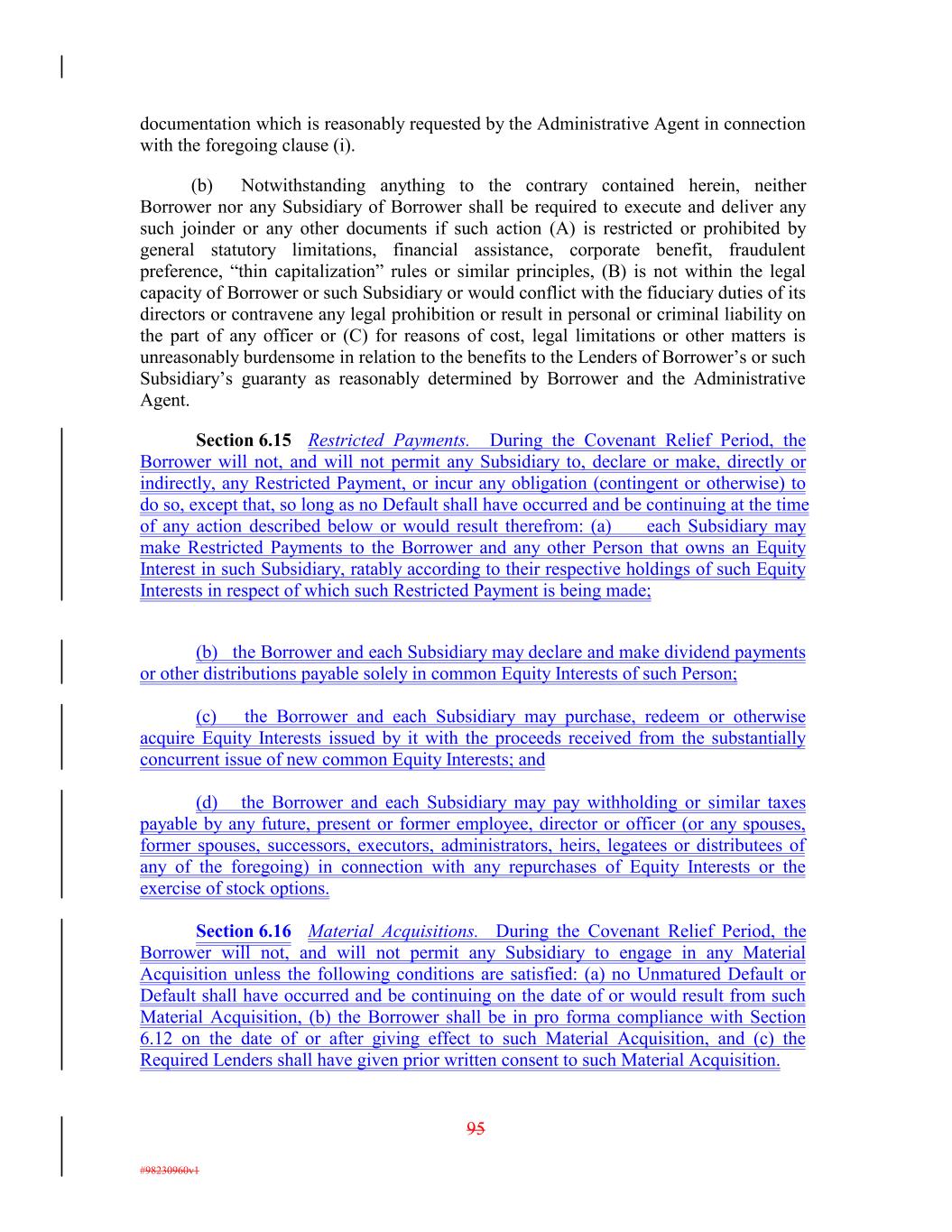 documentation which is reasonably requested by the Administrative Agent in connection with the foregoing clause (i). (b) Notwithstanding anything to the contrary contained herein, neither Borrower nor any Subsidiary of Borrower shall be required to execute and deliver any such joinder or any other documents if such action (A) is restricted or prohibited by general statutory limitations, financial assistance, corporate benefit, fraudulent preference, “thin capitalization” rules or similar principles, (B) is not within the legal capacity of Borrower or such Subsidiary or would conflict with the fiduciary duties of its directors or contravene any legal prohibition or result in personal or criminal liability on the part of any officer or (C) for reasons of cost, legal limitations or other matters is unreasonably burdensome in relation to the benefits to the Lenders of Borrower’s or such Subsidiary’s guaranty as reasonably determined by Borrower and the Administrative Agent. Section 6.15 Restricted Payments. During the Covenant Relief Period, the Borrower will not, and will not permit any Subsidiary to, declare or make, directly or indirectly, any Restricted Payment, or incur any obligation (contingent or otherwise) to do so, except that, so long as no Default shall have occurred and be continuing at the time of any action described below or would result therefrom: (a) each Subsidiary may make Restricted Payments to the Borrower and any other Person that owns an Equity Interest in such Subsidiary, ratably according to their respective holdings of such Equity Interests in respect of which such Restricted Payment is being made; (b) the Borrower and each Subsidiary may declare and make dividend payments or other distributions payable solely in common Equity Interests of such Person; (c) the Borrower and each Subsidiary may purchase, redeem or otherwise acquire Equity Interests issued by it with the proceeds received from the substantially concurrent issue of new common Equity Interests; and (d) the Borrower and each Subsidiary may pay withholding or similar taxes payable by any future, present or former employee, director or officer (or any spouses, former spouses, successors, executors, administrators, heirs, legatees or distributees of any of the foregoing) in connection with any repurchases of Equity Interests or the exercise of stock options. Section 6.16 Material Acquisitions. During the Covenant Relief Period, the Borrower will not, and will not permit any Subsidiary to engage in any Material Acquisition unless the following conditions are satisfied: (a) no Unmatured Default or Default shall have occurred and be continuing on the date of or would result from such Material Acquisition, (b) the Borrower shall be in pro forma compliance with Section 6.12 on the date of or after giving effect to such Material Acquisition, and (c) the Required Lenders shall have given prior written consent to such Material Acquisition. 95 #98230960v1