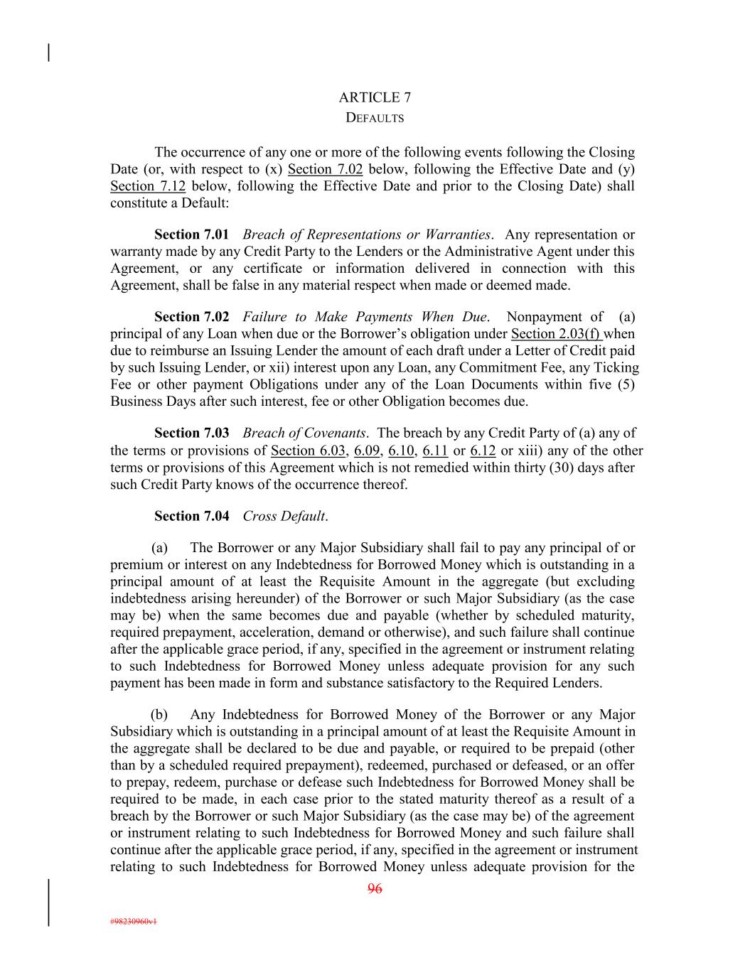 ARTICLE 7 DEFAULTS The occurrence of any one or more of the following events following the Closing Date (or, with respect to (x) Section 7.02 below, following the Effective Date and (y) Section 7.12 below, following the Effective Date and prior to the Closing Date) shall constitute a Default: Section 7.01 Breach of Representations or Warranties. Any representation or warranty made by any Credit Party to the Lenders or the Administrative Agent under this Agreement, or any certificate or information delivered in connection with this Agreement, shall be false in any material respect when made or deemed made. Section 7.02 Failure to Make Payments When Due. Nonpayment of (a) principal of any Loan when due or the Borrower’s obligation under Section 2.03(f) when due to reimburse an Issuing Lender the amount of each draft under a Letter of Credit paid by such Issuing Lender, or xii) interest upon any Loan, any Commitment Fee, any Ticking Fee or other payment Obligations under any of the Loan Documents within five (5) Business Days after such interest, fee or other Obligation becomes due. Section 7.03 Breach of Covenants. The breach by any Credit Party of (a) any of the terms or provisions of Section 6.03, 6.09, 6.10, 6.11 or 6.12 or xiii) any of the other terms or provisions of this Agreement which is not remedied within thirty (30) days after such Credit Party knows of the occurrence thereof. Section 7.04 Cross Default. (a) The Borrower or any Major Subsidiary shall fail to pay any principal of or premium or interest on any Indebtedness for Borrowed Money which is outstanding in a principal amount of at least the Requisite Amount in the aggregate (but excluding indebtedness arising hereunder) of the Borrower or such Major Subsidiary (as the case may be) when the same becomes due and payable (whether by scheduled maturity, required prepayment, acceleration, demand or otherwise), and such failure shall continue after the applicable grace period, if any, specified in the agreement or instrument relating to such Indebtedness for Borrowed Money unless adequate provision for any such payment has been made in form and substance satisfactory to the Required Lenders. (b) Any Indebtedness for Borrowed Money of the Borrower or any Major Subsidiary which is outstanding in a principal amount of at least the Requisite Amount in the aggregate shall be declared to be due and payable, or required to be prepaid (other than by a scheduled required prepayment), redeemed, purchased or defeased, or an offer to prepay, redeem, purchase or defease such Indebtedness for Borrowed Money shall be required to be made, in each case prior to the stated maturity thereof as a result of a breach by the Borrower or such Major Subsidiary (as the case may be) of the agreement or instrument relating to such Indebtedness for Borrowed Money and such failure shall continue after the applicable grace period, if any, specified in the agreement or instrument relating to such Indebtedness for Borrowed Money unless adequate provision for the 96 #98230960v1