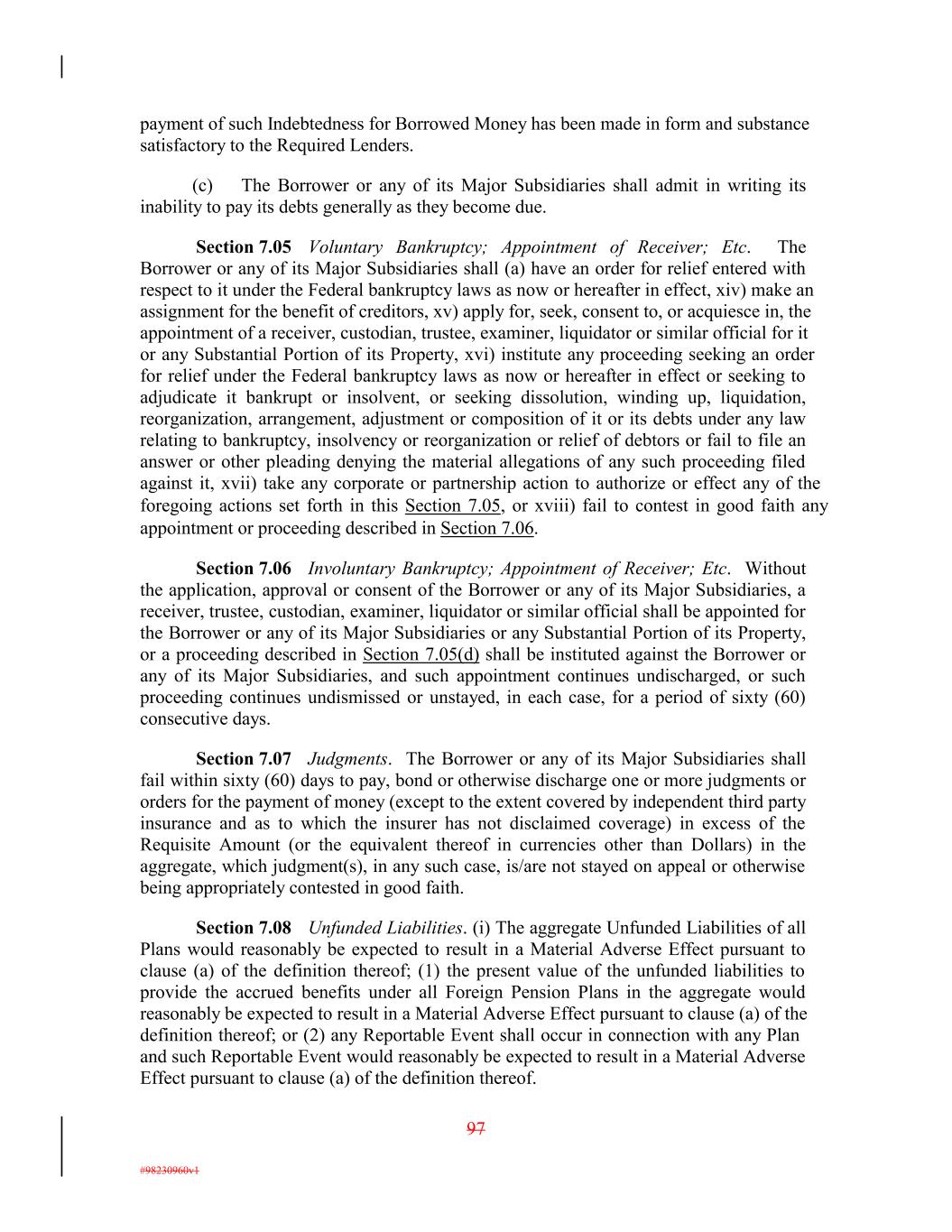 payment of such Indebtedness for Borrowed Money has been made in form and substance satisfactory to the Required Lenders. (c) The Borrower or any of its Major Subsidiaries shall admit in writing its inability to pay its debts generally as they become due. Section 7.05 Voluntary Bankruptcy; Appointment of Receiver; Etc. The Borrower or any of its Major Subsidiaries shall (a) have an order for relief entered with respect to it under the Federal bankruptcy laws as now or hereafter in effect, xiv) make an assignment for the benefit of creditors, xv) apply for, seek, consent to, or acquiesce in, the appointment of a receiver, custodian, trustee, examiner, liquidator or similar official for it or any Substantial Portion of its Property, xvi) institute any proceeding seeking an order for relief under the Federal bankruptcy laws as now or hereafter in effect or seeking to adjudicate it bankrupt or insolvent, or seeking dissolution, winding up, liquidation, reorganization, arrangement, adjustment or composition of it or its debts under any law relating to bankruptcy, insolvency or reorganization or relief of debtors or fail to file an answer or other pleading denying the material allegations of any such proceeding filed against it, xvii) take any corporate or partnership action to authorize or effect any of the foregoing actions set forth in this Section 7.05, or xviii) fail to contest in good faith any appointment or proceeding described in Section 7.06. Section 7.06 Involuntary Bankruptcy; Appointment of Receiver; Etc. Without the application, approval or consent of the Borrower or any of its Major Subsidiaries, a receiver, trustee, custodian, examiner, liquidator or similar official shall be appointed for the Borrower or any of its Major Subsidiaries or any Substantial Portion of its Property, or a proceeding described in Section 7.05(d) shall be instituted against the Borrower or any of its Major Subsidiaries, and such appointment continues undischarged, or such proceeding continues undismissed or unstayed, in each case, for a period of sixty (60) consecutive days. Section 7.07 Judgments. The Borrower or any of its Major Subsidiaries shall fail within sixty (60) days to pay, bond or otherwise discharge one or more judgments or orders for the payment of money (except to the extent covered by independent third party insurance and as to which the insurer has not disclaimed coverage) in excess of the Requisite Amount (or the equivalent thereof in currencies other than Dollars) in the aggregate, which judgment(s), in any such case, is/are not stayed on appeal or otherwise being appropriately contested in good faith. Section 7.08 Unfunded Liabilities. (i) The aggregate Unfunded Liabilities of all Plans would reasonably be expected to result in a Material Adverse Effect pursuant to clause (a) of the definition thereof; (1) the present value of the unfunded liabilities to provide the accrued benefits under all Foreign Pension Plans in the aggregate would reasonably be expected to result in a Material Adverse Effect pursuant to clause (a) of the definition thereof; or (2) any Reportable Event shall occur in connection with any Plan and such Reportable Event would reasonably be expected to result in a Material Adverse Effect pursuant to clause (a) of the definition thereof. 97 #98230960v1