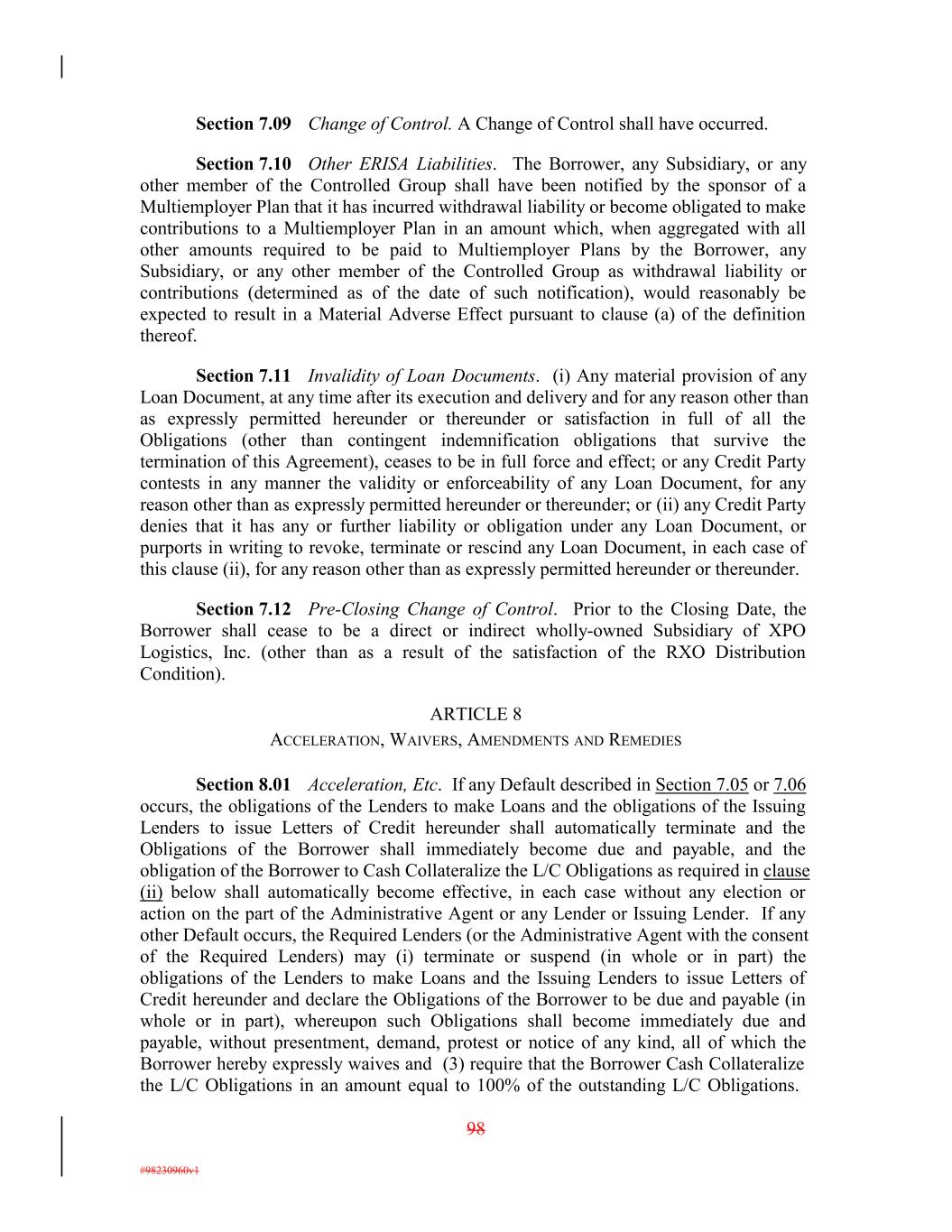 Section 7.09 Change of Control. A Change of Control shall have occurred. Section 7.10 Other ERISA Liabilities. The Borrower, any Subsidiary, or any other member of the Controlled Group shall have been notified by the sponsor of a Multiemployer Plan that it has incurred withdrawal liability or become obligated to make contributions to a Multiemployer Plan in an amount which, when aggregated with all other amounts required to be paid to Multiemployer Plans by the Borrower, any Subsidiary, or any other member of the Controlled Group as withdrawal liability or contributions (determined as of the date of such notification), would reasonably be expected to result in a Material Adverse Effect pursuant to clause (a) of the definition thereof. Section 7.11 Invalidity of Loan Documents. (i) Any material provision of any Loan Document, at any time after its execution and delivery and for any reason other than as expressly permitted hereunder or thereunder or satisfaction in full of all the Obligations (other than contingent indemnification obligations that survive the termination of this Agreement), ceases to be in full force and effect; or any Credit Party contests in any manner the validity or enforceability of any Loan Document, for any reason other than as expressly permitted hereunder or thereunder; or (ii) any Credit Party denies that it has any or further liability or obligation under any Loan Document, or purports in writing to revoke, terminate or rescind any Loan Document, in each case of this clause (ii), for any reason other than as expressly permitted hereunder or thereunder. Section 7.12 Pre-Closing Change of Control. Prior to the Closing Date, the Borrower shall cease to be a direct or indirect wholly-owned Subsidiary of XPO Logistics, Inc. (other than as a result of the satisfaction of the RXO Distribution Condition). ARTICLE 8 ACCELERATION, WAIVERS, AMENDMENTS AND REMEDIES Section 8.01 Acceleration, Etc. If any Default described in Section 7.05 or 7.06 occurs, the obligations of the Lenders to make Loans and the obligations of the Issuing Lenders to issue Letters of Credit hereunder shall automatically terminate and the Obligations of the Borrower shall immediately become due and payable, and the obligation of the Borrower to Cash Collateralize the L/C Obligations as required in clause (ii) below shall automatically become effective, in each case without any election or action on the part of the Administrative Agent or any Lender or Issuing Lender. If any other Default occurs, the Required Lenders (or the Administrative Agent with the consent of the Required Lenders) may (i) terminate or suspend (in whole or in part) the obligations of the Lenders to make Loans and the Issuing Lenders to issue Letters of Credit hereunder and declare the Obligations of the Borrower to be due and payable (in whole or in part), whereupon such Obligations shall become immediately due and payable, without presentment, demand, protest or notice of any kind, all of which the Borrower hereby expressly waives and (3) require that the Borrower Cash Collateralize the L/C Obligations in an amount equal to 100% of the outstanding L/C Obligations. 98 #98230960v1