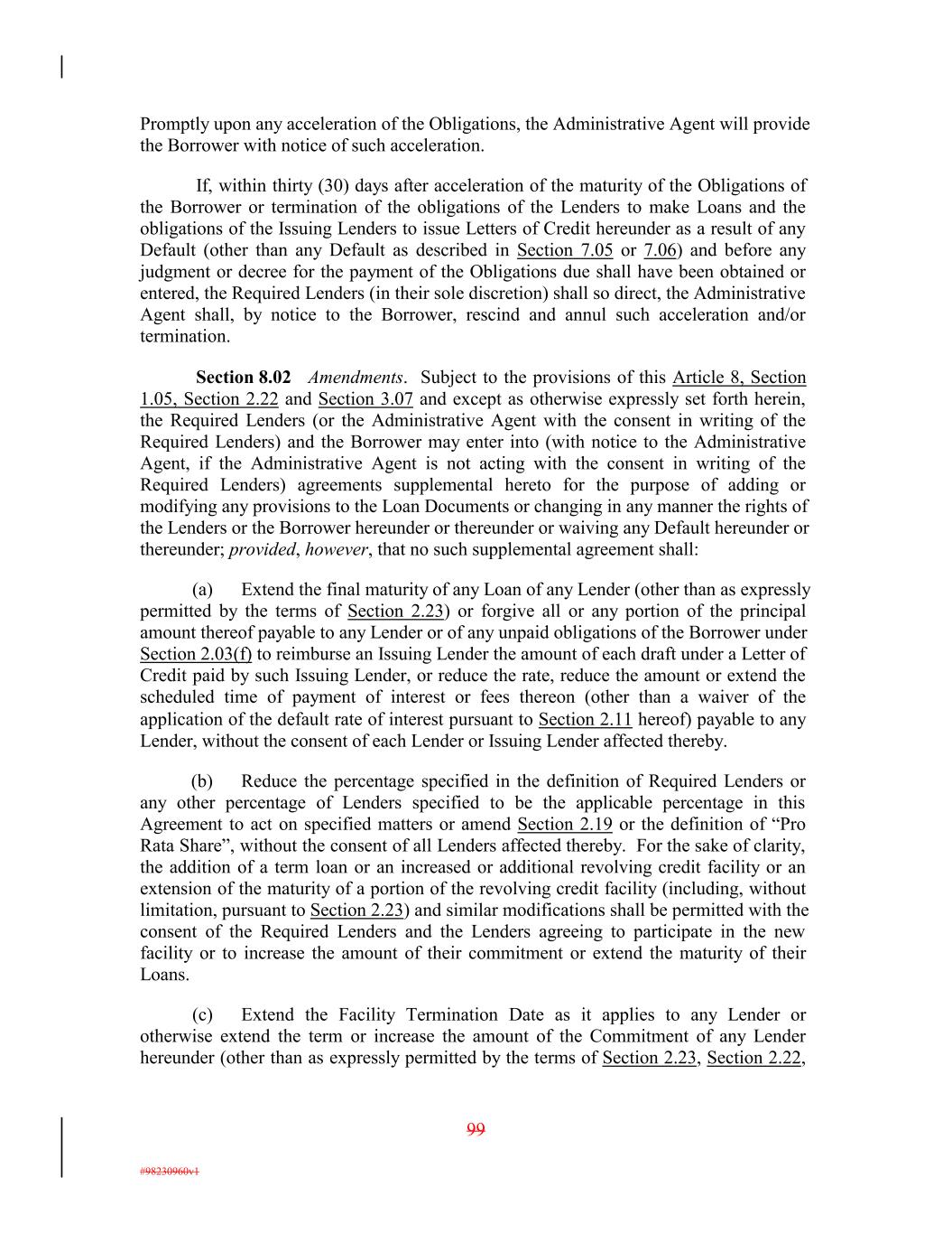 Promptly upon any acceleration of the Obligations, the Administrative Agent will provide the Borrower with notice of such acceleration. If, within thirty (30) days after acceleration of the maturity of the Obligations of the Borrower or termination of the obligations of the Lenders to make Loans and the obligations of the Issuing Lenders to issue Letters of Credit hereunder as a result of any Default (other than any Default as described in Section 7.05 or 7.06) and before any judgment or decree for the payment of the Obligations due shall have been obtained or entered, the Required Lenders (in their sole discretion) shall so direct, the Administrative Agent shall, by notice to the Borrower, rescind and annul such acceleration and/or termination. Section 8.02 Amendments. Subject to the provisions of this Article 8, Section 1.05, Section 2.22 and Section 3.07 and except as otherwise expressly set forth herein, the Required Lenders (or the Administrative Agent with the consent in writing of the Required Lenders) and the Borrower may enter into (with notice to the Administrative Agent, if the Administrative Agent is not acting with the consent in writing of the Required Lenders) agreements supplemental hereto for the purpose of adding or modifying any provisions to the Loan Documents or changing in any manner the rights of the Lenders or the Borrower hereunder or thereunder or waiving any Default hereunder or thereunder; provided, however, that no such supplemental agreement shall: (a) Extend the final maturity of any Loan of any Lender (other than as expressly permitted by the terms of Section 2.23) or forgive all or any portion of the principal amount thereof payable to any Lender or of any unpaid obligations of the Borrower under Section 2.03(f) to reimburse an Issuing Lender the amount of each draft under a Letter of Credit paid by such Issuing Lender, or reduce the rate, reduce the amount or extend the scheduled time of payment of interest or fees thereon (other than a waiver of the application of the default rate of interest pursuant to Section 2.11 hereof) payable to any Lender, without the consent of each Lender or Issuing Lender affected thereby. (b) Reduce the percentage specified in the definition of Required Lenders or any other percentage of Lenders specified to be the applicable percentage in this Agreement to act on specified matters or amend Section 2.19 or the definition of “Pro Rata Share”, without the consent of all Lenders affected thereby. For the sake of clarity, the addition of a term loan or an increased or additional revolving credit facility or an extension of the maturity of a portion of the revolving credit facility (including, without limitation, pursuant to Section 2.23) and similar modifications shall be permitted with the consent of the Required Lenders and the Lenders agreeing to participate in the new facility or to increase the amount of their commitment or extend the maturity of their Loans. (c) Extend the Facility Termination Date as it applies to any Lender or otherwise extend the term or increase the amount of the Commitment of any Lender hereunder (other than as expressly permitted by the terms of Section 2.23, Section 2.22, 99 #98230960v1