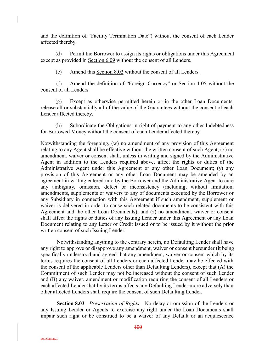 and the definition of “Facility Termination Date”) without the consent of each Lender affected thereby. (d) Permit the Borrower to assign its rights or obligations under this Agreement except as provided in Section 6.09 without the consent of all Lenders. (e) Amend this Section 8.02 without the consent of all Lenders. (f) Amend the definition of “Foreign Currency” or Section 1.05 without the consent of all Lenders. (g) Except as otherwise permitted herein or in the other Loan Documents, release all or substantially all of the value of the Guarantees without the consent of each Lender affected thereby. (h) Subordinate the Obligations in right of payment to any other Indebtedness for Borrowed Money without the consent of each Lender affected thereby. Notwithstanding the foregoing, (w) no amendment of any provision of this Agreement relating to any Agent shall be effective without the written consent of such Agent; (x) no amendment, waiver or consent shall, unless in writing and signed by the Administrative Agent in addition to the Lenders required above, affect the rights or duties of the Administrative Agent under this Agreement or any other Loan Document; (y) any provision of this Agreement or any other Loan Document may be amended by an agreement in writing entered into by the Borrower and the Administrative Agent to cure any ambiguity, omission, defect or inconsistency (including, without limitation, amendments, supplements or waivers to any of documents executed by the Borrower or any Subsidiary in connection with this Agreement if such amendment, supplement or waiver is delivered in order to cause such related documents to be consistent with this Agreement and the other Loan Documents); and (z) no amendment, waiver or consent shall affect the rights or duties of any Issuing Lender under this Agreement or any Loan Document relating to any Letter of Credit issued or to be issued by it without the prior written consent of such Issuing Lender. Notwithstanding anything to the contrary herein, no Defaulting Lender shall have any right to approve or disapprove any amendment, waiver or consent hereunder (it being specifically understood and agreed that any amendment, waiver or consent which by its terms requires the consent of all Lenders or each affected Lender may be effected with the consent of the applicable Lenders other than Defaulting Lenders), except that (A) the Commitment of such Lender may not be increased without the consent of such Lender and (B) any waiver, amendment or modification requiring the consent of all Lenders or each affected Lender that by its terms affects any Defaulting Lender more adversely than other affected Lenders shall require the consent of such Defaulting Lender. Section 8.03 Preservation of Rights. No delay or omission of the Lenders or any Issuing Lender or Agents to exercise any right under the Loan Documents shall impair such right or be construed to be a waiver of any Default or an acquiescence 100 #98230960v1
