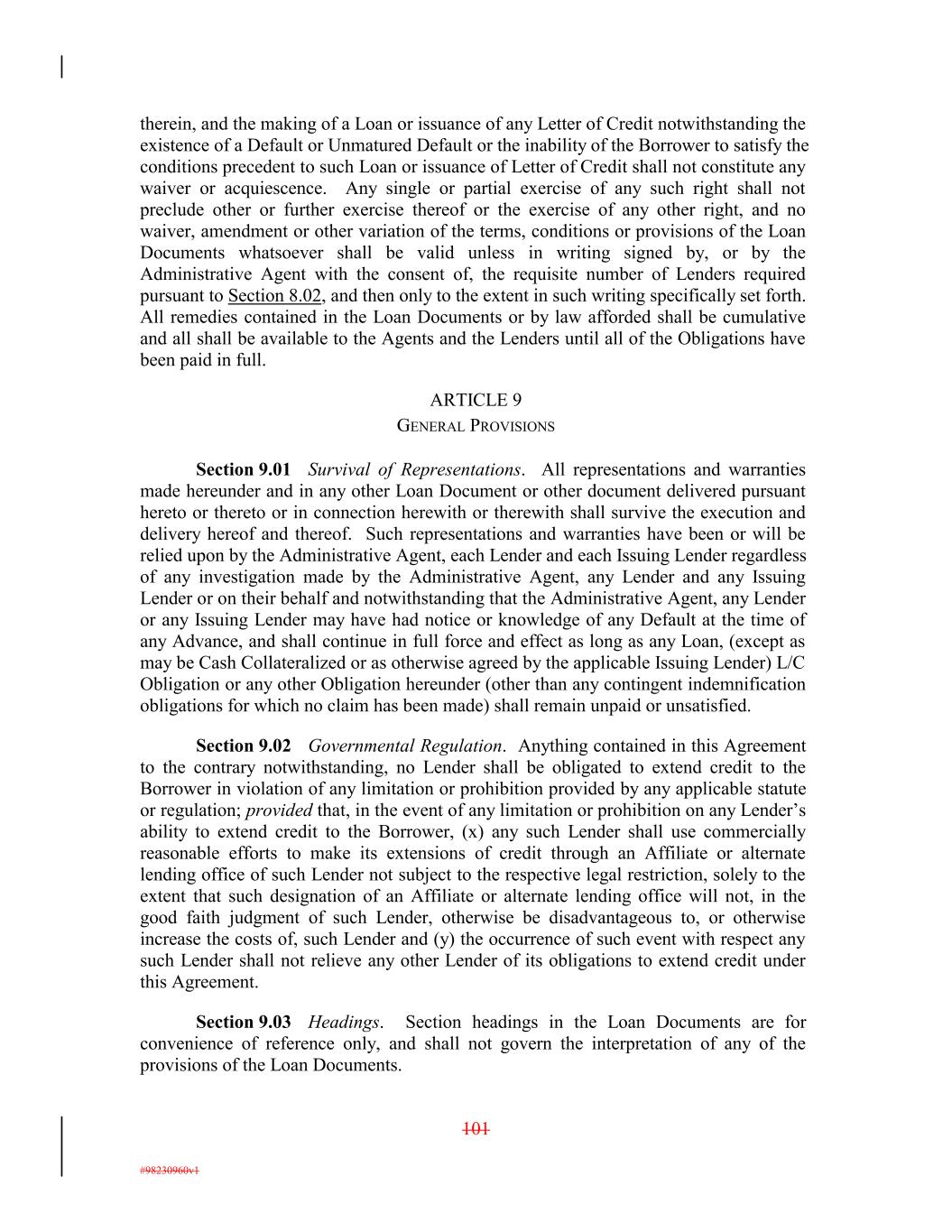 therein, and the making of a Loan or issuance of any Letter of Credit notwithstanding the existence of a Default or Unmatured Default or the inability of the Borrower to satisfy the conditions precedent to such Loan or issuance of Letter of Credit shall not constitute any waiver or acquiescence. Any single or partial exercise of any such right shall not preclude other or further exercise thereof or the exercise of any other right, and no waiver, amendment or other variation of the terms, conditions or provisions of the Loan Documents whatsoever shall be valid unless in writing signed by, or by the Administrative Agent with the consent of, the requisite number of Lenders required pursuant to Section 8.02, and then only to the extent in such writing specifically set forth. All remedies contained in the Loan Documents or by law afforded shall be cumulative and all shall be available to the Agents and the Lenders until all of the Obligations have been paid in full. ARTICLE 9 GENERAL PROVISIONS Section 9.01 Survival of Representations. All representations and warranties made hereunder and in any other Loan Document or other document delivered pursuant hereto or thereto or in connection herewith or therewith shall survive the execution and delivery hereof and thereof. Such representations and warranties have been or will be relied upon by the Administrative Agent, each Lender and each Issuing Lender regardless of any investigation made by the Administrative Agent, any Lender and any Issuing Lender or on their behalf and notwithstanding that the Administrative Agent, any Lender or any Issuing Lender may have had notice or knowledge of any Default at the time of any Advance, and shall continue in full force and effect as long as any Loan, (except as may be Cash Collateralized or as otherwise agreed by the applicable Issuing Lender) L/C Obligation or any other Obligation hereunder (other than any contingent indemnification obligations for which no claim has been made) shall remain unpaid or unsatisfied. Section 9.02 Governmental Regulation. Anything contained in this Agreement to the contrary notwithstanding, no Lender shall be obligated to extend credit to the Borrower in violation of any limitation or prohibition provided by any applicable statute or regulation; provided that, in the event of any limitation or prohibition on any Lender’s ability to extend credit to the Borrower, (x) any such Lender shall use commercially reasonable efforts to make its extensions of credit through an Affiliate or alternate lending office of such Lender not subject to the respective legal restriction, solely to the extent that such designation of an Affiliate or alternate lending office will not, in the good faith judgment of such Lender, otherwise be disadvantageous to, or otherwise increase the costs of, such Lender and (y) the occurrence of such event with respect any such Lender shall not relieve any other Lender of its obligations to extend credit under this Agreement. Section 9.03 Headings. Section headings in the Loan Documents are for convenience of reference only, and shall not govern the interpretation of any of the provisions of the Loan Documents. 101 #98230960v1