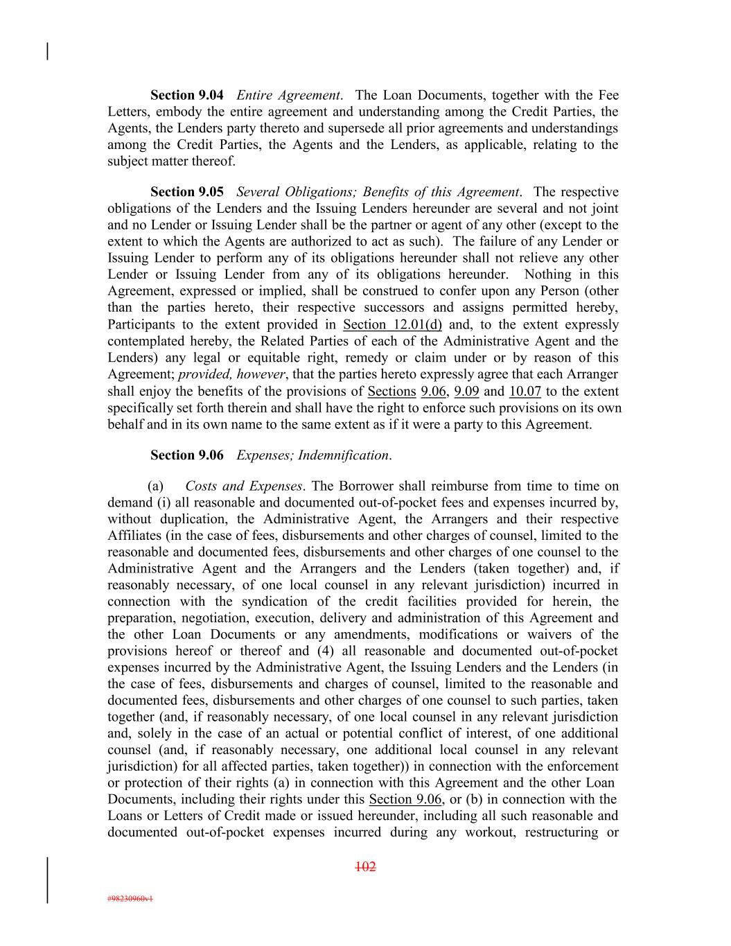 Section 9.04 Entire Agreement. The Loan Documents, together with the Fee Letters, embody the entire agreement and understanding among the Credit Parties, the Agents, the Lenders party thereto and supersede all prior agreements and understandings among the Credit Parties, the Agents and the Lenders, as applicable, relating to the subject matter thereof. Section 9.05 Several Obligations; Benefits of this Agreement. The respective obligations of the Lenders and the Issuing Lenders hereunder are several and not joint and no Lender or Issuing Lender shall be the partner or agent of any other (except to the extent to which the Agents are authorized to act as such). The failure of any Lender or Issuing Lender to perform any of its obligations hereunder shall not relieve any other Lender or Issuing Lender from any of its obligations hereunder. Nothing in this Agreement, expressed or implied, shall be construed to confer upon any Person (other than the parties hereto, their respective successors and assigns permitted hereby, Participants to the extent provided in Section 12.01(d) and, to the extent expressly contemplated hereby, the Related Parties of each of the Administrative Agent and the Lenders) any legal or equitable right, remedy or claim under or by reason of this Agreement; provided, however, that the parties hereto expressly agree that each Arranger shall enjoy the benefits of the provisions of Sections 9.06, 9.09 and 10.07 to the extent specifically set forth therein and shall have the right to enforce such provisions on its own behalf and in its own name to the same extent as if it were a party to this Agreement. Section 9.06 Expenses; Indemnification. (a) Costs and Expenses. The Borrower shall reimburse from time to time on demand (i) all reasonable and documented out-of-pocket fees and expenses incurred by, without duplication, the Administrative Agent, the Arrangers and their respective Affiliates (in the case of fees, disbursements and other charges of counsel, limited to the reasonable and documented fees, disbursements and other charges of one counsel to the Administrative Agent and the Arrangers and the Lenders (taken together) and, if reasonably necessary, of one local counsel in any relevant jurisdiction) incurred in connection with the syndication of the credit facilities provided for herein, the preparation, negotiation, execution, delivery and administration of this Agreement and the other Loan Documents or any amendments, modifications or waivers of the provisions hereof or thereof and (4) all reasonable and documented out-of-pocket expenses incurred by the Administrative Agent, the Issuing Lenders and the Lenders (in the case of fees, disbursements and charges of counsel, limited to the reasonable and documented fees, disbursements and other charges of one counsel to such parties, taken together (and, if reasonably necessary, of one local counsel in any relevant jurisdiction and, solely in the case of an actual or potential conflict of interest, of one additional counsel (and, if reasonably necessary, one additional local counsel in any relevant jurisdiction) for all affected parties, taken together)) in connection with the enforcement or protection of their rights (a) in connection with this Agreement and the other Loan Documents, including their rights under this Section 9.06, or (b) in connection with the Loans or Letters of Credit made or issued hereunder, including all such reasonable and documented out-of-pocket expenses incurred during any workout, restructuring or 102 #98230960v1