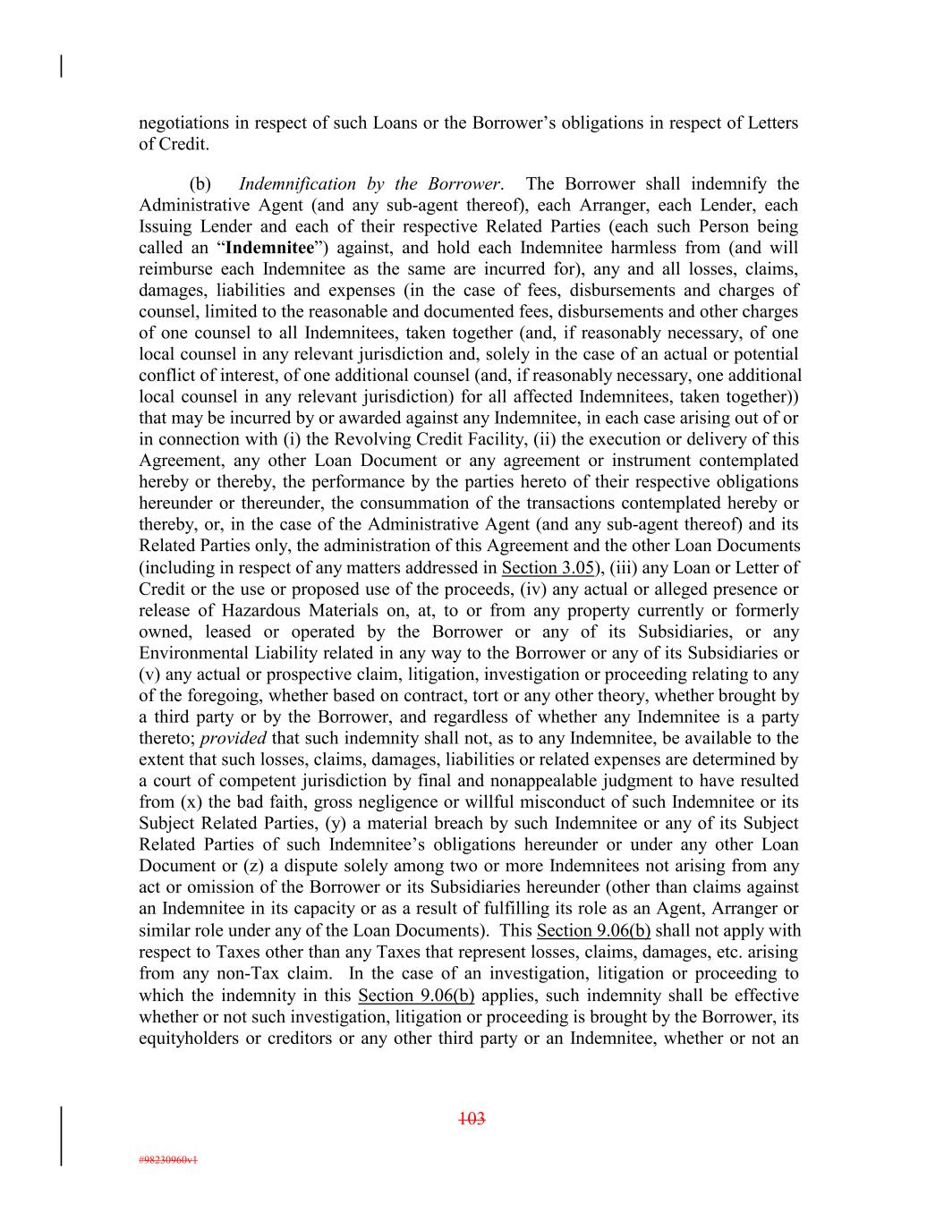 negotiations in respect of such Loans or the Borrower’s obligations in respect of Letters of Credit. (b) Indemnification by the Borrower. The Borrower shall indemnify the Administrative Agent (and any sub-agent thereof), each Arranger, each Lender, each Issuing Lender and each of their respective Related Parties (each such Person being called an “Indemnitee”) against, and hold each Indemnitee harmless from (and will reimburse each Indemnitee as the same are incurred for), any and all losses, claims, damages, liabilities and expenses (in the case of fees, disbursements and charges of counsel, limited to the reasonable and documented fees, disbursements and other charges of one counsel to all Indemnitees, taken together (and, if reasonably necessary, of one local counsel in any relevant jurisdiction and, solely in the case of an actual or potential conflict of interest, of one additional counsel (and, if reasonably necessary, one additional local counsel in any relevant jurisdiction) for all affected Indemnitees, taken together)) that may be incurred by or awarded against any Indemnitee, in each case arising out of or in connection with (i) the Revolving Credit Facility, (ii) the execution or delivery of this Agreement, any other Loan Document or any agreement or instrument contemplated hereby or thereby, the performance by the parties hereto of their respective obligations hereunder or thereunder, the consummation of the transactions contemplated hereby or thereby, or, in the case of the Administrative Agent (and any sub-agent thereof) and its Related Parties only, the administration of this Agreement and the other Loan Documents (including in respect of any matters addressed in Section 3.05), (iii) any Loan or Letter of Credit or the use or proposed use of the proceeds, (iv) any actual or alleged presence or release of Hazardous Materials on, at, to or from any property currently or formerly owned, leased or operated by the Borrower or any of its Subsidiaries, or any Environmental Liability related in any way to the Borrower or any of its Subsidiaries or (v) any actual or prospective claim, litigation, investigation or proceeding relating to any of the foregoing, whether based on contract, tort or any other theory, whether brought by a third party or by the Borrower, and regardless of whether any Indemnitee is a party thereto; provided that such indemnity shall not, as to any Indemnitee, be available to the extent that such losses, claims, damages, liabilities or related expenses are determined by a court of competent jurisdiction by final and nonappealable judgment to have resulted from (x) the bad faith, gross negligence or willful misconduct of such Indemnitee or its Subject Related Parties, (y) a material breach by such Indemnitee or any of its Subject Related Parties of such Indemnitee’s obligations hereunder or under any other Loan Document or (z) a dispute solely among two or more Indemnitees not arising from any act or omission of the Borrower or its Subsidiaries hereunder (other than claims against an Indemnitee in its capacity or as a result of fulfilling its role as an Agent, Arranger or similar role under any of the Loan Documents). This Section 9.06(b) shall not apply with respect to Taxes other than any Taxes that represent losses, claims, damages, etc. arising from any non-Tax claim. In the case of an investigation, litigation or proceeding to which the indemnity in this Section 9.06(b) applies, such indemnity shall be effective whether or not such investigation, litigation or proceeding is brought by the Borrower, its equityholders or creditors or any other third party or an Indemnitee, whether or not an 103 #98230960v1