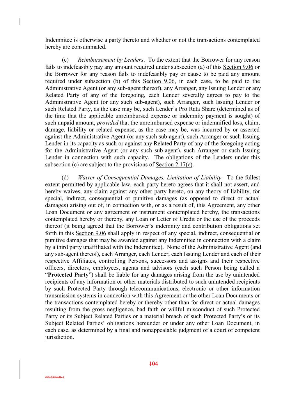 Indemnitee is otherwise a party thereto and whether or not the transactions contemplated hereby are consummated. (c) Reimbursement by Lenders. To the extent that the Borrower for any reason fails to indefeasibly pay any amount required under subsection (a) of this Section 9.06 or the Borrower for any reason fails to indefeasibly pay or cause to be paid any amount required under subsection (b) of this Section 9.06, in each case, to be paid to the Administrative Agent (or any sub-agent thereof), any Arranger, any Issuing Lender or any Related Party of any of the foregoing, each Lender severally agrees to pay to the Administrative Agent (or any such sub-agent), such Arranger, such Issuing Lender or such Related Party, as the case may be, such Lender’s Pro Rata Share (determined as of the time that the applicable unreimbursed expense or indemnity payment is sought) of such unpaid amount, provided that the unreimbursed expense or indemnified loss, claim, damage, liability or related expense, as the case may be, was incurred by or asserted against the Administrative Agent (or any such sub-agent), such Arranger or such Issuing Lender in its capacity as such or against any Related Party of any of the foregoing acting for the Administrative Agent (or any such sub-agent), such Arranger or such Issuing Lender in connection with such capacity. The obligations of the Lenders under this subsection (c) are subject to the provisions of Section 2.17(c). (d) Waiver of Consequential Damages, Limitation of Liability. To the fullest extent permitted by applicable law, each party hereto agrees that it shall not assert, and hereby waives, any claim against any other party hereto, on any theory of liability, for special, indirect, consequential or punitive damages (as opposed to direct or actual damages) arising out of, in connection with, or as a result of, this Agreement, any other Loan Document or any agreement or instrument contemplated hereby, the transactions contemplated hereby or thereby, any Loan or Letter of Credit or the use of the proceeds thereof (it being agreed that the Borrower’s indemnity and contribution obligations set forth in this Section 9.06 shall apply in respect of any special, indirect, consequential or punitive damages that may be awarded against any Indemnitee in connection with a claim by a third party unaffiliated with the Indemnitee). None of the Administrative Agent (and any sub-agent thereof), each Arranger, each Lender, each Issuing Lender and each of their respective Affiliates, controlling Persons, successors and assigns and their respective officers, directors, employees, agents and advisors (each such Person being called a “Protected Party”) shall be liable for any damages arising from the use by unintended recipients of any information or other materials distributed to such unintended recipients by such Protected Party through telecommunications, electronic or other information transmission systems in connection with this Agreement or the other Loan Documents or the transactions contemplated hereby or thereby other than for direct or actual damages resulting from the gross negligence, bad faith or willful misconduct of such Protected Party or its Subject Related Parties or a material breach of such Protected Party’s or its Subject Related Parties’ obligations hereunder or under any other Loan Document, in each case, as determined by a final and nonappealable judgment of a court of competent jurisdiction. 104 #98230960v1