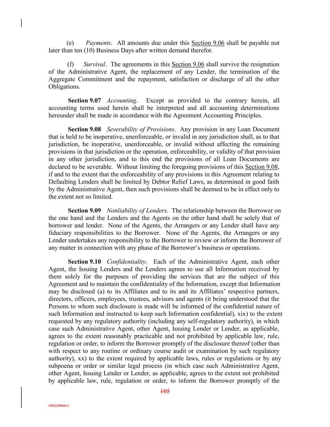 (e) Payments. All amounts due under this Section 9.06 shall be payable not later than ten (10) Business Days after written demand therefor. (f) Survival. The agreements in this Section 9.06 shall survive the resignation of the Administrative Agent, the replacement of any Lender, the termination of the Aggregate Commitment and the repayment, satisfaction or discharge of all the other Obligations. Section 9.07 Accounting. Except as provided to the contrary herein, all accounting terms used herein shall be interpreted and all accounting determinations hereunder shall be made in accordance with the Agreement Accounting Principles. Section 9.08 Severability of Provisions. Any provision in any Loan Document that is held to be inoperative, unenforceable, or invalid in any jurisdiction shall, as to that jurisdiction, be inoperative, unenforceable, or invalid without affecting the remaining provisions in that jurisdiction or the operation, enforceability, or validity of that provision in any other jurisdiction, and to this end the provisions of all Loan Documents are declared to be severable. Without limiting the foregoing provisions of this Section 9.08, if and to the extent that the enforceability of any provisions in this Agreement relating to Defaulting Lenders shall be limited by Debtor Relief Laws, as determined in good faith by the Administrative Agent, then such provisions shall be deemed to be in effect only to the extent not so limited. Section 9.09 Nonliability of Lenders. The relationship between the Borrower on the one hand and the Lenders and the Agents on the other hand shall be solely that of borrower and lender. None of the Agents, the Arrangers or any Lender shall have any fiduciary responsibilities to the Borrower. None of the Agents, the Arrangers or any Lender undertakes any responsibility to the Borrower to review or inform the Borrower of any matter in connection with any phase of the Borrower’s business or operations. Section 9.10 Confidentiality. Each of the Administrative Agent, each other Agent, the Issuing Lenders and the Lenders agrees to use all Information received by them solely for the purposes of providing the services that are the subject of this Agreement and to maintain the confidentiality of the Information, except that Information may be disclosed (a) to its Affiliates and to its and its Affiliates’ respective partners, directors, officers, employees, trustees, advisors and agents (it being understood that the Persons to whom such disclosure is made will be informed of the confidential nature of such Information and instructed to keep such Information confidential), xix) to the extent requested by any regulatory authority (including any self-regulatory authority), in which case such Administrative Agent, other Agent, Issuing Lender or Lender, as applicable, agrees to the extent reasonably practicable and not prohibited by applicable law, rule, regulation or order, to inform the Borrower promptly of the disclosure thereof (other than with respect to any routine or ordinary course audit or examination by such regulatory authority), xx) to the extent required by applicable laws, rules or regulations or by any subpoena or order or similar legal process (in which case such Administrative Agent, other Agent, Issuing Lender or Lender, as applicable, agrees to the extent not prohibited by applicable law, rule, regulation or order, to inform the Borrower promptly of the 105 #98230960v1