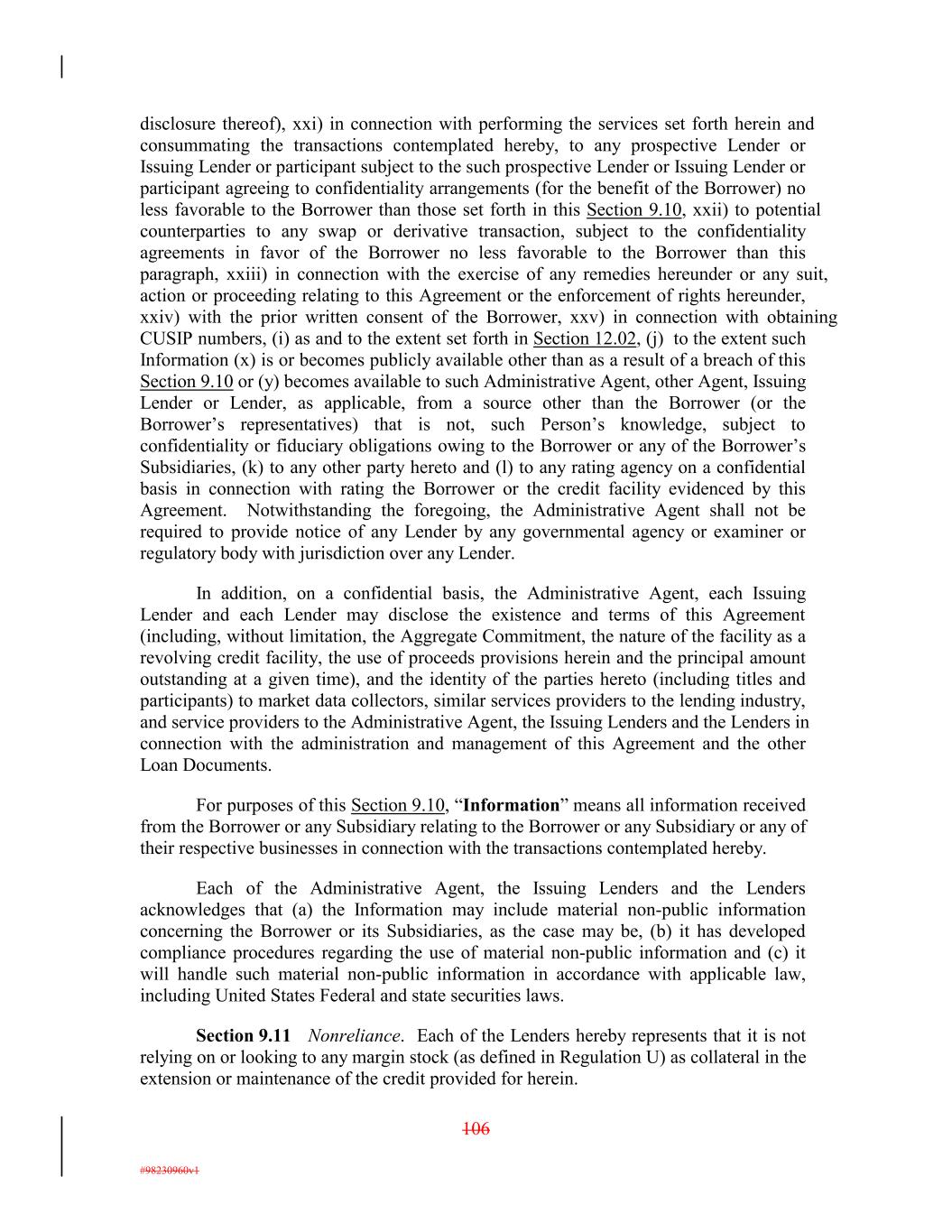 disclosure thereof), xxi) in connection with performing the services set forth herein and consummating the transactions contemplated hereby, to any prospective Lender or Issuing Lender or participant subject to the such prospective Lender or Issuing Lender or participant agreeing to confidentiality arrangements (for the benefit of the Borrower) no less favorable to the Borrower than those set forth in this Section 9.10, xxii) to potential counterparties to any swap or derivative transaction, subject to the confidentiality agreements in favor of the Borrower no less favorable to the Borrower than this paragraph, xxiii) in connection with the exercise of any remedies hereunder or any suit, action or proceeding relating to this Agreement or the enforcement of rights hereunder, xxiv) with the prior written consent of the Borrower, xxv) in connection with obtaining CUSIP numbers, (i) as and to the extent set forth in Section 12.02, (j) to the extent such Information (x) is or becomes publicly available other than as a result of a breach of this Section 9.10 or (y) becomes available to such Administrative Agent, other Agent, Issuing Lender or Lender, as applicable, from a source other than the Borrower (or the Borrower’s representatives) that is not, such Person’s knowledge, subject to confidentiality or fiduciary obligations owing to the Borrower or any of the Borrower’s Subsidiaries, (k) to any other party hereto and (l) to any rating agency on a confidential basis in connection with rating the Borrower or the credit facility evidenced by this Agreement. Notwithstanding the foregoing, the Administrative Agent shall not be required to provide notice of any Lender by any governmental agency or examiner or regulatory body with jurisdiction over any Lender. In addition, on a confidential basis, the Administrative Agent, each Issuing Lender and each Lender may disclose the existence and terms of this Agreement (including, without limitation, the Aggregate Commitment, the nature of the facility as a revolving credit facility, the use of proceeds provisions herein and the principal amount outstanding at a given time), and the identity of the parties hereto (including titles and participants) to market data collectors, similar services providers to the lending industry, and service providers to the Administrative Agent, the Issuing Lenders and the Lenders in connection with the administration and management of this Agreement and the other Loan Documents. For purposes of this Section 9.10, “Information” means all information received from the Borrower or any Subsidiary relating to the Borrower or any Subsidiary or any of their respective businesses in connection with the transactions contemplated hereby. Each of the Administrative Agent, the Issuing Lenders and the Lenders acknowledges that (a) the Information may include material non-public information concerning the Borrower or its Subsidiaries, as the case may be, (b) it has developed compliance procedures regarding the use of material non-public information and (c) it will handle such material non-public information in accordance with applicable law, including United States Federal and state securities laws. Section 9.11 Nonreliance. Each of the Lenders hereby represents that it is not relying on or looking to any margin stock (as defined in Regulation U) as collateral in the extension or maintenance of the credit provided for herein. 106 #98230960v1