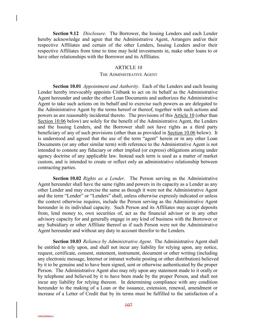 Section 9.12 Disclosure. The Borrower, the Issuing Lenders and each Lender hereby acknowledge and agree that the Administrative Agent, Arrangers and/or their respective Affiliates and certain of the other Lenders, Issuing Lenders and/or their respective Affiliates from time to time may hold investments in, make other loans to or have other relationships with the Borrower and its Affiliates. ARTICLE 10 THE ADMINISTRATIVE AGENT Section 10.01 Appointment and Authority. Each of the Lenders and each Issuing Lender hereby irrevocably appoints Citibank to act on its behalf as the Administrative Agent hereunder and under the other Loan Documents and authorizes the Administrative Agent to take such actions on its behalf and to exercise such powers as are delegated to the Administrative Agent by the terms hereof or thereof, together with such actions and powers as are reasonably incidental thereto. The provisions of this Article 10 (other than Section 10.06 below) are solely for the benefit of the Administrative Agent, the Lenders and the Issuing Lenders, and the Borrower shall not have rights as a third party beneficiary of any of such provisions (other than as provided in Section 10.06 below). It is understood and agreed that the use of the term “agent” herein or in any other Loan Documents (or any other similar term) with reference to the Administrative Agent is not intended to connote any fiduciary or other implied (or express) obligations arising under agency doctrine of any applicable law. Instead such term is used as a matter of market custom, and is intended to create or reflect only an administrative relationship between contracting parties. Section 10.02 Rights as a Lender. The Person serving as the Administrative Agent hereunder shall have the same rights and powers in its capacity as a Lender as any other Lender and may exercise the same as though it were not the Administrative Agent and the term “Lender” or “Lenders” shall, unless otherwise expressly indicated or unless the context otherwise requires, include the Person serving as the Administrative Agent hereunder in its individual capacity. Such Person and its Affiliates may accept deposits from, lend money to, own securities of, act as the financial advisor or in any other advisory capacity for and generally engage in any kind of business with the Borrower or any Subsidiary or other Affiliate thereof as if such Person were not the Administrative Agent hereunder and without any duty to account therefor to the Lenders. Section 10.03 Reliance by Administrative Agent. The Administrative Agent shall be entitled to rely upon, and shall not incur any liability for relying upon, any notice, request, certificate, consent, statement, instrument, document or other writing (including any electronic message, Internet or intranet website posting or other distribution) believed by it to be genuine and to have been signed, sent or otherwise authenticated by the proper Person. The Administrative Agent also may rely upon any statement made to it orally or by telephone and believed by it to have been made by the proper Person, and shall not incur any liability for relying thereon. In determining compliance with any condition hereunder to the making of a Loan or the issuance, extension, renewal, amendment or increase of a Letter of Credit that by its terms must be fulfilled to the satisfaction of a 107 #98230960v1