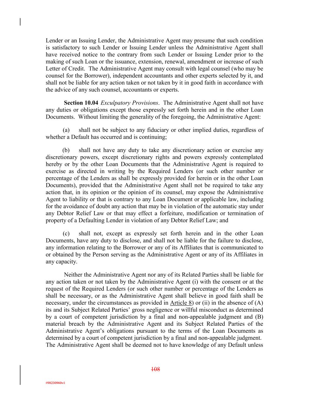 Lender or an Issuing Lender, the Administrative Agent may presume that such condition is satisfactory to such Lender or Issuing Lender unless the Administrative Agent shall have received notice to the contrary from such Lender or Issuing Lender prior to the making of such Loan or the issuance, extension, renewal, amendment or increase of such Letter of Credit. The Administrative Agent may consult with legal counsel (who may be counsel for the Borrower), independent accountants and other experts selected by it, and shall not be liable for any action taken or not taken by it in good faith in accordance with the advice of any such counsel, accountants or experts. Section 10.04 Exculpatory Provisions. The Administrative Agent shall not have any duties or obligations except those expressly set forth herein and in the other Loan Documents. Without limiting the generality of the foregoing, the Administrative Agent: (a) shall not be subject to any fiduciary or other implied duties, regardless of whether a Default has occurred and is continuing; (b) shall not have any duty to take any discretionary action or exercise any discretionary powers, except discretionary rights and powers expressly contemplated hereby or by the other Loan Documents that the Administrative Agent is required to exercise as directed in writing by the Required Lenders (or such other number or percentage of the Lenders as shall be expressly provided for herein or in the other Loan Documents), provided that the Administrative Agent shall not be required to take any action that, in its opinion or the opinion of its counsel, may expose the Administrative Agent to liability or that is contrary to any Loan Document or applicable law, including for the avoidance of doubt any action that may be in violation of the automatic stay under any Debtor Relief Law or that may effect a forfeiture, modification or termination of property of a Defaulting Lender in violation of any Debtor Relief Law; and (c) shall not, except as expressly set forth herein and in the other Loan Documents, have any duty to disclose, and shall not be liable for the failure to disclose, any information relating to the Borrower or any of its Affiliates that is communicated to or obtained by the Person serving as the Administrative Agent or any of its Affiliates in any capacity. Neither the Administrative Agent nor any of its Related Parties shall be liable for any action taken or not taken by the Administrative Agent (i) with the consent or at the request of the Required Lenders (or such other number or percentage of the Lenders as shall be necessary, or as the Administrative Agent shall believe in good faith shall be necessary, under the circumstances as provided in Article 8) or (ii) in the absence of (A) its and its Subject Related Parties’ gross negligence or willful misconduct as determined by a court of competent jurisdiction by a final and non-appealable judgment and (B) material breach by the Administrative Agent and its Subject Related Parties of the Administrative Agent’s obligations pursuant to the terms of the Loan Documents as determined by a court of competent jurisdiction by a final and non-appealable judgment. The Administrative Agent shall be deemed not to have knowledge of any Default unless 108 #98230960v1