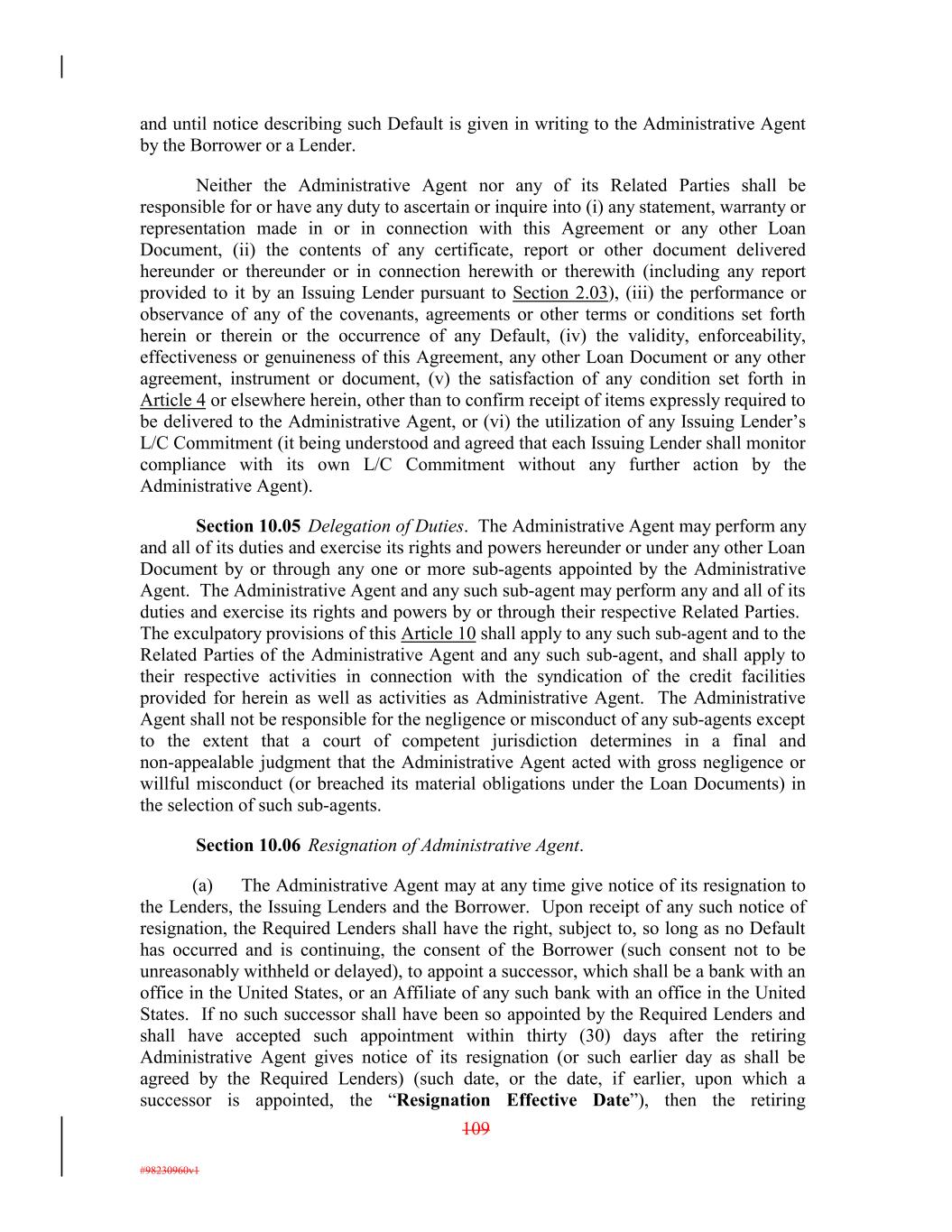 and until notice describing such Default is given in writing to the Administrative Agent by the Borrower or a Lender. Neither the Administrative Agent nor any of its Related Parties shall be responsible for or have any duty to ascertain or inquire into (i) any statement, warranty or representation made in or in connection with this Agreement or any other Loan Document, (ii) the contents of any certificate, report or other document delivered hereunder or thereunder or in connection herewith or therewith (including any report provided to it by an Issuing Lender pursuant to Section 2.03), (iii) the performance or observance of any of the covenants, agreements or other terms or conditions set forth herein or therein or the occurrence of any Default, (iv) the validity, enforceability, effectiveness or genuineness of this Agreement, any other Loan Document or any other agreement, instrument or document, (v) the satisfaction of any condition set forth in Article 4 or elsewhere herein, other than to confirm receipt of items expressly required to be delivered to the Administrative Agent, or (vi) the utilization of any Issuing Lender’s L/C Commitment (it being understood and agreed that each Issuing Lender shall monitor compliance with its own L/C Commitment without any further action by the Administrative Agent). Section 10.05 Delegation of Duties. The Administrative Agent may perform any and all of its duties and exercise its rights and powers hereunder or under any other Loan Document by or through any one or more sub-agents appointed by the Administrative Agent. The Administrative Agent and any such sub-agent may perform any and all of its duties and exercise its rights and powers by or through their respective Related Parties. The exculpatory provisions of this Article 10 shall apply to any such sub-agent and to the Related Parties of the Administrative Agent and any such sub-agent, and shall apply to their respective activities in connection with the syndication of the credit facilities provided for herein as well as activities as Administrative Agent. The Administrative Agent shall not be responsible for the negligence or misconduct of any sub-agents except to the extent that a court of competent jurisdiction determines in a final and non-appealable judgment that the Administrative Agent acted with gross negligence or willful misconduct (or breached its material obligations under the Loan Documents) in the selection of such sub-agents. Section 10.06 Resignation of Administrative Agent. (a) The Administrative Agent may at any time give notice of its resignation to the Lenders, the Issuing Lenders and the Borrower. Upon receipt of any such notice of resignation, the Required Lenders shall have the right, subject to, so long as no Default has occurred and is continuing, the consent of the Borrower (such consent not to be unreasonably withheld or delayed), to appoint a successor, which shall be a bank with an office in the United States, or an Affiliate of any such bank with an office in the United States. If no such successor shall have been so appointed by the Required Lenders and shall have accepted such appointment within thirty (30) days after the retiring Administrative Agent gives notice of its resignation (or such earlier day as shall be agreed by the Required Lenders) (such date, or the date, if earlier, upon which a successor is appointed, the “Resignation Effective Date”), then the retiring 109 #98230960v1