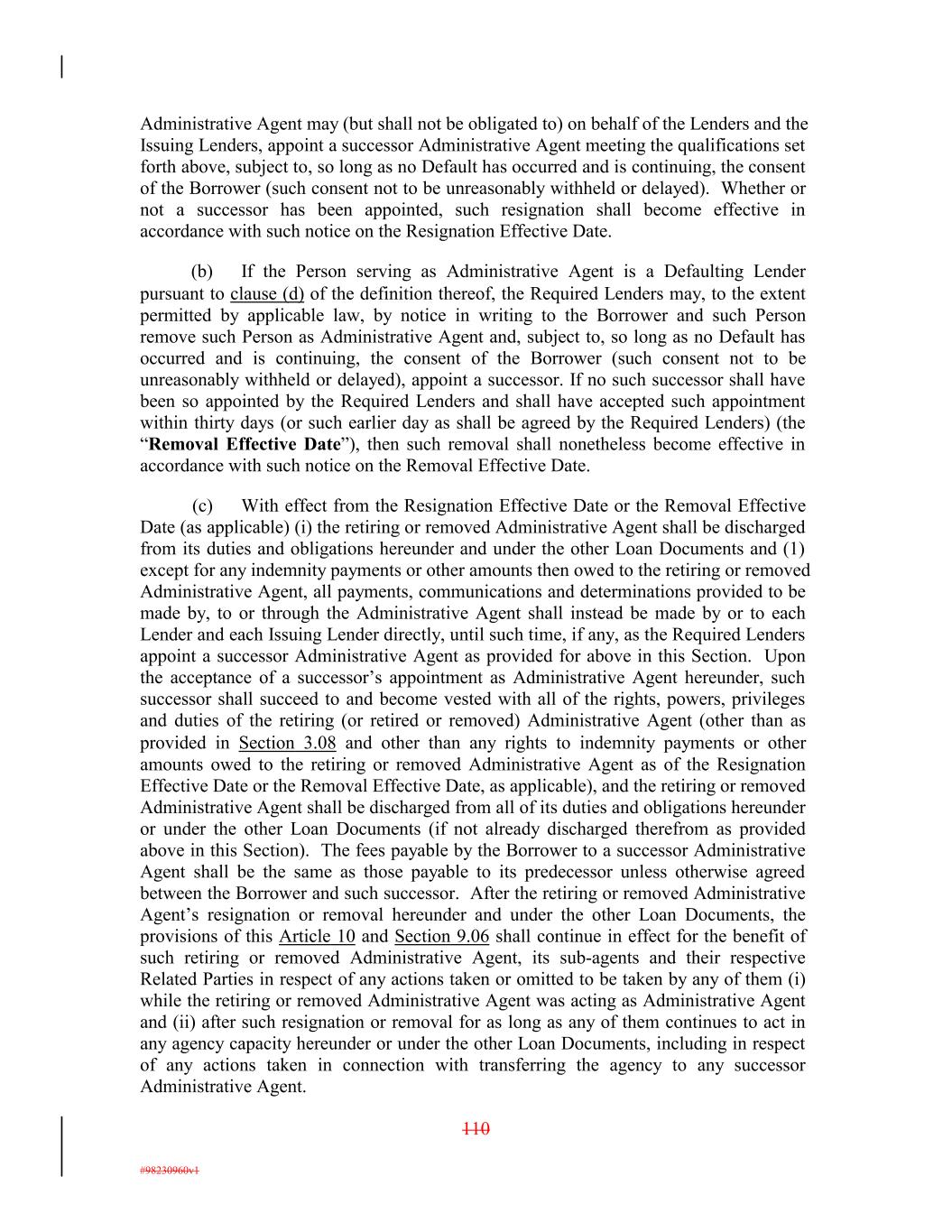Administrative Agent may (but shall not be obligated to) on behalf of the Lenders and the Issuing Lenders, appoint a successor Administrative Agent meeting the qualifications set forth above, subject to, so long as no Default has occurred and is continuing, the consent of the Borrower (such consent not to be unreasonably withheld or delayed). Whether or not a successor has been appointed, such resignation shall become effective in accordance with such notice on the Resignation Effective Date. (b) If the Person serving as Administrative Agent is a Defaulting Lender pursuant to clause (d) of the definition thereof, the Required Lenders may, to the extent permitted by applicable law, by notice in writing to the Borrower and such Person remove such Person as Administrative Agent and, subject to, so long as no Default has occurred and is continuing, the consent of the Borrower (such consent not to be unreasonably withheld or delayed), appoint a successor. If no such successor shall have been so appointed by the Required Lenders and shall have accepted such appointment within thirty days (or such earlier day as shall be agreed by the Required Lenders) (the “Removal Effective Date”), then such removal shall nonetheless become effective in accordance with such notice on the Removal Effective Date. (c) With effect from the Resignation Effective Date or the Removal Effective Date (as applicable) (i) the retiring or removed Administrative Agent shall be discharged from its duties and obligations hereunder and under the other Loan Documents and (1) except for any indemnity payments or other amounts then owed to the retiring or removed Administrative Agent, all payments, communications and determinations provided to be made by, to or through the Administrative Agent shall instead be made by or to each Lender and each Issuing Lender directly, until such time, if any, as the Required Lenders appoint a successor Administrative Agent as provided for above in this Section. Upon the acceptance of a successor’s appointment as Administrative Agent hereunder, such successor shall succeed to and become vested with all of the rights, powers, privileges and duties of the retiring (or retired or removed) Administrative Agent (other than as provided in Section 3.08 and other than any rights to indemnity payments or other amounts owed to the retiring or removed Administrative Agent as of the Resignation Effective Date or the Removal Effective Date, as applicable), and the retiring or removed Administrative Agent shall be discharged from all of its duties and obligations hereunder or under the other Loan Documents (if not already discharged therefrom as provided above in this Section). The fees payable by the Borrower to a successor Administrative Agent shall be the same as those payable to its predecessor unless otherwise agreed between the Borrower and such successor. After the retiring or removed Administrative Agent’s resignation or removal hereunder and under the other Loan Documents, the provisions of this Article 10 and Section 9.06 shall continue in effect for the benefit of such retiring or removed Administrative Agent, its sub-agents and their respective Related Parties in respect of any actions taken or omitted to be taken by any of them (i) while the retiring or removed Administrative Agent was acting as Administrative Agent and (ii) after such resignation or removal for as long as any of them continues to act in any agency capacity hereunder or under the other Loan Documents, including in respect of any actions taken in connection with transferring the agency to any successor Administrative Agent. 110 #98230960v1