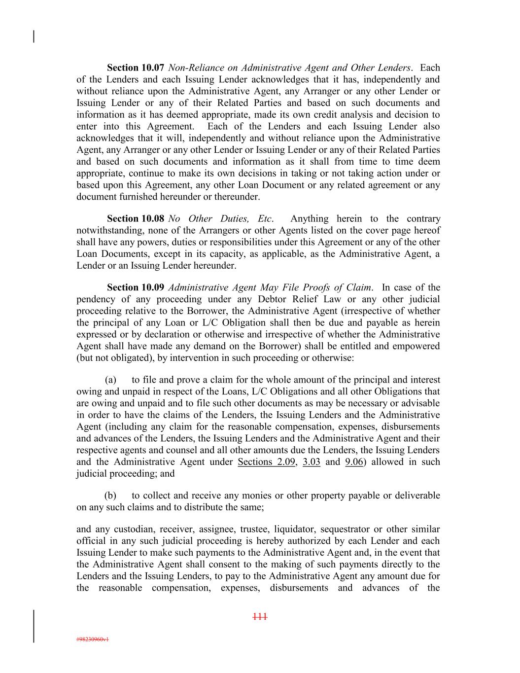 Section 10.07 Non-Reliance on Administrative Agent and Other Lenders. Each of the Lenders and each Issuing Lender acknowledges that it has, independently and without reliance upon the Administrative Agent, any Arranger or any other Lender or Issuing Lender or any of their Related Parties and based on such documents and information as it has deemed appropriate, made its own credit analysis and decision to enter into this Agreement. Each of the Lenders and each Issuing Lender also acknowledges that it will, independently and without reliance upon the Administrative Agent, any Arranger or any other Lender or Issuing Lender or any of their Related Parties and based on such documents and information as it shall from time to time deem appropriate, continue to make its own decisions in taking or not taking action under or based upon this Agreement, any other Loan Document or any related agreement or any document furnished hereunder or thereunder. Section 10.08 No Other Duties, Etc. Anything herein to the contrary notwithstanding, none of the Arrangers or other Agents listed on the cover page hereof shall have any powers, duties or responsibilities under this Agreement or any of the other Loan Documents, except in its capacity, as applicable, as the Administrative Agent, a Lender or an Issuing Lender hereunder. Section 10.09 Administrative Agent May File Proofs of Claim. In case of the pendency of any proceeding under any Debtor Relief Law or any other judicial proceeding relative to the Borrower, the Administrative Agent (irrespective of whether the principal of any Loan or L/C Obligation shall then be due and payable as herein expressed or by declaration or otherwise and irrespective of whether the Administrative Agent shall have made any demand on the Borrower) shall be entitled and empowered (but not obligated), by intervention in such proceeding or otherwise: (a) to file and prove a claim for the whole amount of the principal and interest owing and unpaid in respect of the Loans, L/C Obligations and all other Obligations that are owing and unpaid and to file such other documents as may be necessary or advisable in order to have the claims of the Lenders, the Issuing Lenders and the Administrative Agent (including any claim for the reasonable compensation, expenses, disbursements and advances of the Lenders, the Issuing Lenders and the Administrative Agent and their respective agents and counsel and all other amounts due the Lenders, the Issuing Lenders and the Administrative Agent under Sections 2.09, 3.03 and 9.06) allowed in such judicial proceeding; and (b) to collect and receive any monies or other property payable or deliverable on any such claims and to distribute the same; and any custodian, receiver, assignee, trustee, liquidator, sequestrator or other similar official in any such judicial proceeding is hereby authorized by each Lender and each Issuing Lender to make such payments to the Administrative Agent and, in the event that the Administrative Agent shall consent to the making of such payments directly to the Lenders and the Issuing Lenders, to pay to the Administrative Agent any amount due for the reasonable compensation, expenses, disbursements and advances of the 111 #98230960v1