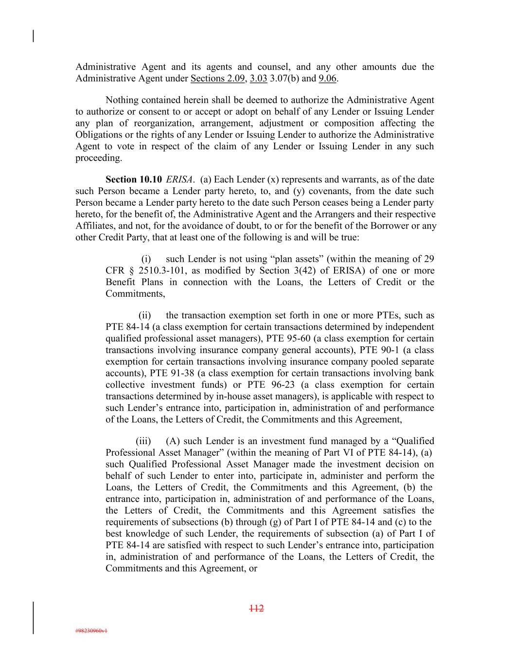 Administrative Agent and its agents and counsel, and any other amounts due the Administrative Agent under Sections 2.09, 3.03 3.07(b) and 9.06. Nothing contained herein shall be deemed to authorize the Administrative Agent to authorize or consent to or accept or adopt on behalf of any Lender or Issuing Lender any plan of reorganization, arrangement, adjustment or composition affecting the Obligations or the rights of any Lender or Issuing Lender to authorize the Administrative Agent to vote in respect of the claim of any Lender or Issuing Lender in any such proceeding. Section 10.10 ERISA. (a) Each Lender (x) represents and warrants, as of the date such Person became a Lender party hereto, to, and (y) covenants, from the date such Person became a Lender party hereto to the date such Person ceases being a Lender party hereto, for the benefit of, the Administrative Agent and the Arrangers and their respective Affiliates, and not, for the avoidance of doubt, to or for the benefit of the Borrower or any other Credit Party, that at least one of the following is and will be true: (i) such Lender is not using “plan assets” (within the meaning of 29 CFR § 2510.3-101, as modified by Section 3(42) of ERISA) of one or more Benefit Plans in connection with the Loans, the Letters of Credit or the Commitments, (ii) the transaction exemption set forth in one or more PTEs, such as PTE 84-14 (a class exemption for certain transactions determined by independent qualified professional asset managers), PTE 95-60 (a class exemption for certain transactions involving insurance company general accounts), PTE 90-1 (a class exemption for certain transactions involving insurance company pooled separate accounts), PTE 91-38 (a class exemption for certain transactions involving bank collective investment funds) or PTE 96-23 (a class exemption for certain transactions determined by in-house asset managers), is applicable with respect to such Lender’s entrance into, participation in, administration of and performance of the Loans, the Letters of Credit, the Commitments and this Agreement, (iii) (A) such Lender is an investment fund managed by a “Qualified Professional Asset Manager” (within the meaning of Part VI of PTE 84-14), (a) such Qualified Professional Asset Manager made the investment decision on behalf of such Lender to enter into, participate in, administer and perform the Loans, the Letters of Credit, the Commitments and this Agreement, (b) the entrance into, participation in, administration of and performance of the Loans, the Letters of Credit, the Commitments and this Agreement satisfies the requirements of subsections (b) through (g) of Part I of PTE 84-14 and (c) to the best knowledge of such Lender, the requirements of subsection (a) of Part I of PTE 84-14 are satisfied with respect to such Lender’s entrance into, participation in, administration of and performance of the Loans, the Letters of Credit, the Commitments and this Agreement, or 112 #98230960v1