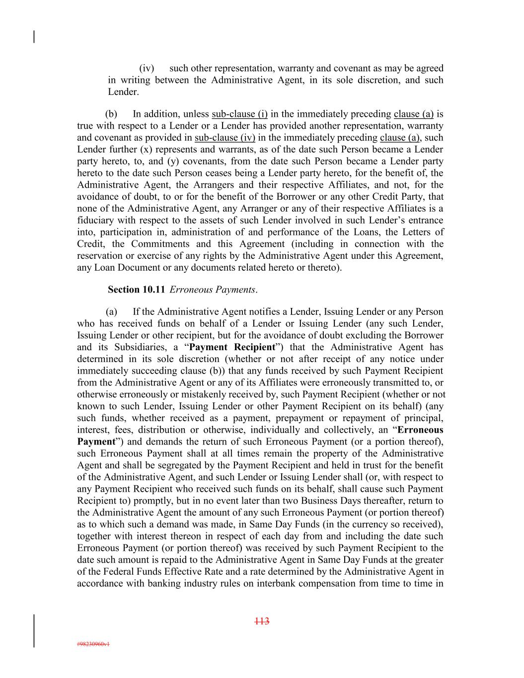 (iv) such other representation, warranty and covenant as may be agreed in writing between the Administrative Agent, in its sole discretion, and such Lender. (b) In addition, unless sub-clause (i) in the immediately preceding clause (a) is true with respect to a Lender or a Lender has provided another representation, warranty and covenant as provided in sub-clause (iv) in the immediately preceding clause (a), such Lender further (x) represents and warrants, as of the date such Person became a Lender party hereto, to, and (y) covenants, from the date such Person became a Lender party hereto to the date such Person ceases being a Lender party hereto, for the benefit of, the Administrative Agent, the Arrangers and their respective Affiliates, and not, for the avoidance of doubt, to or for the benefit of the Borrower or any other Credit Party, that none of the Administrative Agent, any Arranger or any of their respective Affiliates is a fiduciary with respect to the assets of such Lender involved in such Lender’s entrance into, participation in, administration of and performance of the Loans, the Letters of Credit, the Commitments and this Agreement (including in connection with the reservation or exercise of any rights by the Administrative Agent under this Agreement, any Loan Document or any documents related hereto or thereto). Section 10.11 Erroneous Payments. (a) If the Administrative Agent notifies a Lender, Issuing Lender or any Person who has received funds on behalf of a Lender or Issuing Lender (any such Lender, Issuing Lender or other recipient, but for the avoidance of doubt excluding the Borrower and its Subsidiaries, a “Payment Recipient”) that the Administrative Agent has determined in its sole discretion (whether or not after receipt of any notice under immediately succeeding clause (b)) that any funds received by such Payment Recipient from the Administrative Agent or any of its Affiliates were erroneously transmitted to, or otherwise erroneously or mistakenly received by, such Payment Recipient (whether or not known to such Lender, Issuing Lender or other Payment Recipient on its behalf) (any such funds, whether received as a payment, prepayment or repayment of principal, interest, fees, distribution or otherwise, individually and collectively, an “Erroneous Payment”) and demands the return of such Erroneous Payment (or a portion thereof), such Erroneous Payment shall at all times remain the property of the Administrative Agent and shall be segregated by the Payment Recipient and held in trust for the benefit of the Administrative Agent, and such Lender or Issuing Lender shall (or, with respect to any Payment Recipient who received such funds on its behalf, shall cause such Payment Recipient to) promptly, but in no event later than two Business Days thereafter, return to the Administrative Agent the amount of any such Erroneous Payment (or portion thereof) as to which such a demand was made, in Same Day Funds (in the currency so received), together with interest thereon in respect of each day from and including the date such Erroneous Payment (or portion thereof) was received by such Payment Recipient to the date such amount is repaid to the Administrative Agent in Same Day Funds at the greater of the Federal Funds Effective Rate and a rate determined by the Administrative Agent in accordance with banking industry rules on interbank compensation from time to time in 113 #98230960v1