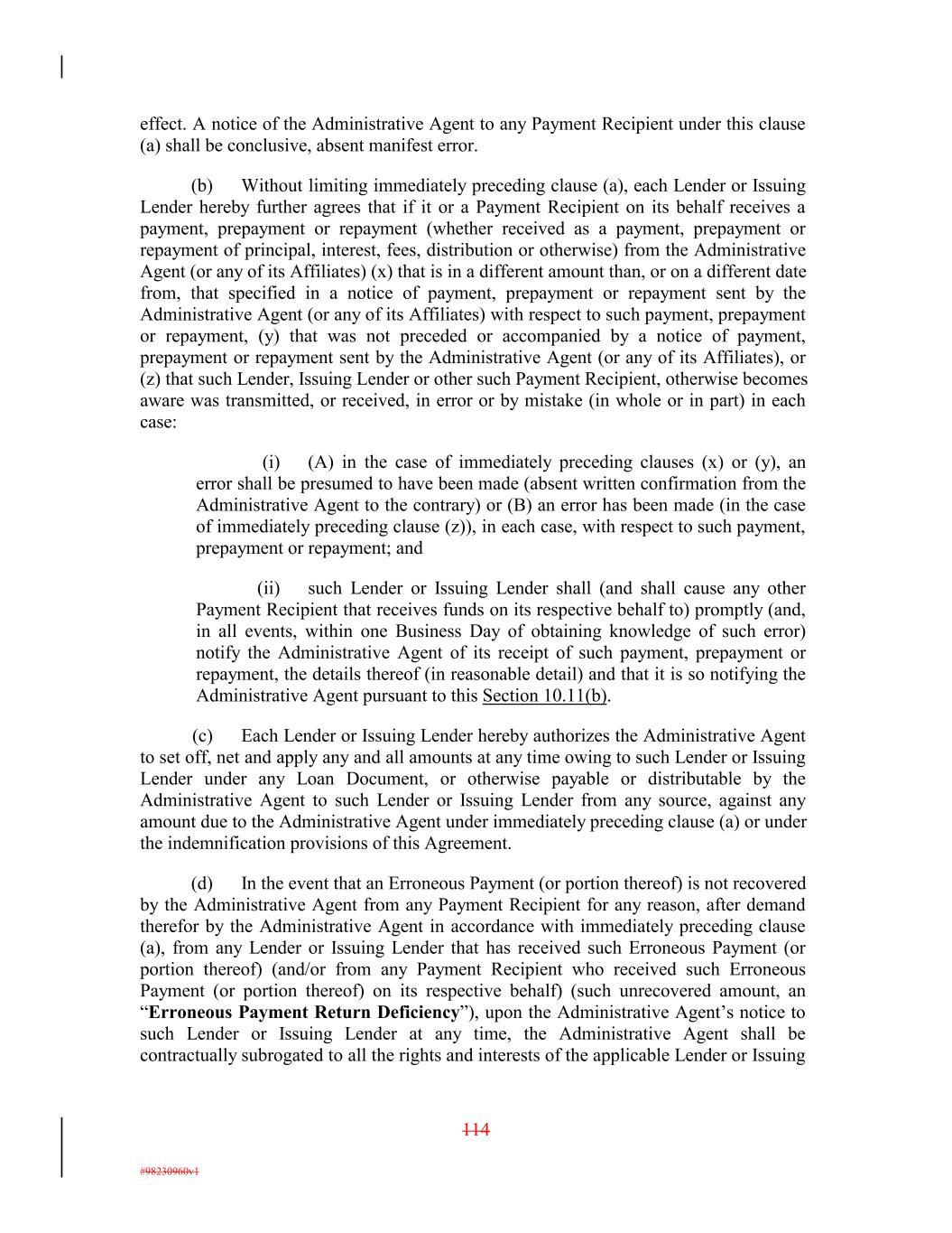 effect. A notice of the Administrative Agent to any Payment Recipient under this clause (a) shall be conclusive, absent manifest error. (b) Without limiting immediately preceding clause (a), each Lender or Issuing Lender hereby further agrees that if it or a Payment Recipient on its behalf receives a payment, prepayment or repayment (whether received as a payment, prepayment or repayment of principal, interest, fees, distribution or otherwise) from the Administrative Agent (or any of its Affiliates) (x) that is in a different amount than, or on a different date from, that specified in a notice of payment, prepayment or repayment sent by the Administrative Agent (or any of its Affiliates) with respect to such payment, prepayment or repayment, (y) that was not preceded or accompanied by a notice of payment, prepayment or repayment sent by the Administrative Agent (or any of its Affiliates), or (z) that such Lender, Issuing Lender or other such Payment Recipient, otherwise becomes aware was transmitted, or received, in error or by mistake (in whole or in part) in each case: (i) (A) in the case of immediately preceding clauses (x) or (y), an error shall be presumed to have been made (absent written confirmation from the Administrative Agent to the contrary) or (B) an error has been made (in the case of immediately preceding clause (z)), in each case, with respect to such payment, prepayment or repayment; and (ii) such Lender or Issuing Lender shall (and shall cause any other Payment Recipient that receives funds on its respective behalf to) promptly (and, in all events, within one Business Day of obtaining knowledge of such error) notify the Administrative Agent of its receipt of such payment, prepayment or repayment, the details thereof (in reasonable detail) and that it is so notifying the Administrative Agent pursuant to this Section 10.11(b). (c) Each Lender or Issuing Lender hereby authorizes the Administrative Agent to set off, net and apply any and all amounts at any time owing to such Lender or Issuing Lender under any Loan Document, or otherwise payable or distributable by the Administrative Agent to such Lender or Issuing Lender from any source, against any amount due to the Administrative Agent under immediately preceding clause (a) or under the indemnification provisions of this Agreement. (d) In the event that an Erroneous Payment (or portion thereof) is not recovered by the Administrative Agent from any Payment Recipient for any reason, after demand therefor by the Administrative Agent in accordance with immediately preceding clause (a), from any Lender or Issuing Lender that has received such Erroneous Payment (or portion thereof) (and/or from any Payment Recipient who received such Erroneous Payment (or portion thereof) on its respective behalf) (such unrecovered amount, an “Erroneous Payment Return Deficiency”), upon the Administrative Agent’s notice to such Lender or Issuing Lender at any time, the Administrative Agent shall be contractually subrogated to all the rights and interests of the applicable Lender or Issuing 114 #98230960v1