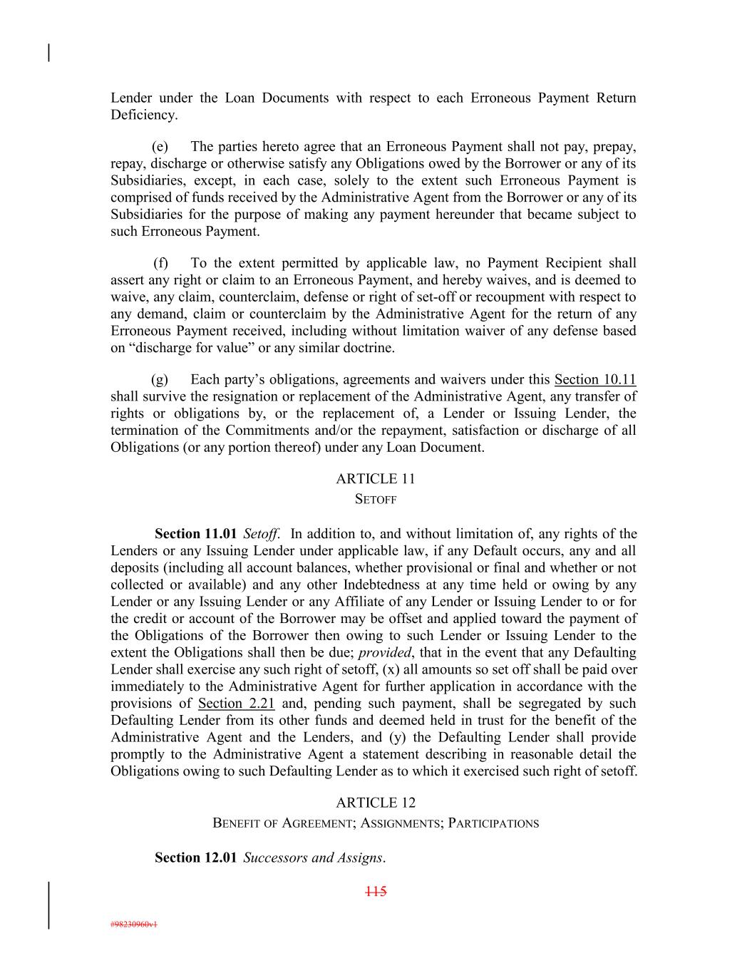 Lender under the Loan Documents with respect to each Erroneous Payment Return Deficiency. (e) The parties hereto agree that an Erroneous Payment shall not pay, prepay, repay, discharge or otherwise satisfy any Obligations owed by the Borrower or any of its Subsidiaries, except, in each case, solely to the extent such Erroneous Payment is comprised of funds received by the Administrative Agent from the Borrower or any of its Subsidiaries for the purpose of making any payment hereunder that became subject to such Erroneous Payment. (f) To the extent permitted by applicable law, no Payment Recipient shall assert any right or claim to an Erroneous Payment, and hereby waives, and is deemed to waive, any claim, counterclaim, defense or right of set-off or recoupment with respect to any demand, claim or counterclaim by the Administrative Agent for the return of any Erroneous Payment received, including without limitation waiver of any defense based on “discharge for value” or any similar doctrine. (g) Each party’s obligations, agreements and waivers under this Section 10.11 shall survive the resignation or replacement of the Administrative Agent, any transfer of rights or obligations by, or the replacement of, a Lender or Issuing Lender, the termination of the Commitments and/or the repayment, satisfaction or discharge of all Obligations (or any portion thereof) under any Loan Document. ARTICLE 11 SETOFF Section 11.01 Setoff. In addition to, and without limitation of, any rights of the Lenders or any Issuing Lender under applicable law, if any Default occurs, any and all deposits (including all account balances, whether provisional or final and whether or not collected or available) and any other Indebtedness at any time held or owing by any Lender or any Issuing Lender or any Affiliate of any Lender or Issuing Lender to or for the credit or account of the Borrower may be offset and applied toward the payment of the Obligations of the Borrower then owing to such Lender or Issuing Lender to the extent the Obligations shall then be due; provided, that in the event that any Defaulting Lender shall exercise any such right of setoff, (x) all amounts so set off shall be paid over immediately to the Administrative Agent for further application in accordance with the provisions of Section 2.21 and, pending such payment, shall be segregated by such Defaulting Lender from its other funds and deemed held in trust for the benefit of the Administrative Agent and the Lenders, and (y) the Defaulting Lender shall provide promptly to the Administrative Agent a statement describing in reasonable detail the Obligations owing to such Defaulting Lender as to which it exercised such right of setoff. ARTICLE 12 BENEFIT OF AGREEMENT; ASSIGNMENTS; PARTICIPATIONS Section 12.01 Successors and Assigns. 115 #98230960v1
