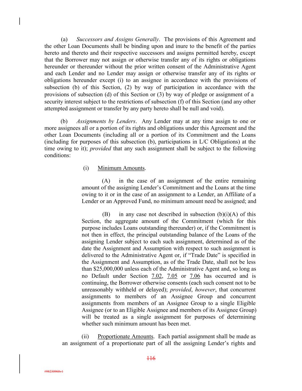 (a) Successors and Assigns Generally. The provisions of this Agreement and the other Loan Documents shall be binding upon and inure to the benefit of the parties hereto and thereto and their respective successors and assigns permitted hereby, except that the Borrower may not assign or otherwise transfer any of its rights or obligations hereunder or thereunder without the prior written consent of the Administrative Agent and each Lender and no Lender may assign or otherwise transfer any of its rights or obligations hereunder except (i) to an assignee in accordance with the provisions of subsection (b) of this Section, (2) by way of participation in accordance with the provisions of subsection (d) of this Section or (3) by way of pledge or assignment of a security interest subject to the restrictions of subsection (f) of this Section (and any other attempted assignment or transfer by any party hereto shall be null and void). (b) Assignments by Lenders. Any Lender may at any time assign to one or more assignees all or a portion of its rights and obligations under this Agreement and the other Loan Documents (including all or a portion of its Commitment and the Loans (including for purposes of this subsection (b), participations in L/C Obligations) at the time owing to it); provided that any such assignment shall be subject to the following conditions: (i) Minimum Amounts. (A) in the case of an assignment of the entire remaining amount of the assigning Lender’s Commitment and the Loans at the time owing to it or in the case of an assignment to a Lender, an Affiliate of a Lender or an Approved Fund, no minimum amount need be assigned; and (B) in any case not described in subsection (b)(i)(A) of this Section, the aggregate amount of the Commitment (which for this purpose includes Loans outstanding thereunder) or, if the Commitment is not then in effect, the principal outstanding balance of the Loans of the assigning Lender subject to each such assignment, determined as of the date the Assignment and Assumption with respect to such assignment is delivered to the Administrative Agent or, if “Trade Date” is specified in the Assignment and Assumption, as of the Trade Date, shall not be less than $25,000,000 unless each of the Administrative Agent and, so long as no Default under Section 7.02, 7.05 or 7.06 has occurred and is continuing, the Borrower otherwise consents (each such consent not to be unreasonably withheld or delayed); provided, however, that concurrent assignments to members of an Assignee Group and concurrent assignments from members of an Assignee Group to a single Eligible Assignee (or to an Eligible Assignee and members of its Assignee Group) will be treated as a single assignment for purposes of determining whether such minimum amount has been met. (ii) Proportionate Amounts. Each partial assignment shall be made as an assignment of a proportionate part of all the assigning Lender’s rights and 116 #98230960v1