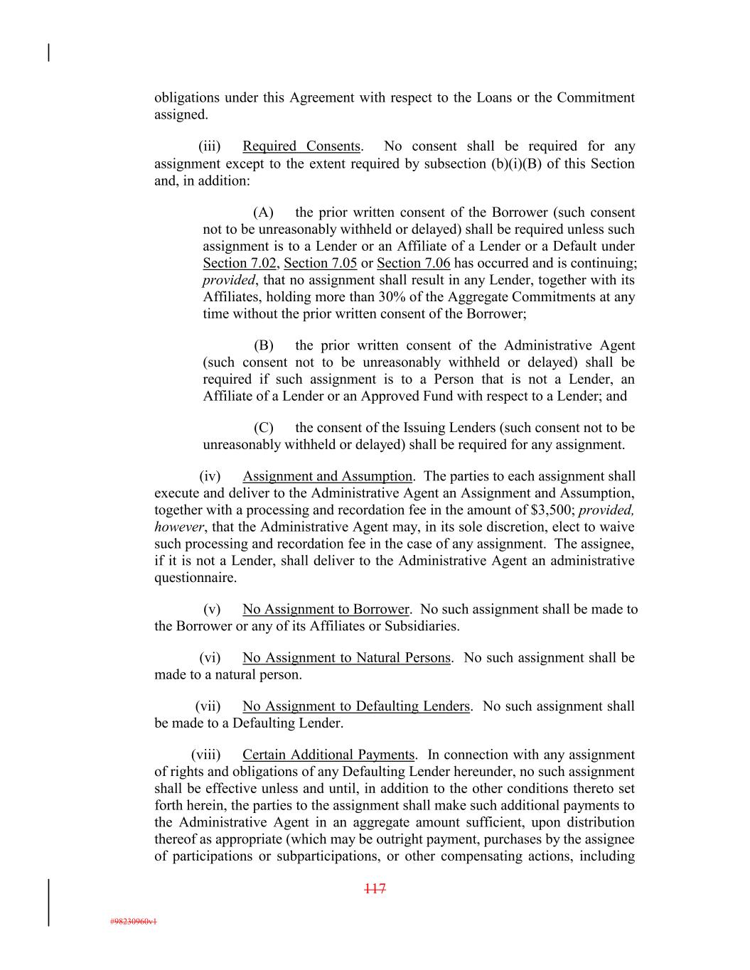 obligations under this Agreement with respect to the Loans or the Commitment assigned. (iii) Required Consents. No consent shall be required for any assignment except to the extent required by subsection (b)(i)(B) of this Section and, in addition: (A) the prior written consent of the Borrower (such consent not to be unreasonably withheld or delayed) shall be required unless such assignment is to a Lender or an Affiliate of a Lender or a Default under Section 7.02, Section 7.05 or Section 7.06 has occurred and is continuing; provided, that no assignment shall result in any Lender, together with its Affiliates, holding more than 30% of the Aggregate Commitments at any time without the prior written consent of the Borrower; (B) the prior written consent of the Administrative Agent (such consent not to be unreasonably withheld or delayed) shall be required if such assignment is to a Person that is not a Lender, an Affiliate of a Lender or an Approved Fund with respect to a Lender; and (C) the consent of the Issuing Lenders (such consent not to be unreasonably withheld or delayed) shall be required for any assignment. (iv) Assignment and Assumption. The parties to each assignment shall execute and deliver to the Administrative Agent an Assignment and Assumption, together with a processing and recordation fee in the amount of $3,500; provided, however, that the Administrative Agent may, in its sole discretion, elect to waive such processing and recordation fee in the case of any assignment. The assignee, if it is not a Lender, shall deliver to the Administrative Agent an administrative questionnaire. (v) No Assignment to Borrower. No such assignment shall be made to the Borrower or any of its Affiliates or Subsidiaries. (vi) No Assignment to Natural Persons. No such assignment shall be made to a natural person. (vii) No Assignment to Defaulting Lenders. No such assignment shall be made to a Defaulting Lender. (viii) Certain Additional Payments. In connection with any assignment of rights and obligations of any Defaulting Lender hereunder, no such assignment shall be effective unless and until, in addition to the other conditions thereto set forth herein, the parties to the assignment shall make such additional payments to the Administrative Agent in an aggregate amount sufficient, upon distribution thereof as appropriate (which may be outright payment, purchases by the assignee of participations or subparticipations, or other compensating actions, including 117 #98230960v1