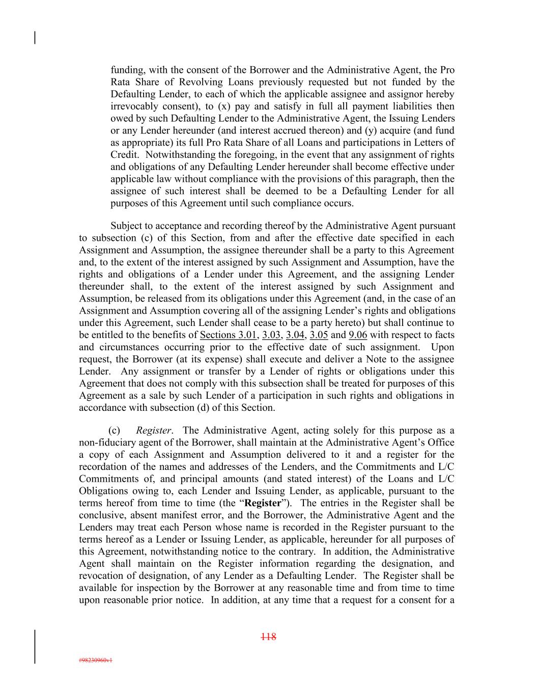 funding, with the consent of the Borrower and the Administrative Agent, the Pro Rata Share of Revolving Loans previously requested but not funded by the Defaulting Lender, to each of which the applicable assignee and assignor hereby irrevocably consent), to (x) pay and satisfy in full all payment liabilities then owed by such Defaulting Lender to the Administrative Agent, the Issuing Lenders or any Lender hereunder (and interest accrued thereon) and (y) acquire (and fund as appropriate) its full Pro Rata Share of all Loans and participations in Letters of Credit. Notwithstanding the foregoing, in the event that any assignment of rights and obligations of any Defaulting Lender hereunder shall become effective under applicable law without compliance with the provisions of this paragraph, then the assignee of such interest shall be deemed to be a Defaulting Lender for all purposes of this Agreement until such compliance occurs. Subject to acceptance and recording thereof by the Administrative Agent pursuant to subsection (c) of this Section, from and after the effective date specified in each Assignment and Assumption, the assignee thereunder shall be a party to this Agreement and, to the extent of the interest assigned by such Assignment and Assumption, have the rights and obligations of a Lender under this Agreement, and the assigning Lender thereunder shall, to the extent of the interest assigned by such Assignment and Assumption, be released from its obligations under this Agreement (and, in the case of an Assignment and Assumption covering all of the assigning Lender’s rights and obligations under this Agreement, such Lender shall cease to be a party hereto) but shall continue to be entitled to the benefits of Sections 3.01, 3.03, 3.04, 3.05 and 9.06 with respect to facts and circumstances occurring prior to the effective date of such assignment. Upon request, the Borrower (at its expense) shall execute and deliver a Note to the assignee Lender. Any assignment or transfer by a Lender of rights or obligations under this Agreement that does not comply with this subsection shall be treated for purposes of this Agreement as a sale by such Lender of a participation in such rights and obligations in accordance with subsection (d) of this Section. (c) Register. The Administrative Agent, acting solely for this purpose as a non-fiduciary agent of the Borrower, shall maintain at the Administrative Agent’s Office a copy of each Assignment and Assumption delivered to it and a register for the recordation of the names and addresses of the Lenders, and the Commitments and L/C Commitments of, and principal amounts (and stated interest) of the Loans and L/C Obligations owing to, each Lender and Issuing Lender, as applicable, pursuant to the terms hereof from time to time (the “Register”). The entries in the Register shall be conclusive, absent manifest error, and the Borrower, the Administrative Agent and the Lenders may treat each Person whose name is recorded in the Register pursuant to the terms hereof as a Lender or Issuing Lender, as applicable, hereunder for all purposes of this Agreement, notwithstanding notice to the contrary. In addition, the Administrative Agent shall maintain on the Register information regarding the designation, and revocation of designation, of any Lender as a Defaulting Lender. The Register shall be available for inspection by the Borrower at any reasonable time and from time to time upon reasonable prior notice. In addition, at any time that a request for a consent for a 118 #98230960v1