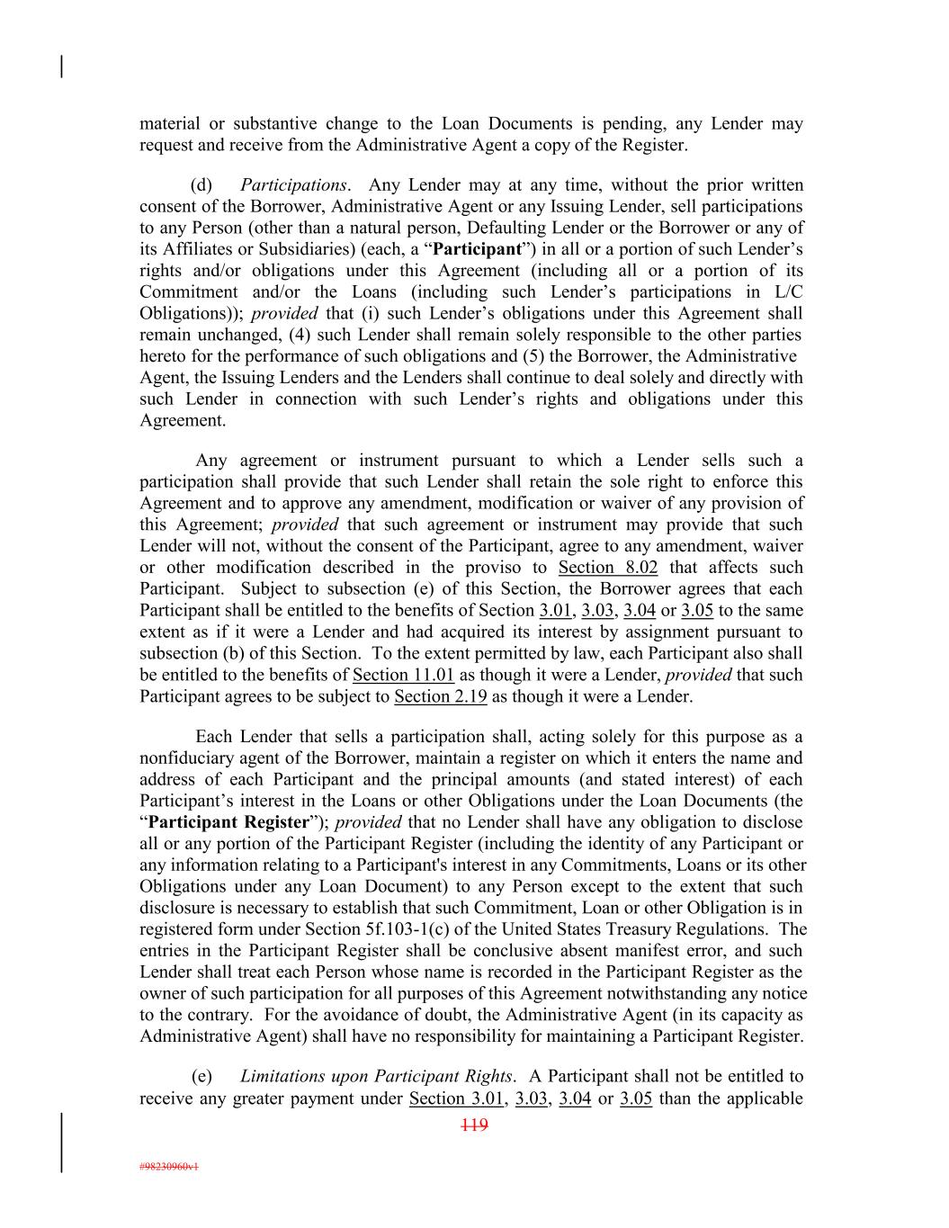 material or substantive change to the Loan Documents is pending, any Lender may request and receive from the Administrative Agent a copy of the Register. (d) Participations. Any Lender may at any time, without the prior written consent of the Borrower, Administrative Agent or any Issuing Lender, sell participations to any Person (other than a natural person, Defaulting Lender or the Borrower or any of its Affiliates or Subsidiaries) (each, a “Participant”) in all or a portion of such Lender’s rights and/or obligations under this Agreement (including all or a portion of its Commitment and/or the Loans (including such Lender’s participations in L/C Obligations)); provided that (i) such Lender’s obligations under this Agreement shall remain unchanged, (4) such Lender shall remain solely responsible to the other parties hereto for the performance of such obligations and (5) the Borrower, the Administrative Agent, the Issuing Lenders and the Lenders shall continue to deal solely and directly with such Lender in connection with such Lender’s rights and obligations under this Agreement. Any agreement or instrument pursuant to which a Lender sells such a participation shall provide that such Lender shall retain the sole right to enforce this Agreement and to approve any amendment, modification or waiver of any provision of this Agreement; provided that such agreement or instrument may provide that such Lender will not, without the consent of the Participant, agree to any amendment, waiver or other modification described in the proviso to Section 8.02 that affects such Participant. Subject to subsection (e) of this Section, the Borrower agrees that each Participant shall be entitled to the benefits of Section 3.01, 3.03, 3.04 or 3.05 to the same extent as if it were a Lender and had acquired its interest by assignment pursuant to subsection (b) of this Section. To the extent permitted by law, each Participant also shall be entitled to the benefits of Section 11.01 as though it were a Lender, provided that such Participant agrees to be subject to Section 2.19 as though it were a Lender. Each Lender that sells a participation shall, acting solely for this purpose as a nonfiduciary agent of the Borrower, maintain a register on which it enters the name and address of each Participant and the principal amounts (and stated interest) of each Participant’s interest in the Loans or other Obligations under the Loan Documents (the “Participant Register”); provided that no Lender shall have any obligation to disclose all or any portion of the Participant Register (including the identity of any Participant or any information relating to a Participant's interest in any Commitments, Loans or its other Obligations under any Loan Document) to any Person except to the extent that such disclosure is necessary to establish that such Commitment, Loan or other Obligation is in registered form under Section 5f.103-1(c) of the United States Treasury Regulations. The entries in the Participant Register shall be conclusive absent manifest error, and such Lender shall treat each Person whose name is recorded in the Participant Register as the owner of such participation for all purposes of this Agreement notwithstanding any notice to the contrary. For the avoidance of doubt, the Administrative Agent (in its capacity as Administrative Agent) shall have no responsibility for maintaining a Participant Register. (e) Limitations upon Participant Rights. A Participant shall not be entitled to receive any greater payment under Section 3.01, 3.03, 3.04 or 3.05 than the applicable 119 #98230960v1