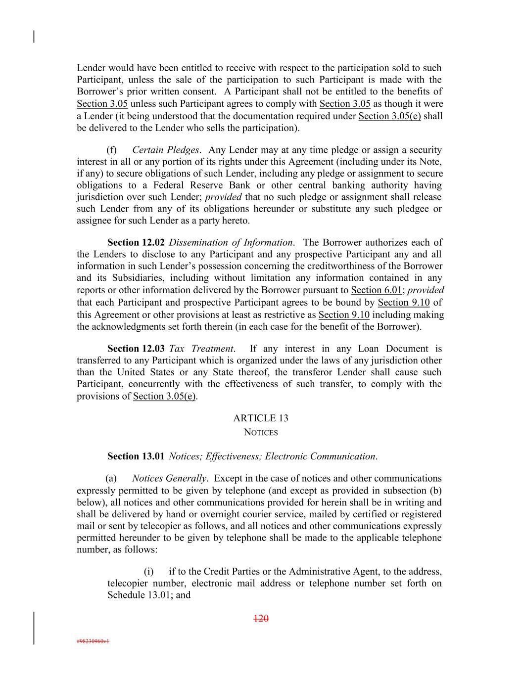 Lender would have been entitled to receive with respect to the participation sold to such Participant, unless the sale of the participation to such Participant is made with the Borrower’s prior written consent. A Participant shall not be entitled to the benefits of Section 3.05 unless such Participant agrees to comply with Section 3.05 as though it were a Lender (it being understood that the documentation required under Section 3.05(e) shall be delivered to the Lender who sells the participation). (f) Certain Pledges. Any Lender may at any time pledge or assign a security interest in all or any portion of its rights under this Agreement (including under its Note, if any) to secure obligations of such Lender, including any pledge or assignment to secure obligations to a Federal Reserve Bank or other central banking authority having jurisdiction over such Lender; provided that no such pledge or assignment shall release such Lender from any of its obligations hereunder or substitute any such pledgee or assignee for such Lender as a party hereto. Section 12.02 Dissemination of Information. The Borrower authorizes each of the Lenders to disclose to any Participant and any prospective Participant any and all information in such Lender’s possession concerning the creditworthiness of the Borrower and its Subsidiaries, including without limitation any information contained in any reports or other information delivered by the Borrower pursuant to Section 6.01; provided that each Participant and prospective Participant agrees to be bound by Section 9.10 of this Agreement or other provisions at least as restrictive as Section 9.10 including making the acknowledgments set forth therein (in each case for the benefit of the Borrower). Section 12.03 Tax Treatment. If any interest in any Loan Document is transferred to any Participant which is organized under the laws of any jurisdiction other than the United States or any State thereof, the transferor Lender shall cause such Participant, concurrently with the effectiveness of such transfer, to comply with the provisions of Section 3.05(e). ARTICLE 13 NOTICES Section 13.01 Notices; Effectiveness; Electronic Communication. (a) Notices Generally. Except in the case of notices and other communications expressly permitted to be given by telephone (and except as provided in subsection (b) below), all notices and other communications provided for herein shall be in writing and shall be delivered by hand or overnight courier service, mailed by certified or registered mail or sent by telecopier as follows, and all notices and other communications expressly permitted hereunder to be given by telephone shall be made to the applicable telephone number, as follows: (i) if to the Credit Parties or the Administrative Agent, to the address, telecopier number, electronic mail address or telephone number set forth on Schedule 13.01; and 120 #98230960v1