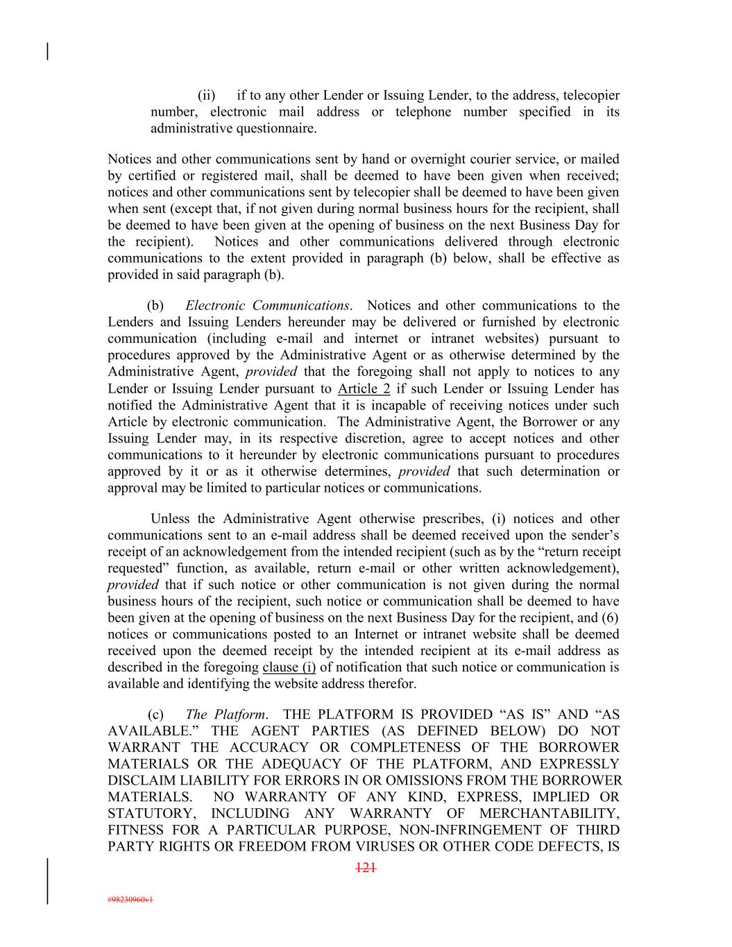 (ii) if to any other Lender or Issuing Lender, to the address, telecopier number, electronic mail address or telephone number specified in its administrative questionnaire. Notices and other communications sent by hand or overnight courier service, or mailed by certified or registered mail, shall be deemed to have been given when received; notices and other communications sent by telecopier shall be deemed to have been given when sent (except that, if not given during normal business hours for the recipient, shall be deemed to have been given at the opening of business on the next Business Day for the recipient). Notices and other communications delivered through electronic communications to the extent provided in paragraph (b) below, shall be effective as provided in said paragraph (b). (b) Electronic Communications. Notices and other communications to the Lenders and Issuing Lenders hereunder may be delivered or furnished by electronic communication (including e-mail and internet or intranet websites) pursuant to procedures approved by the Administrative Agent or as otherwise determined by the Administrative Agent, provided that the foregoing shall not apply to notices to any Lender or Issuing Lender pursuant to Article 2 if such Lender or Issuing Lender has notified the Administrative Agent that it is incapable of receiving notices under such Article by electronic communication. The Administrative Agent, the Borrower or any Issuing Lender may, in its respective discretion, agree to accept notices and other communications to it hereunder by electronic communications pursuant to procedures approved by it or as it otherwise determines, provided that such determination or approval may be limited to particular notices or communications. Unless the Administrative Agent otherwise prescribes, (i) notices and other communications sent to an e-mail address shall be deemed received upon the sender’s receipt of an acknowledgement from the intended recipient (such as by the “return receipt requested” function, as available, return e-mail or other written acknowledgement), provided that if such notice or other communication is not given during the normal business hours of the recipient, such notice or communication shall be deemed to have been given at the opening of business on the next Business Day for the recipient, and (6) notices or communications posted to an Internet or intranet website shall be deemed received upon the deemed receipt by the intended recipient at its e-mail address as described in the foregoing clause (i) of notification that such notice or communication is available and identifying the website address therefor. (c) The Platform. THE PLATFORM IS PROVIDED “AS IS” AND “AS AVAILABLE.” THE AGENT PARTIES (AS DEFINED BELOW) DO NOT WARRANT THE ACCURACY OR COMPLETENESS OF THE BORROWER MATERIALS OR THE ADEQUACY OF THE PLATFORM, AND EXPRESSLY DISCLAIM LIABILITY FOR ERRORS IN OR OMISSIONS FROM THE BORROWER MATERIALS. NO WARRANTY OF ANY KIND, EXPRESS, IMPLIED OR STATUTORY, INCLUDING ANY WARRANTY OF MERCHANTABILITY, FITNESS FOR A PARTICULAR PURPOSE, NON-INFRINGEMENT OF THIRD PARTY RIGHTS OR FREEDOM FROM VIRUSES OR OTHER CODE DEFECTS, IS 121 #98230960v1