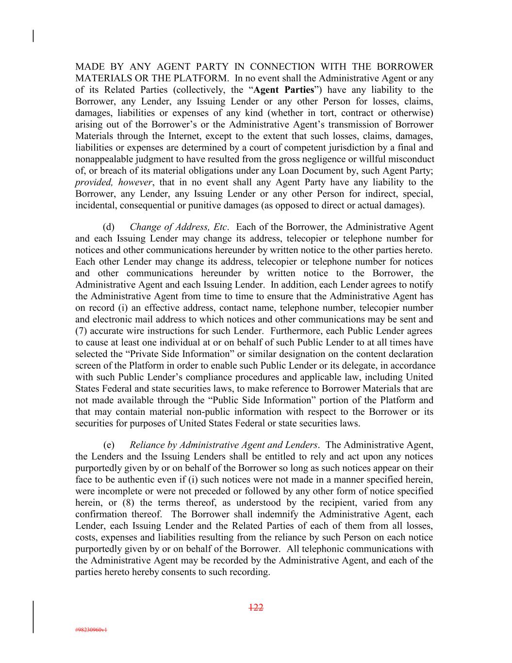 MADE BY ANY AGENT PARTY IN CONNECTION WITH THE BORROWER MATERIALS OR THE PLATFORM. In no event shall the Administrative Agent or any of its Related Parties (collectively, the “Agent Parties”) have any liability to the Borrower, any Lender, any Issuing Lender or any other Person for losses, claims, damages, liabilities or expenses of any kind (whether in tort, contract or otherwise) arising out of the Borrower’s or the Administrative Agent’s transmission of Borrower Materials through the Internet, except to the extent that such losses, claims, damages, liabilities or expenses are determined by a court of competent jurisdiction by a final and nonappealable judgment to have resulted from the gross negligence or willful misconduct of, or breach of its material obligations under any Loan Document by, such Agent Party; provided, however, that in no event shall any Agent Party have any liability to the Borrower, any Lender, any Issuing Lender or any other Person for indirect, special, incidental, consequential or punitive damages (as opposed to direct or actual damages). (d) Change of Address, Etc. Each of the Borrower, the Administrative Agent and each Issuing Lender may change its address, telecopier or telephone number for notices and other communications hereunder by written notice to the other parties hereto. Each other Lender may change its address, telecopier or telephone number for notices and other communications hereunder by written notice to the Borrower, the Administrative Agent and each Issuing Lender. In addition, each Lender agrees to notify the Administrative Agent from time to time to ensure that the Administrative Agent has on record (i) an effective address, contact name, telephone number, telecopier number and electronic mail address to which notices and other communications may be sent and (7) accurate wire instructions for such Lender. Furthermore, each Public Lender agrees to cause at least one individual at or on behalf of such Public Lender to at all times have selected the “Private Side Information” or similar designation on the content declaration screen of the Platform in order to enable such Public Lender or its delegate, in accordance with such Public Lender’s compliance procedures and applicable law, including United States Federal and state securities laws, to make reference to Borrower Materials that are not made available through the “Public Side Information” portion of the Platform and that may contain material non-public information with respect to the Borrower or its securities for purposes of United States Federal or state securities laws. (e) Reliance by Administrative Agent and Lenders. The Administrative Agent, the Lenders and the Issuing Lenders shall be entitled to rely and act upon any notices purportedly given by or on behalf of the Borrower so long as such notices appear on their face to be authentic even if (i) such notices were not made in a manner specified herein, were incomplete or were not preceded or followed by any other form of notice specified herein, or (8) the terms thereof, as understood by the recipient, varied from any confirmation thereof. The Borrower shall indemnify the Administrative Agent, each Lender, each Issuing Lender and the Related Parties of each of them from all losses, costs, expenses and liabilities resulting from the reliance by such Person on each notice purportedly given by or on behalf of the Borrower. All telephonic communications with the Administrative Agent may be recorded by the Administrative Agent, and each of the parties hereto hereby consents to such recording. 122 #98230960v1