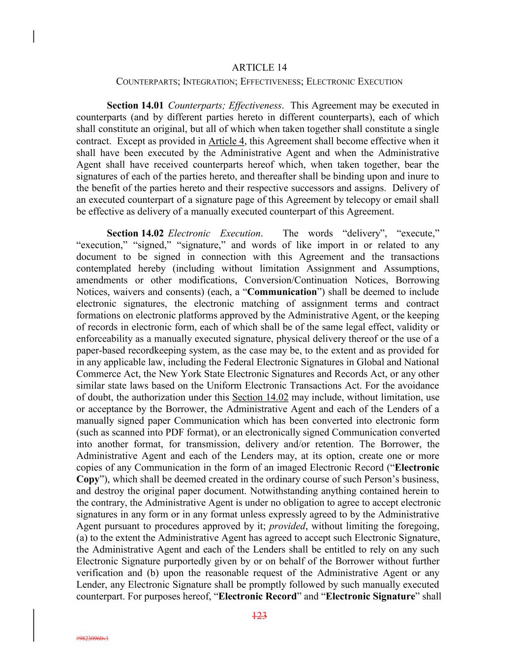ARTICLE 14 COUNTERPARTS; INTEGRATION; EFFECTIVENESS; ELECTRONIC EXECUTION Section 14.01 Counterparts; Effectiveness. This Agreement may be executed in counterparts (and by different parties hereto in different counterparts), each of which shall constitute an original, but all of which when taken together shall constitute a single contract. Except as provided in Article 4, this Agreement shall become effective when it shall have been executed by the Administrative Agent and when the Administrative Agent shall have received counterparts hereof which, when taken together, bear the signatures of each of the parties hereto, and thereafter shall be binding upon and inure to the benefit of the parties hereto and their respective successors and assigns. Delivery of an executed counterpart of a signature page of this Agreement by telecopy or email shall be effective as delivery of a manually executed counterpart of this Agreement. Section 14.02 Electronic Execution. The words “delivery”, “execute,” “execution,” “signed,” “signature,” and words of like import in or related to any document to be signed in connection with this Agreement and the transactions contemplated hereby (including without limitation Assignment and Assumptions, amendments or other modifications, Conversion/Continuation Notices, Borrowing Notices, waivers and consents) (each, a “Communication”) shall be deemed to include electronic signatures, the electronic matching of assignment terms and contract formations on electronic platforms approved by the Administrative Agent, or the keeping of records in electronic form, each of which shall be of the same legal effect, validity or enforceability as a manually executed signature, physical delivery thereof or the use of a paper-based recordkeeping system, as the case may be, to the extent and as provided for in any applicable law, including the Federal Electronic Signatures in Global and National Commerce Act, the New York State Electronic Signatures and Records Act, or any other similar state laws based on the Uniform Electronic Transactions Act. For the avoidance of doubt, the authorization under this Section 14.02 may include, without limitation, use or acceptance by the Borrower, the Administrative Agent and each of the Lenders of a manually signed paper Communication which has been converted into electronic form (such as scanned into PDF format), or an electronically signed Communication converted into another format, for transmission, delivery and/or retention. The Borrower, the Administrative Agent and each of the Lenders may, at its option, create one or more copies of any Communication in the form of an imaged Electronic Record (“Electronic Copy”), which shall be deemed created in the ordinary course of such Person’s business, and destroy the original paper document. Notwithstanding anything contained herein to the contrary, the Administrative Agent is under no obligation to agree to accept electronic signatures in any form or in any format unless expressly agreed to by the Administrative Agent pursuant to procedures approved by it; provided, without limiting the foregoing, (a) to the extent the Administrative Agent has agreed to accept such Electronic Signature, the Administrative Agent and each of the Lenders shall be entitled to rely on any such Electronic Signature purportedly given by or on behalf of the Borrower without further verification and (b) upon the reasonable request of the Administrative Agent or any Lender, any Electronic Signature shall be promptly followed by such manually executed counterpart. For purposes hereof, “Electronic Record” and “Electronic Signature” shall 123 #98230960v1