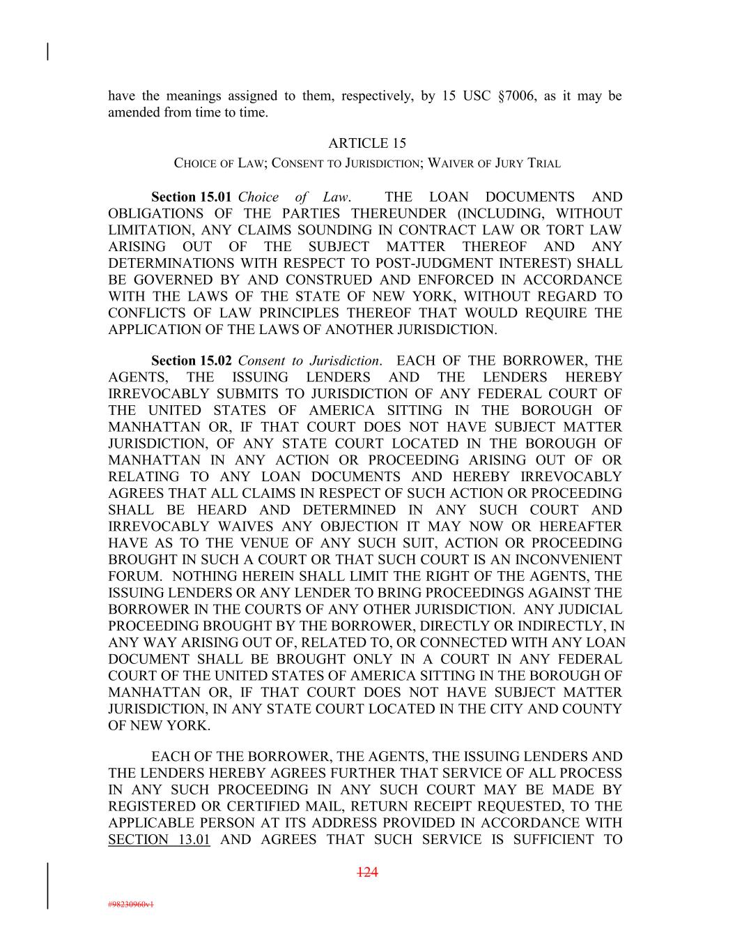 have the meanings assigned to them, respectively, by 15 USC §7006, as it may be amended from time to time. ARTICLE 15 CHOICE OF LAW; CONSENT TO JURISDICTION; WAIVER OF JURY TRIAL Section 15.01 Choice of Law. THE LOAN DOCUMENTS AND OBLIGATIONS OF THE PARTIES THEREUNDER (INCLUDING, WITHOUT LIMITATION, ANY CLAIMS SOUNDING IN CONTRACT LAW OR TORT LAW ARISING OUT OF THE SUBJECT MATTER THEREOF AND ANY DETERMINATIONS WITH RESPECT TO POST-JUDGMENT INTEREST) SHALL BE GOVERNED BY AND CONSTRUED AND ENFORCED IN ACCORDANCE WITH THE LAWS OF THE STATE OF NEW YORK, WITHOUT REGARD TO CONFLICTS OF LAW PRINCIPLES THEREOF THAT WOULD REQUIRE THE APPLICATION OF THE LAWS OF ANOTHER JURISDICTION. Section 15.02 Consent to Jurisdiction. EACH OF THE BORROWER, THE AGENTS, THE ISSUING LENDERS AND THE LENDERS HEREBY IRREVOCABLY SUBMITS TO JURISDICTION OF ANY FEDERAL COURT OF THE UNITED STATES OF AMERICA SITTING IN THE BOROUGH OF MANHATTAN OR, IF THAT COURT DOES NOT HAVE SUBJECT MATTER JURISDICTION, OF ANY STATE COURT LOCATED IN THE BOROUGH OF MANHATTAN IN ANY ACTION OR PROCEEDING ARISING OUT OF OR RELATING TO ANY LOAN DOCUMENTS AND HEREBY IRREVOCABLY AGREES THAT ALL CLAIMS IN RESPECT OF SUCH ACTION OR PROCEEDING SHALL BE HEARD AND DETERMINED IN ANY SUCH COURT AND IRREVOCABLY WAIVES ANY OBJECTION IT MAY NOW OR HEREAFTER HAVE AS TO THE VENUE OF ANY SUCH SUIT, ACTION OR PROCEEDING BROUGHT IN SUCH A COURT OR THAT SUCH COURT IS AN INCONVENIENT FORUM. NOTHING HEREIN SHALL LIMIT THE RIGHT OF THE AGENTS, THE ISSUING LENDERS OR ANY LENDER TO BRING PROCEEDINGS AGAINST THE BORROWER IN THE COURTS OF ANY OTHER JURISDICTION. ANY JUDICIAL PROCEEDING BROUGHT BY THE BORROWER, DIRECTLY OR INDIRECTLY, IN ANY WAY ARISING OUT OF, RELATED TO, OR CONNECTED WITH ANY LOAN DOCUMENT SHALL BE BROUGHT ONLY IN A COURT IN ANY FEDERAL COURT OF THE UNITED STATES OF AMERICA SITTING IN THE BOROUGH OF MANHATTAN OR, IF THAT COURT DOES NOT HAVE SUBJECT MATTER JURISDICTION, IN ANY STATE COURT LOCATED IN THE CITY AND COUNTY OF NEW YORK. EACH OF THE BORROWER, THE AGENTS, THE ISSUING LENDERS AND THE LENDERS HEREBY AGREES FURTHER THAT SERVICE OF ALL PROCESS IN ANY SUCH PROCEEDING IN ANY SUCH COURT MAY BE MADE BY REGISTERED OR CERTIFIED MAIL, RETURN RECEIPT REQUESTED, TO THE APPLICABLE PERSON AT ITS ADDRESS PROVIDED IN ACCORDANCE WITH SECTION 13.01 AND AGREES THAT SUCH SERVICE IS SUFFICIENT TO 124 #98230960v1