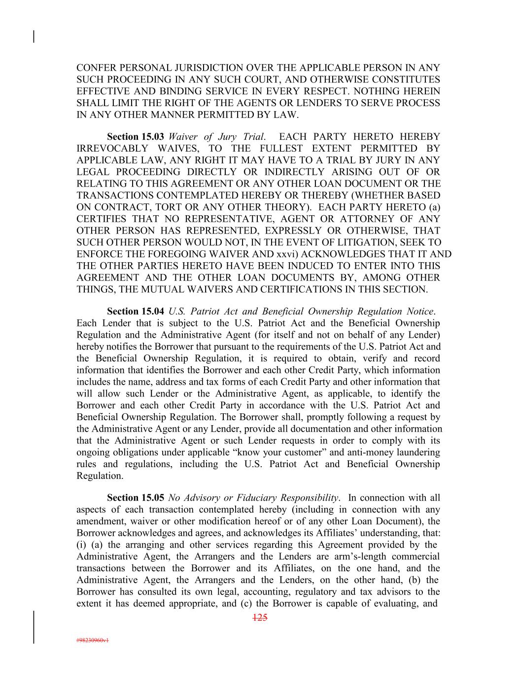 CONFER PERSONAL JURISDICTION OVER THE APPLICABLE PERSON IN ANY SUCH PROCEEDING IN ANY SUCH COURT, AND OTHERWISE CONSTITUTES EFFECTIVE AND BINDING SERVICE IN EVERY RESPECT. NOTHING HEREIN SHALL LIMIT THE RIGHT OF THE AGENTS OR LENDERS TO SERVE PROCESS IN ANY OTHER MANNER PERMITTED BY LAW. Section 15.03 Waiver of Jury Trial. EACH PARTY HERETO HEREBY IRREVOCABLY WAIVES, TO THE FULLEST EXTENT PERMITTED BY APPLICABLE LAW, ANY RIGHT IT MAY HAVE TO A TRIAL BY JURY IN ANY LEGAL PROCEEDING DIRECTLY OR INDIRECTLY ARISING OUT OF OR RELATING TO THIS AGREEMENT OR ANY OTHER LOAN DOCUMENT OR THE TRANSACTIONS CONTEMPLATED HEREBY OR THEREBY (WHETHER BASED ON CONTRACT, TORT OR ANY OTHER THEORY). EACH PARTY HERETO (a) CERTIFIES THAT NO REPRESENTATIVE, AGENT OR ATTORNEY OF ANY OTHER PERSON HAS REPRESENTED, EXPRESSLY OR OTHERWISE, THAT SUCH OTHER PERSON WOULD NOT, IN THE EVENT OF LITIGATION, SEEK TO ENFORCE THE FOREGOING WAIVER AND xxvi) ACKNOWLEDGES THAT IT AND THE OTHER PARTIES HERETO HAVE BEEN INDUCED TO ENTER INTO THIS AGREEMENT AND THE OTHER LOAN DOCUMENTS BY, AMONG OTHER THINGS, THE MUTUAL WAIVERS AND CERTIFICATIONS IN THIS SECTION. Section 15.04 U.S. Patriot Act and Beneficial Ownership Regulation Notice. Each Lender that is subject to the U.S. Patriot Act and the Beneficial Ownership Regulation and the Administrative Agent (for itself and not on behalf of any Lender) hereby notifies the Borrower that pursuant to the requirements of the U.S. Patriot Act and the Beneficial Ownership Regulation, it is required to obtain, verify and record information that identifies the Borrower and each other Credit Party, which information includes the name, address and tax forms of each Credit Party and other information that will allow such Lender or the Administrative Agent, as applicable, to identify the Borrower and each other Credit Party in accordance with the U.S. Patriot Act and Beneficial Ownership Regulation. The Borrower shall, promptly following a request by the Administrative Agent or any Lender, provide all documentation and other information that the Administrative Agent or such Lender requests in order to comply with its ongoing obligations under applicable “know your customer” and anti-money laundering rules and regulations, including the U.S. Patriot Act and Beneficial Ownership Regulation. Section 15.05 No Advisory or Fiduciary Responsibility. In connection with all aspects of each transaction contemplated hereby (including in connection with any amendment, waiver or other modification hereof or of any other Loan Document), the Borrower acknowledges and agrees, and acknowledges its Affiliates’ understanding, that: (i) (a) the arranging and other services regarding this Agreement provided by the Administrative Agent, the Arrangers and the Lenders are arm’s-length commercial transactions between the Borrower and its Affiliates, on the one hand, and the Administrative Agent, the Arrangers and the Lenders, on the other hand, (b) the Borrower has consulted its own legal, accounting, regulatory and tax advisors to the extent it has deemed appropriate, and (c) the Borrower is capable of evaluating, and 125 #98230960v1