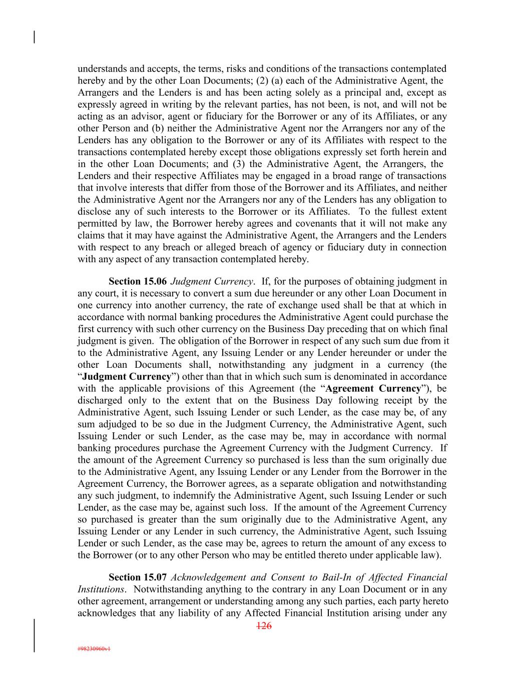 understands and accepts, the terms, risks and conditions of the transactions contemplated hereby and by the other Loan Documents; (2) (a) each of the Administrative Agent, the Arrangers and the Lenders is and has been acting solely as a principal and, except as expressly agreed in writing by the relevant parties, has not been, is not, and will not be acting as an advisor, agent or fiduciary for the Borrower or any of its Affiliates, or any other Person and (b) neither the Administrative Agent nor the Arrangers nor any of the Lenders has any obligation to the Borrower or any of its Affiliates with respect to the transactions contemplated hereby except those obligations expressly set forth herein and in the other Loan Documents; and (3) the Administrative Agent, the Arrangers, the Lenders and their respective Affiliates may be engaged in a broad range of transactions that involve interests that differ from those of the Borrower and its Affiliates, and neither the Administrative Agent nor the Arrangers nor any of the Lenders has any obligation to disclose any of such interests to the Borrower or its Affiliates. To the fullest extent permitted by law, the Borrower hereby agrees and covenants that it will not make any claims that it may have against the Administrative Agent, the Arrangers and the Lenders with respect to any breach or alleged breach of agency or fiduciary duty in connection with any aspect of any transaction contemplated hereby. Section 15.06 Judgment Currency. If, for the purposes of obtaining judgment in any court, it is necessary to convert a sum due hereunder or any other Loan Document in one currency into another currency, the rate of exchange used shall be that at which in accordance with normal banking procedures the Administrative Agent could purchase the first currency with such other currency on the Business Day preceding that on which final judgment is given. The obligation of the Borrower in respect of any such sum due from it to the Administrative Agent, any Issuing Lender or any Lender hereunder or under the other Loan Documents shall, notwithstanding any judgment in a currency (the “Judgment Currency”) other than that in which such sum is denominated in accordance with the applicable provisions of this Agreement (the “Agreement Currency”), be discharged only to the extent that on the Business Day following receipt by the Administrative Agent, such Issuing Lender or such Lender, as the case may be, of any sum adjudged to be so due in the Judgment Currency, the Administrative Agent, such Issuing Lender or such Lender, as the case may be, may in accordance with normal banking procedures purchase the Agreement Currency with the Judgment Currency. If the amount of the Agreement Currency so purchased is less than the sum originally due to the Administrative Agent, any Issuing Lender or any Lender from the Borrower in the Agreement Currency, the Borrower agrees, as a separate obligation and notwithstanding any such judgment, to indemnify the Administrative Agent, such Issuing Lender or such Lender, as the case may be, against such loss. If the amount of the Agreement Currency so purchased is greater than the sum originally due to the Administrative Agent, any Issuing Lender or any Lender in such currency, the Administrative Agent, such Issuing Lender or such Lender, as the case may be, agrees to return the amount of any excess to the Borrower (or to any other Person who may be entitled thereto under applicable law). Section 15.07 Acknowledgement and Consent to Bail-In of Affected Financial Institutions. Notwithstanding anything to the contrary in any Loan Document or in any other agreement, arrangement or understanding among any such parties, each party hereto acknowledges that any liability of any Affected Financial Institution arising under any 126 #98230960v1