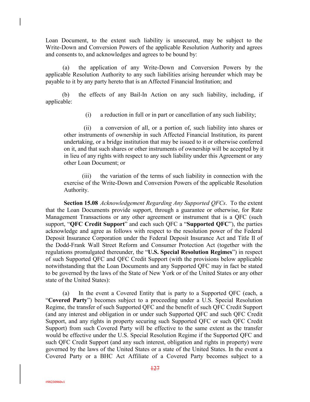 Loan Document, to the extent such liability is unsecured, may be subject to the Write-Down and Conversion Powers of the applicable Resolution Authority and agrees and consents to, and acknowledges and agrees to be bound by: (a) the application of any Write-Down and Conversion Powers by the applicable Resolution Authority to any such liabilities arising hereunder which may be payable to it by any party hereto that is an Affected Financial Institution; and (b) the effects of any Bail-In Action on any such liability, including, if applicable: (i) a reduction in full or in part or cancellation of any such liability; (ii) a conversion of all, or a portion of, such liability into shares or other instruments of ownership in such Affected Financial Institution, its parent undertaking, or a bridge institution that may be issued to it or otherwise conferred on it, and that such shares or other instruments of ownership will be accepted by it in lieu of any rights with respect to any such liability under this Agreement or any other Loan Document; or (iii) the variation of the terms of such liability in connection with the exercise of the Write-Down and Conversion Powers of the applicable Resolution Authority. Section 15.08 Acknowledgement Regarding Any Supported QFCs. To the extent that the Loan Documents provide support, through a guarantee or otherwise, for Rate Management Transactions or any other agreement or instrument that is a QFC (such support, “QFC Credit Support” and each such QFC a “Supported QFC”), the parties acknowledge and agree as follows with respect to the resolution power of the Federal Deposit Insurance Corporation under the Federal Deposit Insurance Act and Title II of the Dodd-Frank Wall Street Reform and Consumer Protection Act (together with the regulations promulgated thereunder, the “U.S. Special Resolution Regimes”) in respect of such Supported QFC and QFC Credit Support (with the provisions below applicable notwithstanding that the Loan Documents and any Supported QFC may in fact be stated to be governed by the laws of the State of New York or of the United States or any other state of the United States): (a) In the event a Covered Entity that is party to a Supported QFC (each, a “Covered Party”) becomes subject to a proceeding under a U.S. Special Resolution Regime, the transfer of such Supported QFC and the benefit of such QFC Credit Support (and any interest and obligation in or under such Supported QFC and such QFC Credit Support, and any rights in property securing such Supported QFC or such QFC Credit Support) from such Covered Party will be effective to the same extent as the transfer would be effective under the U.S. Special Resolution Regime if the Supported QFC and such QFC Credit Support (and any such interest, obligation and rights in property) were governed by the laws of the United States or a state of the United States. In the event a Covered Party or a BHC Act Affiliate of a Covered Party becomes subject to a 127 #98230960v1