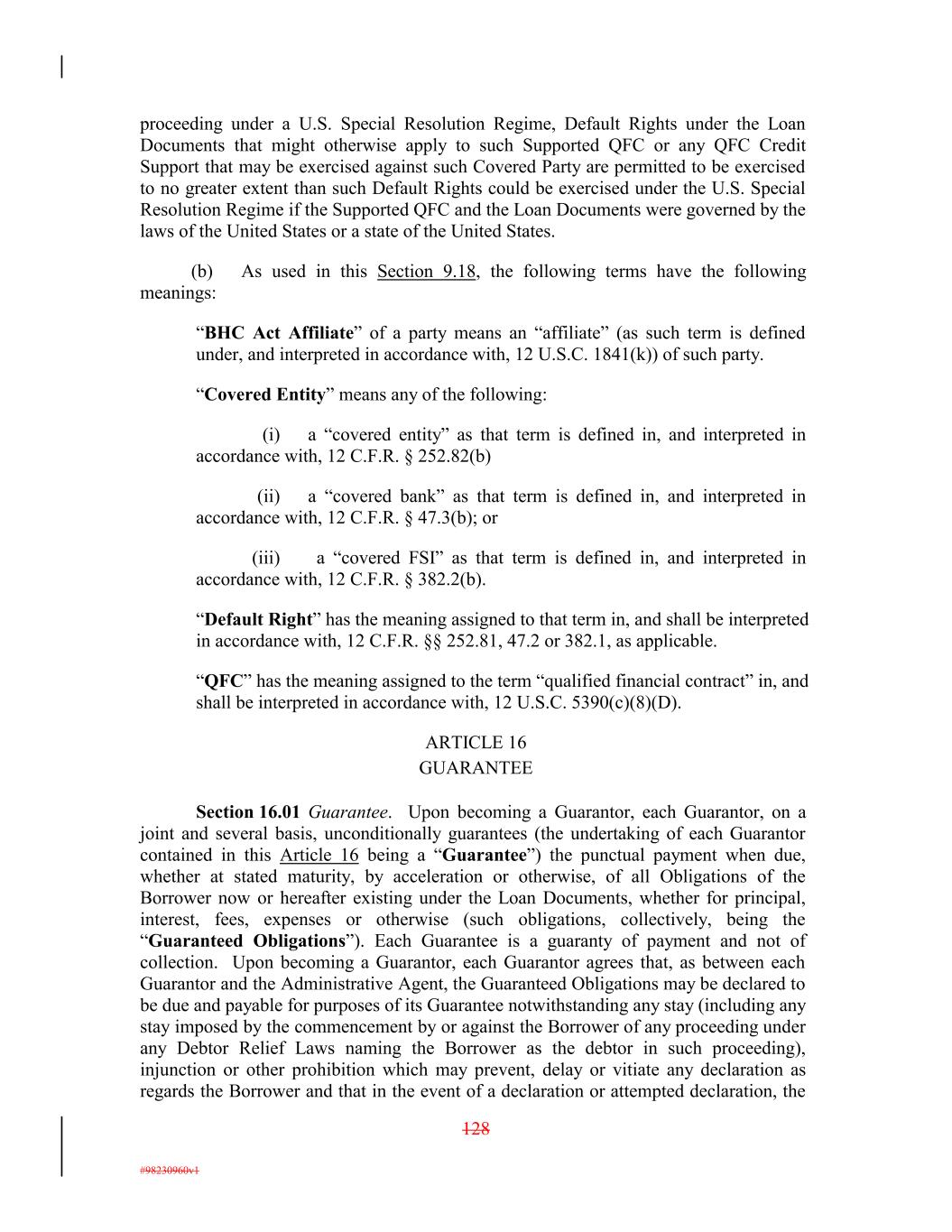 proceeding under a U.S. Special Resolution Regime, Default Rights under the Loan Documents that might otherwise apply to such Supported QFC or any QFC Credit Support that may be exercised against such Covered Party are permitted to be exercised to no greater extent than such Default Rights could be exercised under the U.S. Special Resolution Regime if the Supported QFC and the Loan Documents were governed by the laws of the United States or a state of the United States. (b) As used in this Section 9.18, the following terms have the following meanings: “BHC Act Affiliate” of a party means an “affiliate” (as such term is defined under, and interpreted in accordance with, 12 U.S.C. 1841(k)) of such party. “Covered Entity” means any of the following: (i) a “covered entity” as that term is defined in, and interpreted in accordance with, 12 C.F.R. § 252.82(b) (ii) a “covered bank” as that term is defined in, and interpreted in accordance with, 12 C.F.R. § 47.3(b); or (iii) a “covered FSI” as that term is defined in, and interpreted in accordance with, 12 C.F.R. § 382.2(b). “Default Right” has the meaning assigned to that term in, and shall be interpreted in accordance with, 12 C.F.R. §§ 252.81, 47.2 or 382.1, as applicable. “QFC” has the meaning assigned to the term “qualified financial contract” in, and shall be interpreted in accordance with, 12 U.S.C. 5390(c)(8)(D). ARTICLE 16 GUARANTEE Section 16.01 Guarantee. Upon becoming a Guarantor, each Guarantor, on a joint and several basis, unconditionally guarantees (the undertaking of each Guarantor contained in this Article 16 being a “Guarantee”) the punctual payment when due, whether at stated maturity, by acceleration or otherwise, of all Obligations of the Borrower now or hereafter existing under the Loan Documents, whether for principal, interest, fees, expenses or otherwise (such obligations, collectively, being the “Guaranteed Obligations”). Each Guarantee is a guaranty of payment and not of collection. Upon becoming a Guarantor, each Guarantor agrees that, as between each Guarantor and the Administrative Agent, the Guaranteed Obligations may be declared to be due and payable for purposes of its Guarantee notwithstanding any stay (including any stay imposed by the commencement by or against the Borrower of any proceeding under any Debtor Relief Laws naming the Borrower as the debtor in such proceeding), injunction or other prohibition which may prevent, delay or vitiate any declaration as regards the Borrower and that in the event of a declaration or attempted declaration, the 128 #98230960v1