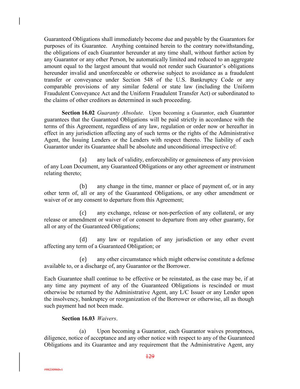 Guaranteed Obligations shall immediately become due and payable by the Guarantors for purposes of its Guarantee. Anything contained herein to the contrary notwithstanding, the obligations of each Guarantor hereunder at any time shall, without further action by any Guarantor or any other Person, be automatically limited and reduced to an aggregate amount equal to the largest amount that would not render such Guarantor’s obligations hereunder invalid and unenforceable or otherwise subject to avoidance as a fraudulent transfer or conveyance under Section 548 of the U.S. Bankruptcy Code or any comparable provisions of any similar federal or state law (including the Uniform Fraudulent Conveyance Act and the Uniform Fraudulent Transfer Act) or subordinated to the claims of other creditors as determined in such proceeding. Section 16.02 Guaranty Absolute. Upon becoming a Guarantor, each Guarantor guarantees that the Guaranteed Obligations will be paid strictly in accordance with the terms of this Agreement, regardless of any law, regulation or order now or hereafter in effect in any jurisdiction affecting any of such terms or the rights of the Administrative Agent, the Issuing Lenders or the Lenders with respect thereto. The liability of each Guarantor under its Guarantee shall be absolute and unconditional irrespective of: (a) any lack of validity, enforceability or genuineness of any provision of any Loan Document, any Guaranteed Obligations or any other agreement or instrument relating thereto; (b) any change in the time, manner or place of payment of, or in any other term of, all or any of the Guaranteed Obligations, or any other amendment or waiver of or any consent to departure from this Agreement; (c) any exchange, release or non-perfection of any collateral, or any release or amendment or waiver of or consent to departure from any other guaranty, for all or any of the Guaranteed Obligations; (d) any law or regulation of any jurisdiction or any other event affecting any term of a Guaranteed Obligation; or (e) any other circumstance which might otherwise constitute a defense available to, or a discharge of, any Guarantor or the Borrower. Each Guarantee shall continue to be effective or be reinstated, as the case may be, if at any time any payment of any of the Guaranteed Obligations is rescinded or must otherwise be returned by the Administrative Agent, any L/C Issuer or any Lender upon the insolvency, bankruptcy or reorganization of the Borrower or otherwise, all as though such payment had not been made. Section 16.03 Waivers. (a) Upon becoming a Guarantor, each Guarantor waives promptness, diligence, notice of acceptance and any other notice with respect to any of the Guaranteed Obligations and its Guarantee and any requirement that the Administrative Agent, any 129 #98230960v1