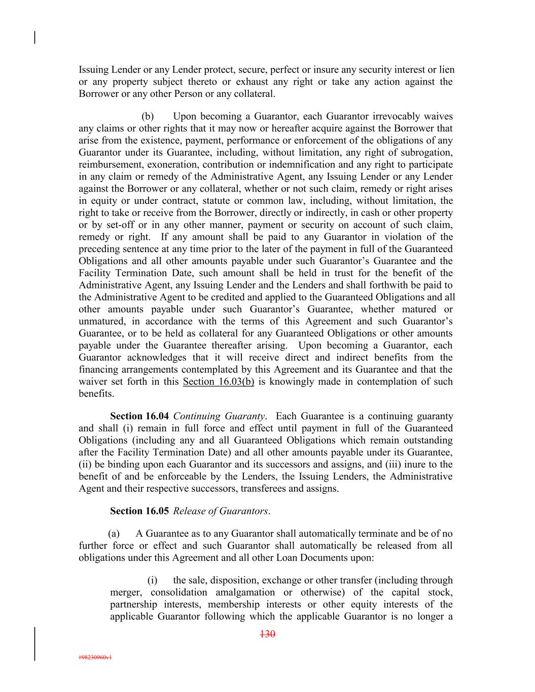 Issuing Lender or any Lender protect, secure, perfect or insure any security interest or lien or any property subject thereto or exhaust any right or take any action against the Borrower or any other Person or any collateral. (b) Upon becoming a Guarantor, each Guarantor irrevocably waives any claims or other rights that it may now or hereafter acquire against the Borrower that arise from the existence, payment, performance or enforcement of the obligations of any Guarantor under its Guarantee, including, without limitation, any right of subrogation, reimbursement, exoneration, contribution or indemnification and any right to participate in any claim or remedy of the Administrative Agent, any Issuing Lender or any Lender against the Borrower or any collateral, whether or not such claim, remedy or right arises in equity or under contract, statute or common law, including, without limitation, the right to take or receive from the Borrower, directly or indirectly, in cash or other property or by set-off or in any other manner, payment or security on account of such claim, remedy or right. If any amount shall be paid to any Guarantor in violation of the preceding sentence at any time prior to the later of the payment in full of the Guaranteed Obligations and all other amounts payable under such Guarantor’s Guarantee and the Facility Termination Date, such amount shall be held in trust for the benefit of the Administrative Agent, any Issuing Lender and the Lenders and shall forthwith be paid to the Administrative Agent to be credited and applied to the Guaranteed Obligations and all other amounts payable under such Guarantor’s Guarantee, whether matured or unmatured, in accordance with the terms of this Agreement and such Guarantor’s Guarantee, or to be held as collateral for any Guaranteed Obligations or other amounts payable under the Guarantee thereafter arising. Upon becoming a Guarantor, each Guarantor acknowledges that it will receive direct and indirect benefits from the financing arrangements contemplated by this Agreement and its Guarantee and that the waiver set forth in this Section 16.03(b) is knowingly made in contemplation of such benefits. Section 16.04 Continuing Guaranty. Each Guarantee is a continuing guaranty and shall (i) remain in full force and effect until payment in full of the Guaranteed Obligations (including any and all Guaranteed Obligations which remain outstanding after the Facility Termination Date) and all other amounts payable under its Guarantee, (ii) be binding upon each Guarantor and its successors and assigns, and (iii) inure to the benefit of and be enforceable by the Lenders, the Issuing Lenders, the Administrative Agent and their respective successors, transferees and assigns. Section 16.05 Release of Guarantors. (a) A Guarantee as to any Guarantor shall automatically terminate and be of no further force or effect and such Guarantor shall automatically be released from all obligations under this Agreement and all other Loan Documents upon: (i) the sale, disposition, exchange or other transfer (including through merger, consolidation amalgamation or otherwise) of the capital stock, partnership interests, membership interests or other equity interests of the applicable Guarantor following which the applicable Guarantor is no longer a 130 #98230960v1