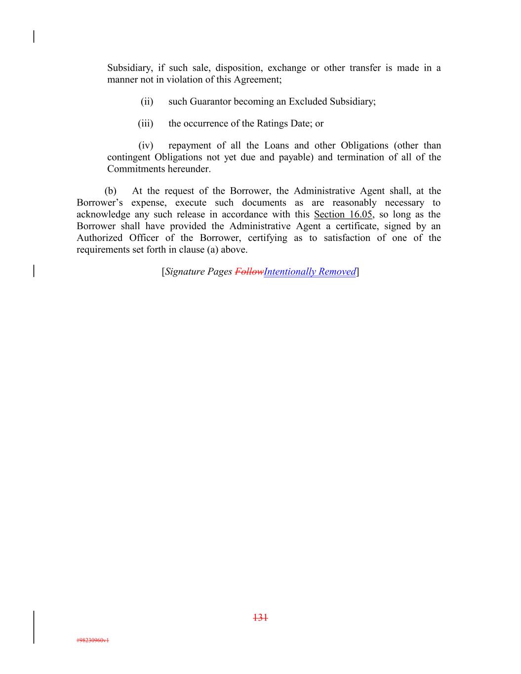 Subsidiary, if such sale, disposition, exchange or other transfer is made in a manner not in violation of this Agreement; (ii) such Guarantor becoming an Excluded Subsidiary; (iii) the occurrence of the Ratings Date; or (iv) repayment of all the Loans and other Obligations (other than contingent Obligations not yet due and payable) and termination of all of the Commitments hereunder. (b) At the request of the Borrower, the Administrative Agent shall, at the Borrower’s expense, execute such documents as are reasonably necessary to acknowledge any such release in accordance with this Section 16.05, so long as the Borrower shall have provided the Administrative Agent a certificate, signed by an Authorized Officer of the Borrower, certifying as to satisfaction of one of the requirements set forth in clause (a) above. [Signature Pages FollowIntentionally Removed] 131 #98230960v1
