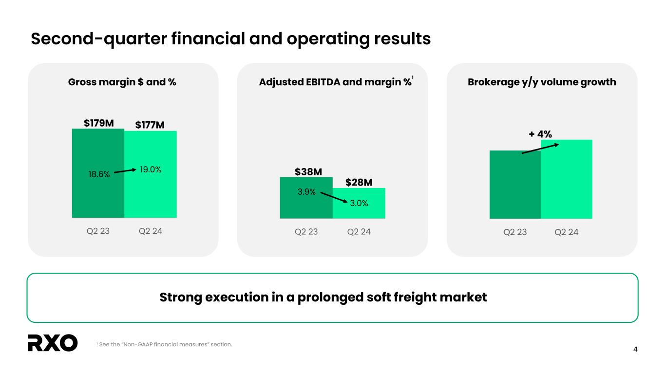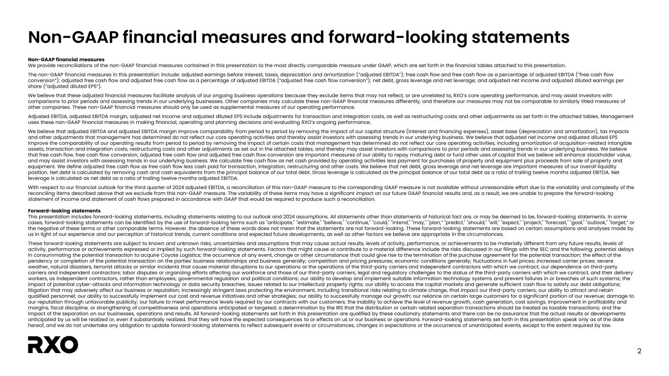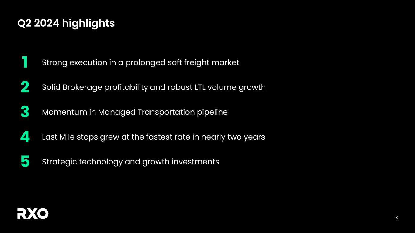 2 Non-GAAP financial measures and forward-looking statements Non-GAAP financial measures We provide reconciliations of the non-GAAP financial measures contained in this presentation to the most directly comparable measure under GAAP, which are set forth in the financial tables attached to this presentation. The non-GAAP financial measures in this presentation include: adjusted earnings before interest, taxes, depreciation and amortization (“adjusted EBITDA”); free cash flow and free cash flow as a percentage of adjusted EBITDA (“free cash flow conversion”); adjusted free cash flow and adjusted free cash flow as a percentage of adjusted EBITDA (“adjusted free cash flow conversion”); net debt, gross leverage and net leverage; and adjusted net income and adjusted diluted earnings per share (“adjusted diluted EPS”). We believe that these adjusted financial measures facilitate analysis of our ongoing business operations because they exclude items that may not reflect, or are unrelated to, RXO’s core operating performance, and may assist investors with comparisons to prior periods and assessing trends in our underlying businesses. Other companies may calculate these non-GAAP financial measures differently, and therefore our measures may not be comparable to similarly titled measures of other companies. These non-GAAP financial measures should only be used as supplemental measures of our operating performance. Adjusted EBITDA, adjusted EBITDA margin, adjusted net income and adjusted diluted EPS include adjustments for transaction and integration costs, as well as restructuring costs and other adjustments as set forth in the attached tables. Management uses these non-GAAP financial measures in making financial, operating and planning decisions and evaluating RXO’s ongoing performance. We believe that adjusted EBITDA and adjusted EBITDA margin improve comparability from period to period by removing the impact of our capital structure (interest and financing expenses), asset base (depreciation and amortization), tax impacts and other adjustments that management has determined do not reflect our core operating activities and thereby assist investors with assessing trends in our underlying business. We believe that adjusted net income and adjusted diluted EPS improve the comparability of our operating results from period to period by removing the impact of certain costs that management has determined do not reflect our core operating activities, including amortization of acquisition-related intangible assets, transaction and integration costs, restructuring costs and other adjustments as set out in the attached tables, and thereby may assist investors with comparisons to prior periods and assessing trends in our underlying business. We believe that free cash flow, free cash flow conversion, adjusted free cash flow and adjusted free cash flow conversion are important measures of our ability to repay maturing debt or fund other uses of capital that we believe will enhance stockholder value, and may assist investors with assessing trends in our underlying business. We calculate free cash flow as net cash provided by operating activities less payment for purchases of property and equipment plus proceeds from sale of property and equipment. We define adjusted free cash flow as free cash flow less cash paid for transaction, integration, restructuring and other costs. We believe that net debt, gross leverage and net leverage are important measures of our overall liquidity position. Net debt is calculated by removing cash and cash equivalents from the principal balance of our total debt. Gross leverage is calculated as the principal balance of our total debt as a ratio of trailing twelve months adjusted EBITDA. Net leverage is calculated as net debt as a ratio of trailing twelve months adjusted EBITDA. With respect to our financial outlook for the third quarter of 2024 adjusted EBITDA, a reconciliation of this non-GAAP measure to the corresponding GAAP measure is not available without unreasonable effort due to the variability and complexity of the reconciling items described above that we exclude from this non-GAAP measure. The variability of these items may have a significant impact on our future GAAP financial results and, as a result, we are unable to prepare the forward-looking statement of income and statement of cash flows prepared in accordance with GAAP that would be required to produce such a reconciliation. Forward-looking statements This presentation includes forward-looking statements, including statements relating to our outlook and 2024 assumptions. All statements other than statements of historical fact are, or may be deemed to be, forward-looking statements. In some cases, forward-looking statements can be identified by the use of forward-looking terms such as "anticipate," "estimate," "believe," "continue," "could," "intend," "may," "plan,“ "predict," "should," "will," "expect," "project," "forecast," "goal," "outlook," "target,” or the negative of these terms or other comparable terms. However, the absence of these words does not mean that the statements are not forward-looking. These forward-looking statements are based on certain assumptions and analyses made by us in light of our experience and our perception of historical trends, current conditions and expected future developments, as well as other factors we believe are appropriate in the circumstances. These forward-looking statements are subject to known and unknown risks, uncertainties and assumptions that may cause actual results, levels of activity, performance, or achievements to be materially different from any future results, levels of activity, performance or achievements expressed or implied by such forward-looking statements. Factors that might cause or contribute to a material difference include the risks discussed in our filings with the SEC and the following: potential delays in consummating the 
