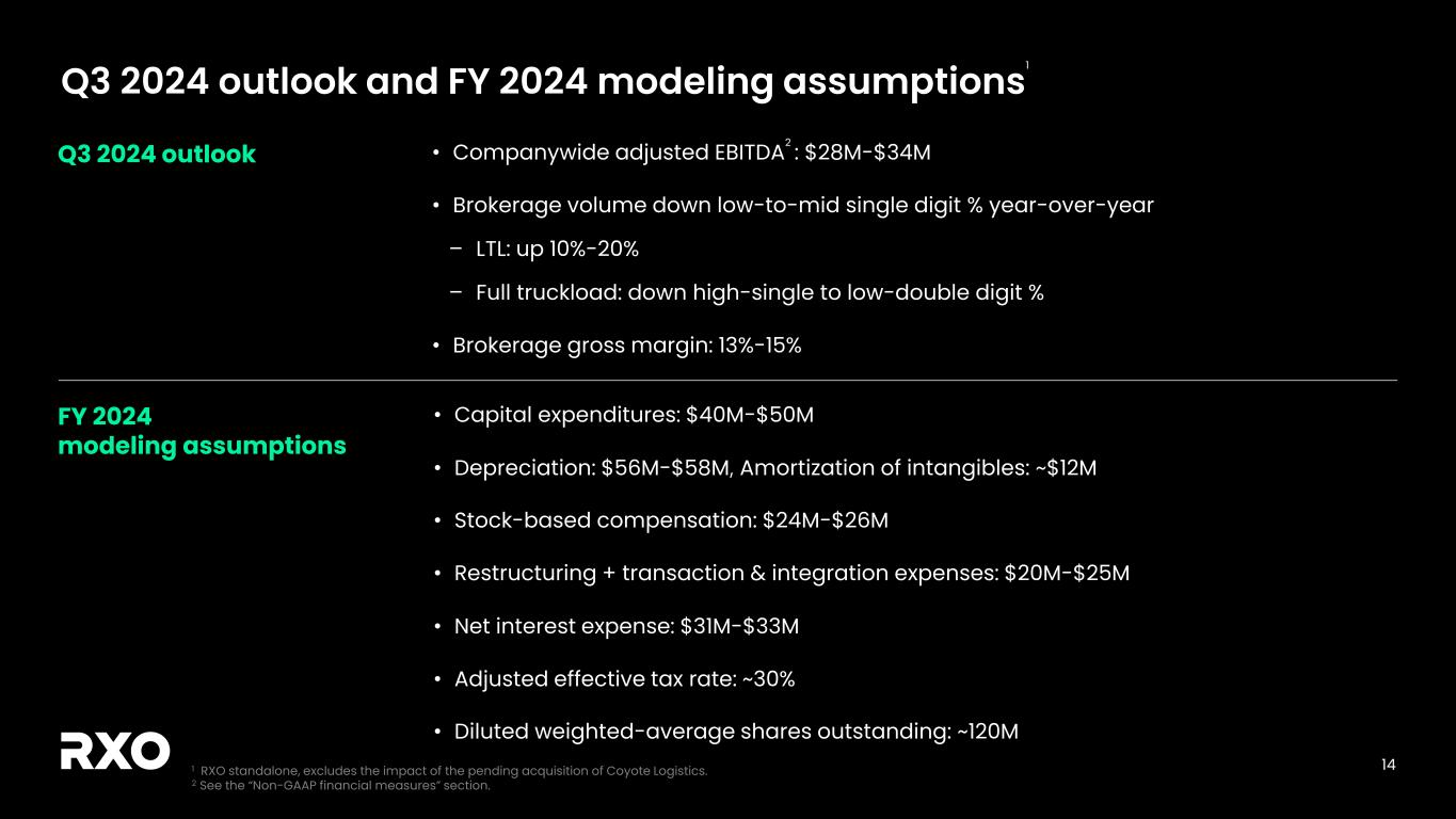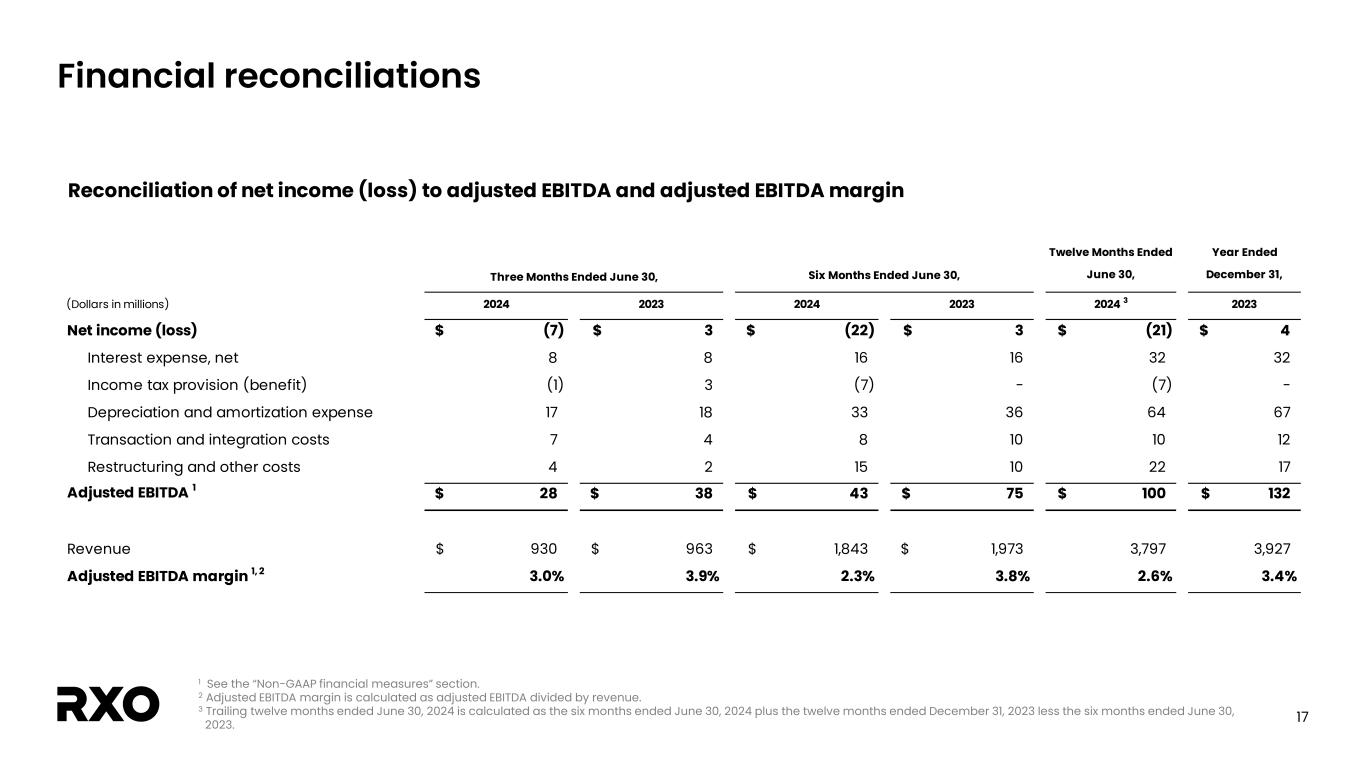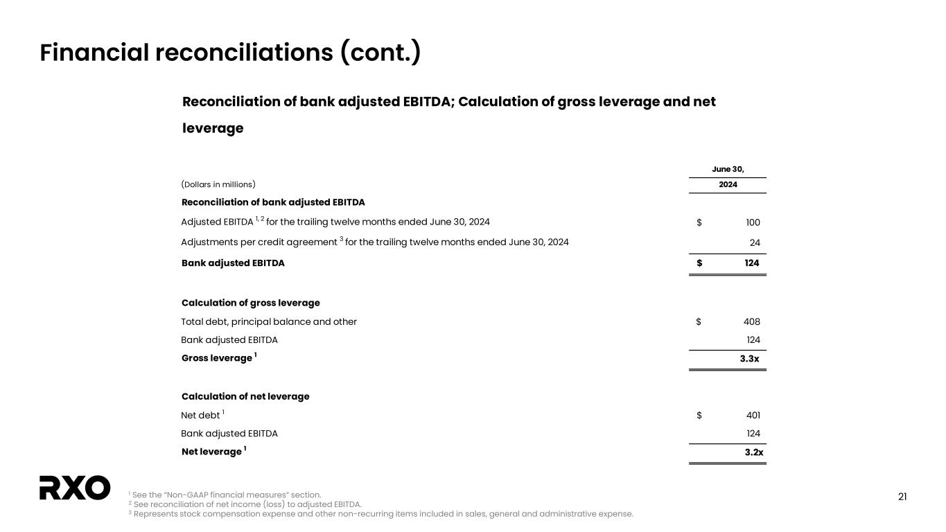 2 Non-GAAP financial measures and forward-looking statements Non-GAAP financial measures We provide reconciliations of the non-GAAP financial measures contained in this presentation to the most directly comparable measure under GAAP, which are set forth in the financial tables attached to this presentation. The non-GAAP financial measures in this presentation include: adjusted earnings before interest, taxes, depreciation and amortization (“adjusted EBITDA”); free cash flow and free cash flow as a percentage of adjusted EBITDA (“free cash flow conversion”); adjusted free cash flow and adjusted free cash flow as a percentage of adjusted EBITDA (“adjusted free cash flow conversion”); net debt, gross leverage and net leverage; and adjusted net income and adjusted diluted earnings per share (“adjusted diluted EPS”). We believe that these adjusted financial measures facilitate analysis of our ongoing business operations because they exclude items that may not reflect, or are unrelated to, RXO’s core operating performance, and may assist investors with comparisons to prior periods and assessing trends in our underlying businesses. Other companies may calculate these non-GAAP financial measures differently, and therefore our measures may not be comparable to similarly titled measures of other companies. These non-GAAP financial measures should only be used as supplemental measures of our operating performance. Adjusted EBITDA, adjusted EBITDA margin, adjusted net income and adjusted diluted EPS include adjustments for transaction and integration costs, as well as restructuring costs and other adjustments as set forth in the attached tables. Management uses these non-GAAP financial measures in making financial, operating and planning decisions and evaluating RXO’s ongoing performance. We believe that adjusted EBITDA and adjusted EBITDA margin improve comparability from period to period by removing the impact of our capital structure (interest and financing expenses), asset base (depreciation and amortization), tax impacts and other adjustments that management has determined do not reflect our core operating activities and thereby assist investors with assessing trends in our underlying business. We believe that adjusted net income and adjusted diluted EPS improve the comparability of our operating results from period to period by removing the impact of certain costs that management has determined do not reflect our core operating activities, including amortization of acquisition-related intangible assets, transaction and integration costs, restructuring costs and other adjustments as set out in the attached tables, and thereby may assist investors with comparisons to prior periods and assessing trends in our underlying business. We believe that free cash flow, free cash flow conversion, adjusted free cash flow and adjusted free cash flow conversion are important measures of our ability to repay maturing debt or fund other uses of capital that we believe will enhance stockholder value, and may assist investors with assessing trends in our underlying business. We calculate free cash flow as net cash provided by operating activities less payment for purchases of property and equipment plus proceeds from sale of property and equipment. We define adjusted free cash flow as free cash flow less cash paid for transaction, integration, restructuring and other costs. We believe that net debt, gross leverage and net leverage are important measures of our overall liquidity position. Net debt is calculated by removing cash and cash equivalents from the principal balance of our total debt. Gross leverage is calculated as the principal balance of our total debt as a ratio of trailing twelve months adjusted EBITDA. Net leverage is calculated as net debt as a ratio of trailing twelve months adjusted EBITDA. With respect to our financial outlook for the third quarter of 2024 adjusted EBITDA, a reconciliation of this non-GAAP measure to the corresponding GAAP measure is not available without unreasonable effort due to the variability and complexity of the reconciling items described above that we exclude from this non-GAAP measure. The variability of these items may have a significant impact on our future GAAP financial results and, as a result, we are unable to prepare the forward-looking statement of income and statement of cash flows prepared in accordance with GAAP that would be required to produce such a reconciliation. Forward-looking statements This presentation includes forward-looking statements, including statements relating to our outlook and 2024 assumptions. All statements other than statements of historical fact are, or may be deemed to be, forward-looking statements. In some cases, forward-looking statements can be identified by the use of forward-looking terms such as "anticipate," "estimate," "believe," "continue," "could," "intend," "may," "plan,“ "predict," "should," "will," "expect," "project," "forecast," "goal," "outlook," "target,” or the negative of these terms or other comparable terms. However, the absence of these words does not mean that the statements are not forward-looking. These forward-looking statements are based on certain assumptions and analyses made by us in light of our experience and our perception of historical trends, current conditions and expected future developments, as well as other factors we believe are appropriate in the circumstances. These forward-looking statements are subject to known and unknown risks, uncertainties and assumptions that may cause actual results, levels of activity, performance, or achievements to be materially different from any future results, levels of activity, performance or achievements expressed or implied by such forward-looking statements. Factors that might cause or contribute to a material difference include the risks discussed in our filings with the SEC and the following: potential delays in consummating the 