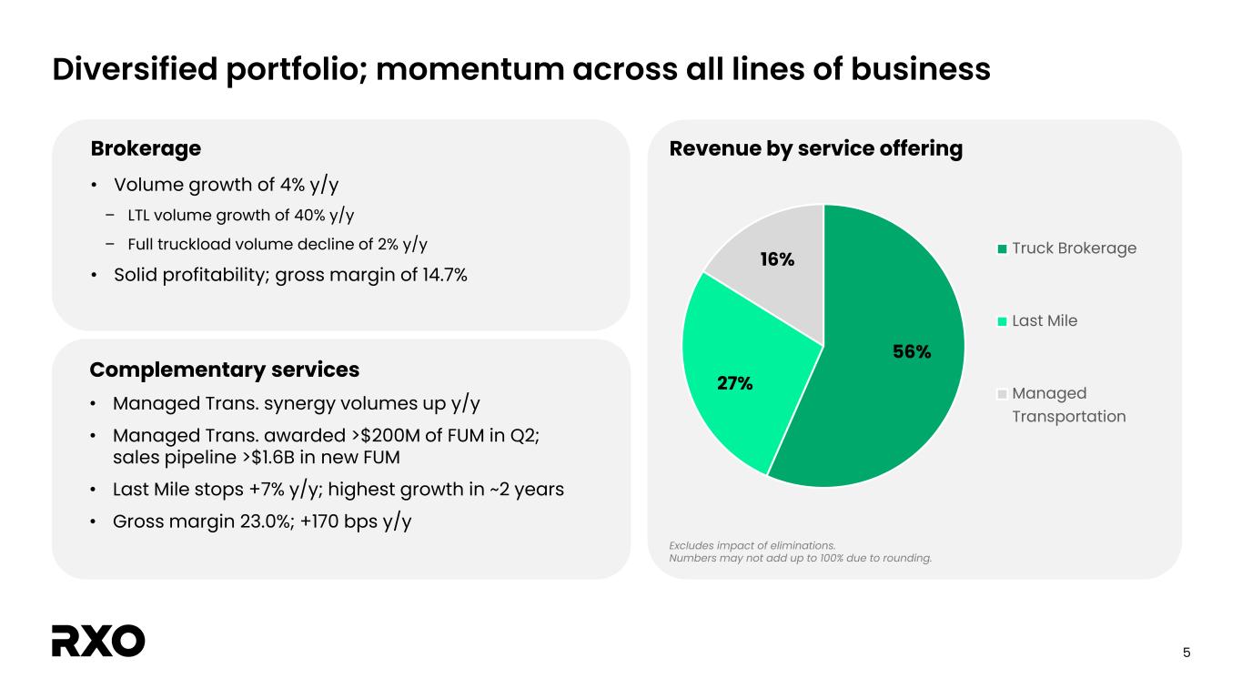 4 Second-quarter financial and operating results Strong execution in a prolonged soft freight market Adjusted EBITDA and margin %1 Brokerage y/y volume growth $179M $177M $100 $110 $120 $130 $140 $150 $160 $170 $180 $190 $200 Q2 23 Q2 24 19.0%18.6% Gross margin $ and % 1 See the “Non-GAAP financial measures” section. $38M $28M 540.00% 545.00% 550.00% 555.00% 560.00% 565.00% 570.00% 575.00% 580.00% 585.00% 590.00% $0 $10 $20 $30 $40 $50 $60 $70 $80 $90 $100 Q2 23 Q2 24 3.0% 3.9%