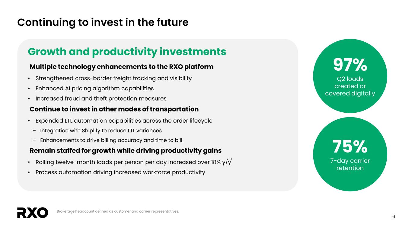 5 Diversified portfolio; momentum across all lines of business Revenue by service offering 56% 27% 16% Truck Brokerage Last Mile Managed Transportation Excludes impact of eliminations. Numbers may not add up to 100% due to rounding. Brokerage • Volume growth of 4% y/y – LTL volume growth of 40% y/y – Full truckload volume decline of 2% y/y • Solid profitability; gross margin of 14.7% Complementary services • Managed Trans. synergy volumes up y/y • Managed Trans. awarded >$200M of FUM in Q2; sales pipeline >$1.6B in new FUM • Last Mile stops +7% y/y; highest growth in ~2 years • Gross margin 23.0%; +170 bps y/y
