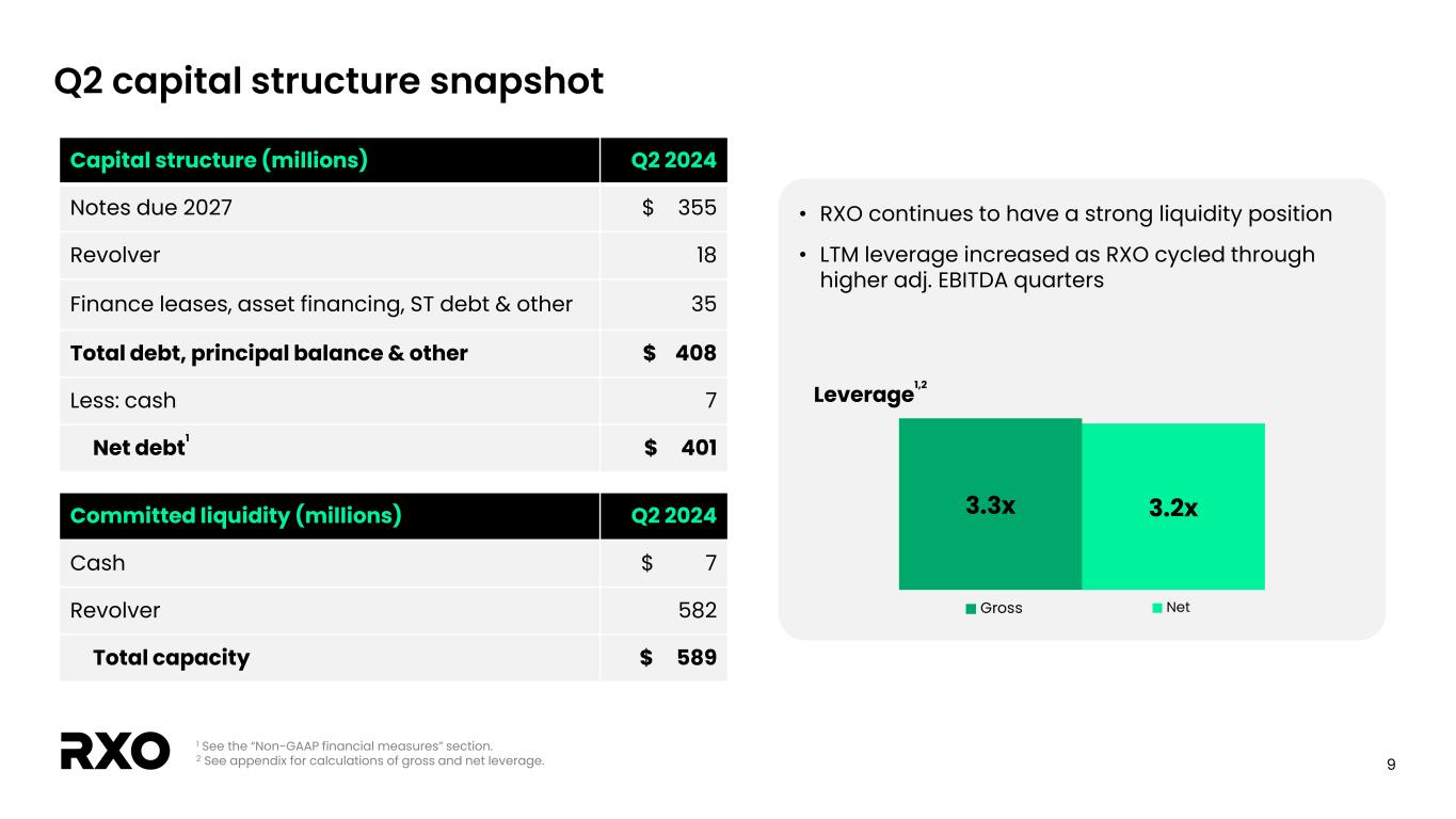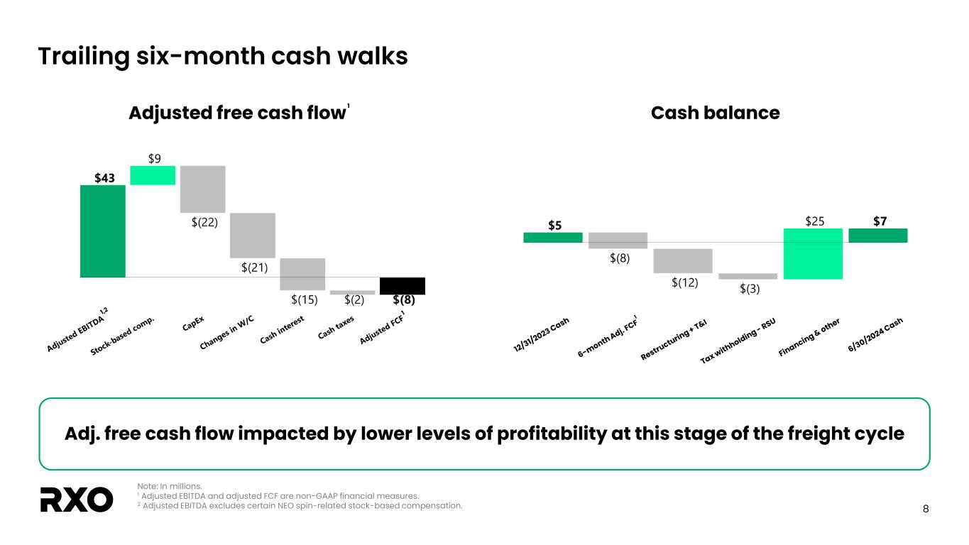 7 Q2 2024 adjusted EPS bridge Earnings per share Q2-24 Q2-23 GAAP diluted EPS $(0.06) $ 0.03 Amortization of intangible assets 0.03 0.03 Transaction, integration and restructuring costs 0.09 0.05 Income tax associated with adjustments above1 (0.03) (0.03) Adjusted diluted EPS2 $0.03 $ 0.08 RXO reported Q2 2024 adjusted diluted EPS of $0.03 1 The tax impact of non-GAAP adjustments represents the tax benefit (expense) calculated using the applicable statutory tax rate that would have been incurred had these adjustments been excluded from net income (loss). Our estimated tax rate on non-GAAP adjustments may differ from our GAAP tax rate due to differences in the methodologies applied. 2 See the “Non-GAAP financial measures” section.