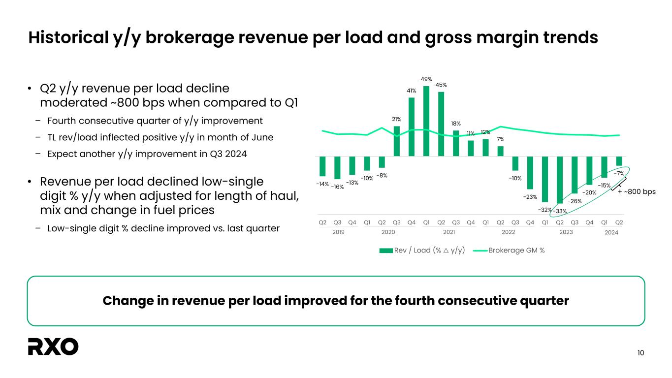 9 Q2 capital structure snapshot Capital structure (millions) Q2 2024 Notes due 2027 $ 355 Revolver 18 Finance leases, asset financing, ST debt & other 35 Total debt, principal balance & other $ 408 Less: cash 7 Net debt1 $ 401 Committed liquidity (millions) Q2 2024 Cash $ 7 Revolver 582 Total capacity $ 589 1 See the “Non-GAAP financial measures” section. 2 See appendix for calculations of gross and net leverage. • RXO continues to have a strong liquidity position • LTM leverage increased as RXO cycled through higher adj. EBITDA quarters 3.3x 3.2x Leverage1,2