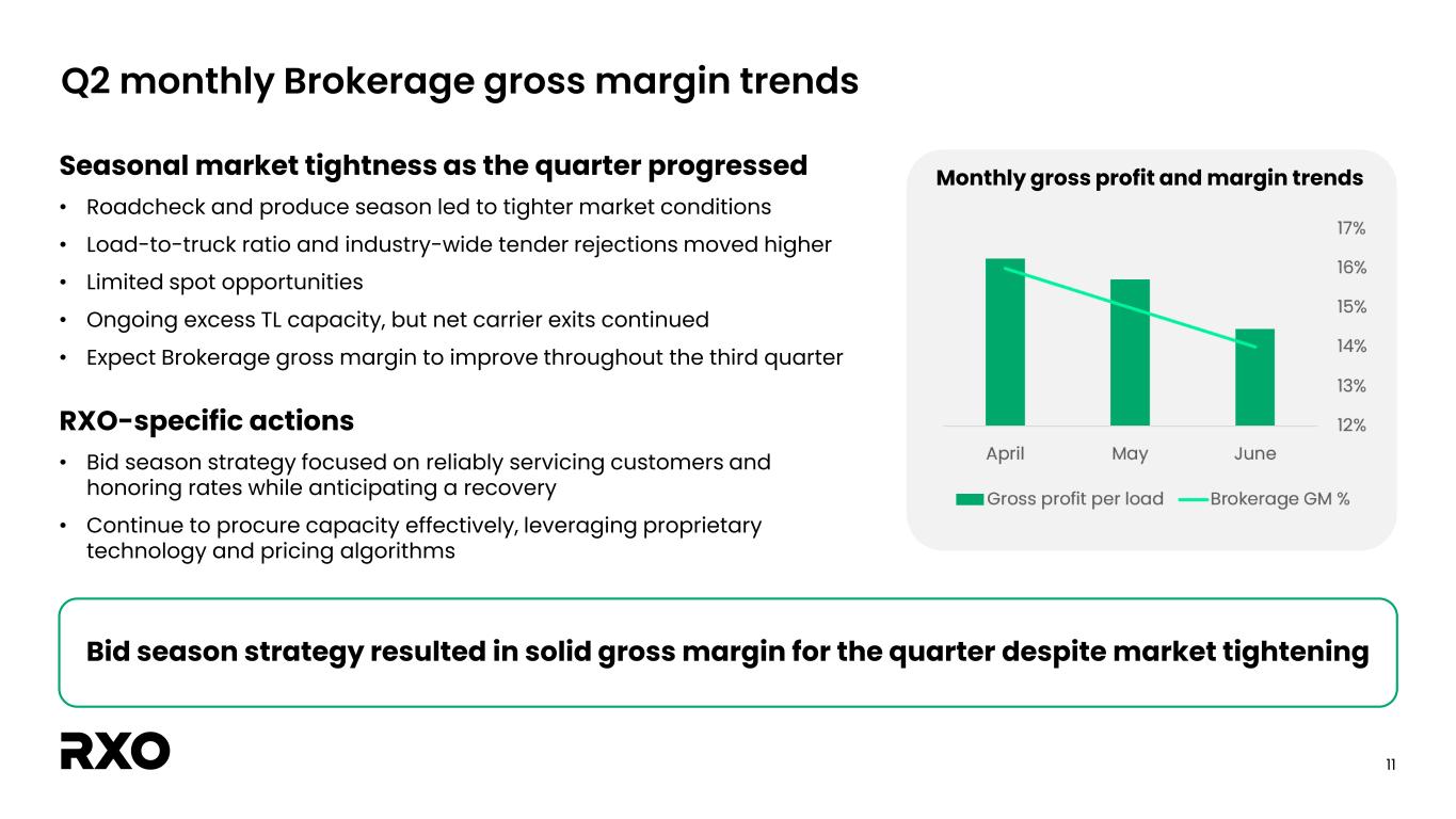 10 -14% -16% -13% -10% -8% 21% 41% 49% 45% 18% 11% 12% 7% -10% -23% -32% -33% -26% -20% -15% -7% Q2 Q3 Q4 Q1 Q2 Q3 Q4 Q1 Q2 Q3 Q4 Q1 Q2 Q3 Q4 Q1 Q2 Q3 Q4 Q1 Q2 Rev / Load (% △ y/y) Brokerage GM % Historical y/y brokerage revenue per load and gross margin trends Change in revenue per load improved for the fourth consecutive quarter • Q2 y/y revenue per load decline moderated ~800 bps when compared to Q1 – Fourth consecutive quarter of y/y improvement – TL rev/load inflected positive y/y in month of June – Expect another y/y improvement in Q3 2024 • Revenue per load declined low-single digit % y/y when adjusted for length of haul, mix and change in fuel prices – Low-single digit % decline improved vs. last quarter 2019 2020 2021 2022 2023 2024 + ~800 bps
