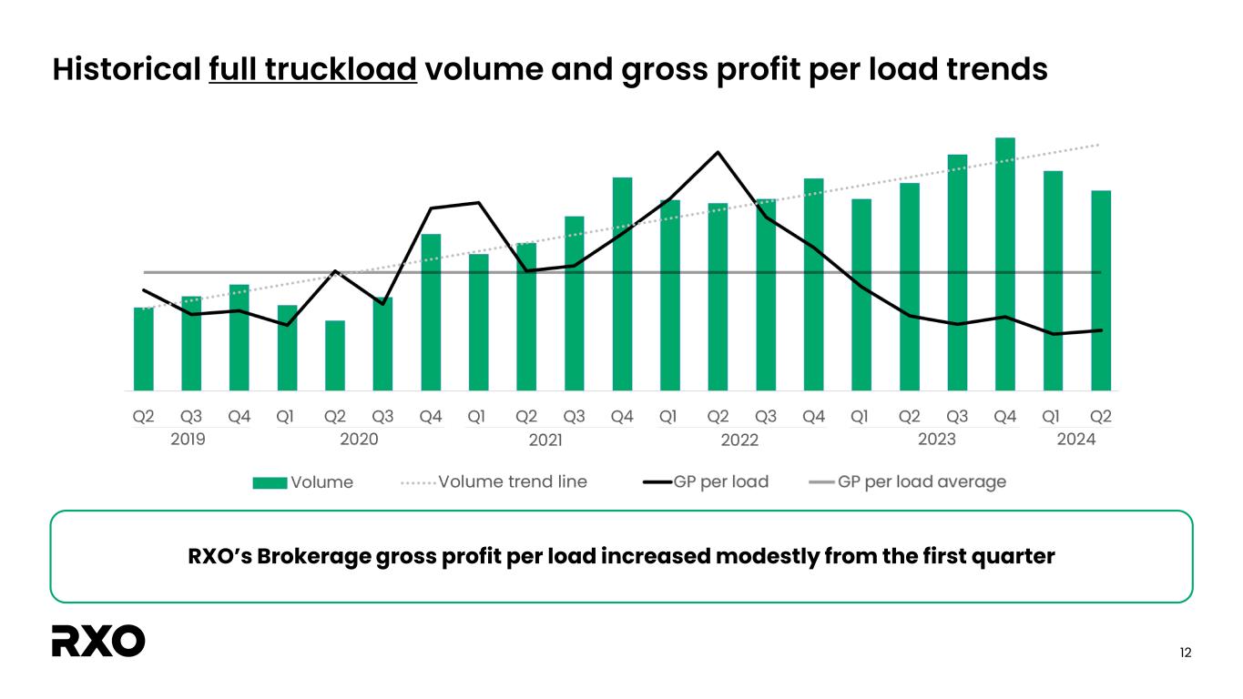 11 Q2 monthly Brokerage gross margin trends Bid season strategy resulted in solid gross margin for the quarter despite market tightening Seasonal market tightness as the quarter progressed • Roadcheck and produce season led to tighter market conditions • Load-to-truck ratio and industry-wide tender rejections moved higher • Limited spot opportunities • Ongoing excess TL capacity, but net carrier exits continued • Expect Brokerage gross margin to improve throughout the third quarter RXO-specific actions • Bid season strategy focused on reliably servicing customers and honoring rates while anticipating a recovery • Continue to procure capacity effectively, leveraging proprietary technology and pricing algorithms Monthly gross profit and margin trends