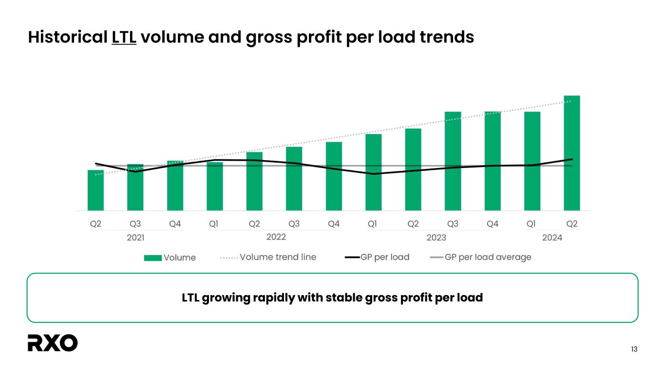 12 Historical full truckload volume and gross profit per load trends RXO’s Brokerage gross profit per load increased modestly from the first quarter