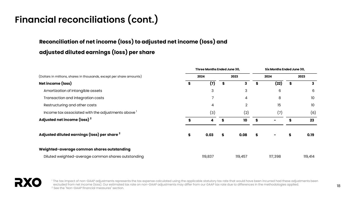 17 Financial reconciliations 1 See the “Non-GAAP financial measures” section. 2 Adjusted EBITDA margin is calculated as adjusted EBITDA divided by revenue. 3 Trailing twelve months ended June 30, 2024 is calculated as the six months ended June 30, 2024 plus the twelve months ended December 31, 2023 less the six months ended June 30, 2023. Reconciliation of net income (loss) to adjusted EBITDA and adjusted EBITDA margin Twelve Months Ended June 30, Year Ended December 31, (Dollars in millions) 2024 2023 2024 2023 2024 3 2023 Net income (loss) (7)$ 3$ (22)$ 3$ (21)$ 4$ Interest expense, net 8 8 16 16 32 32 Income tax provision (benefit) (1) 3 (7) - (7) - Depreciation and amortization expense 17 18 33 36 64 67 Transaction and integration costs 7 4 8 10 10 12 Restructuring and other costs 4 2 15 10 22 17 Adjusted EBITDA 1 28$ 38$ 43$ 75$ 100$ 132$ Revenue 930$ 963$ 1,843$ 1,973$ 3,797 3,927 Adjusted EBITDA margin 1, 2 3.0% 3.9% 2.3% 3.8% 2.6% 3.4% Three Months Ended June 30, Six Months Ended June 30,