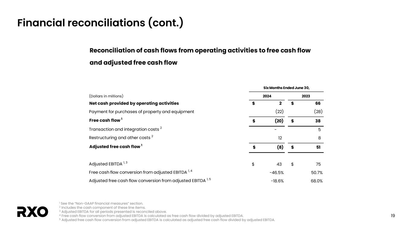 18 Financial reconciliations (cont.) 1 The tax impact of non-GAAP adjustments represents the tax expense calculated using the applicable statutory tax rate that would have been incurred had these adjustments been excluded from net income (loss). Our estimated tax rate on non-GAAP adjustments may differ from our GAAP tax rate due to differences in the methodologies applied. 2 See the "Non-GAAP financial measures" section. (Dollars in millions, shares in thousands, except per share amounts) 2024 2023 2024 2023 Net income (loss) (7)$ 3$ (22)$ 3$ Amortization of intangible assets 3 3 6 6 Transaction and integration costs 7 4 8 10 Restructuring and other costs 4 2 15 10 Income tax associated with the adjustments above 1 (3) (2) (7) (6) Adjusted net income (loss) 2 4$ 10$ -$ 23$ Adjusted diluted earnings (loss) per share 2 0.03$ 0.08$ -$ 0.19$ Weighted-average common shares outstanding Diluted weighted-average common shares outstanding 119,837 119,457 117,398 119,414 Reconciliation of net income (loss) to adjusted net income (loss) and adjusted diluted earnings (loss) per share Six Months Ended June 30,Three Months Ended June 30,