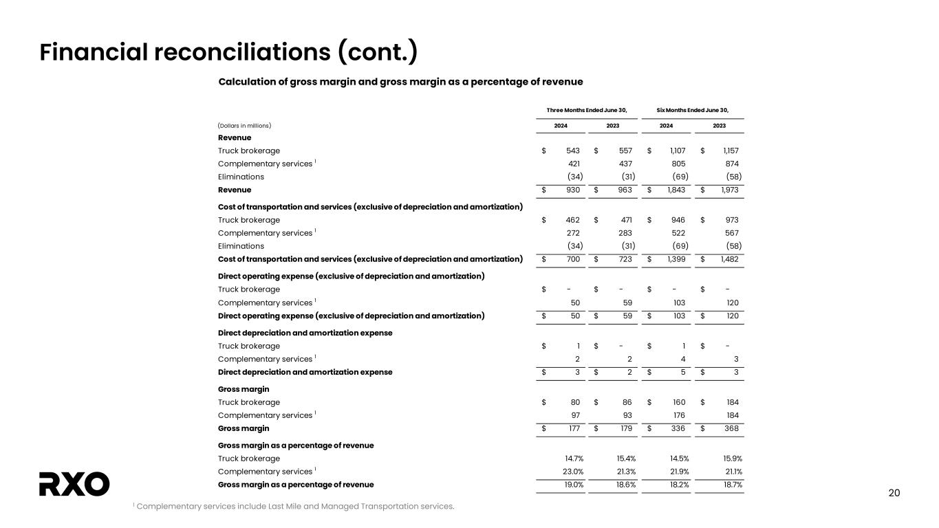 20 Financial reconciliations (cont.) 1 Complementary services include Last Mile and Managed Transportation services. Calculation of gross margin and gross margin as a percentage of revenue               (Dollars in millions)   2024   2023 2024   2023 Revenue               Truck brokerage   543$   557$ 1,107$   1,157$ Complementary services 1   421   437 805   874 Eliminations   (34)   (31) (69)   (58) Revenue   930$   963$ 1,843$   1,973$                 Cost of transportation and services (exclusive of depreciation and amortization)               Truck brokerage   462$   471$ 946$   973$ Complementary services 1   272   283 522   567 Eliminations   (34)   (31) (69)   (58) Cost of transportation and services (exclusive of depreciation and amortization)   700$   723$ 1,399$   1,482$                 Direct operating expense (exclusive of depreciation and amortization)               Truck brokerage   -$   -$ -$   -$ Complementary services 1   50   59 103   120 Direct operating expense (exclusive of depreciation and amortization)   50$   59$ 103$   120$ Direct depreciation and amortization expense Truck brokerage 1$ -$ 1$ -$ Complementary services 1 2 2 4 3 Direct depreciation and amortization expense   3$ 2$ 5$ 3$ Gross margin               Truck brokerage   80$ 86$ 160$ 184$ Complementary services 1   97 93 176 184 Gross margin   177$   179$ 336$   368$                 Gross margin as a percentage of revenue               Truck brokerage   14.7%   15.4% 14.5%   15.9% Complementary services 1   23.0%   21.3% 21.9%   21.1% Gross margin as a percentage of revenue   19.0%   18.6% 18.2%   18.7% Three Months Ended June 30, Six Months Ended June 30,